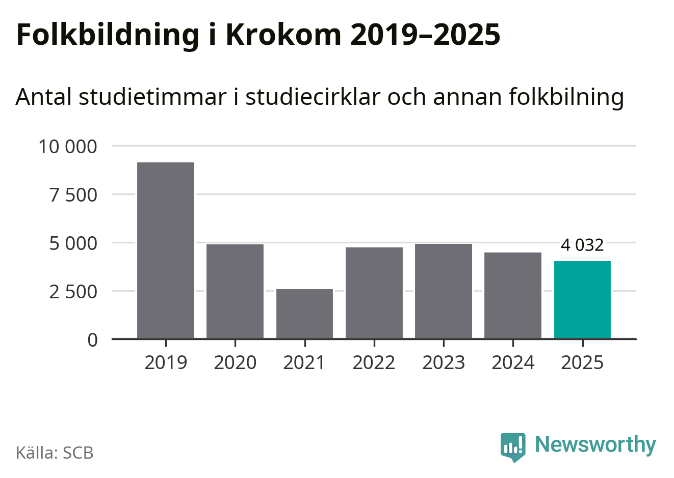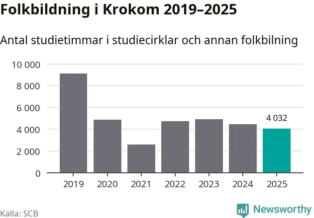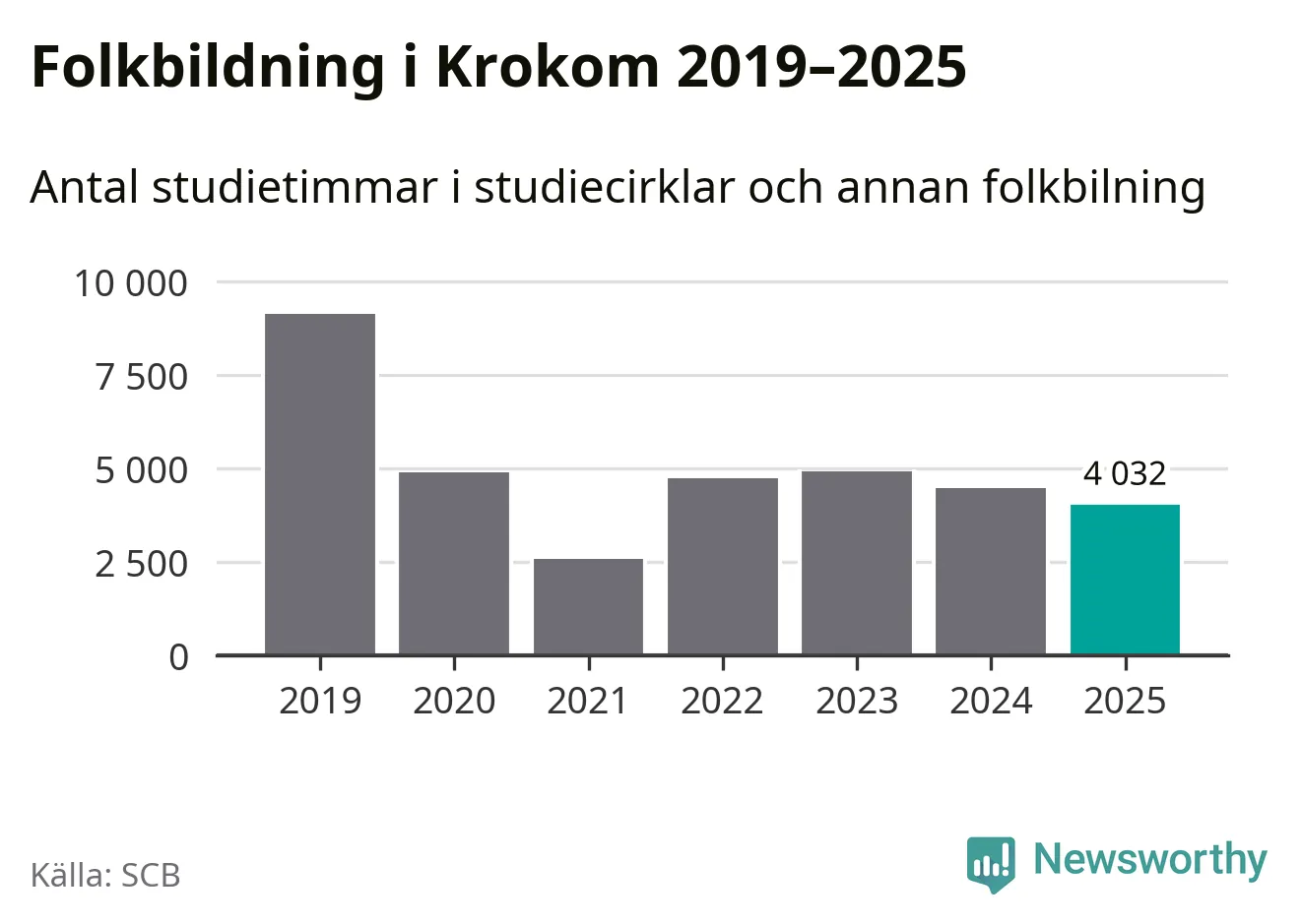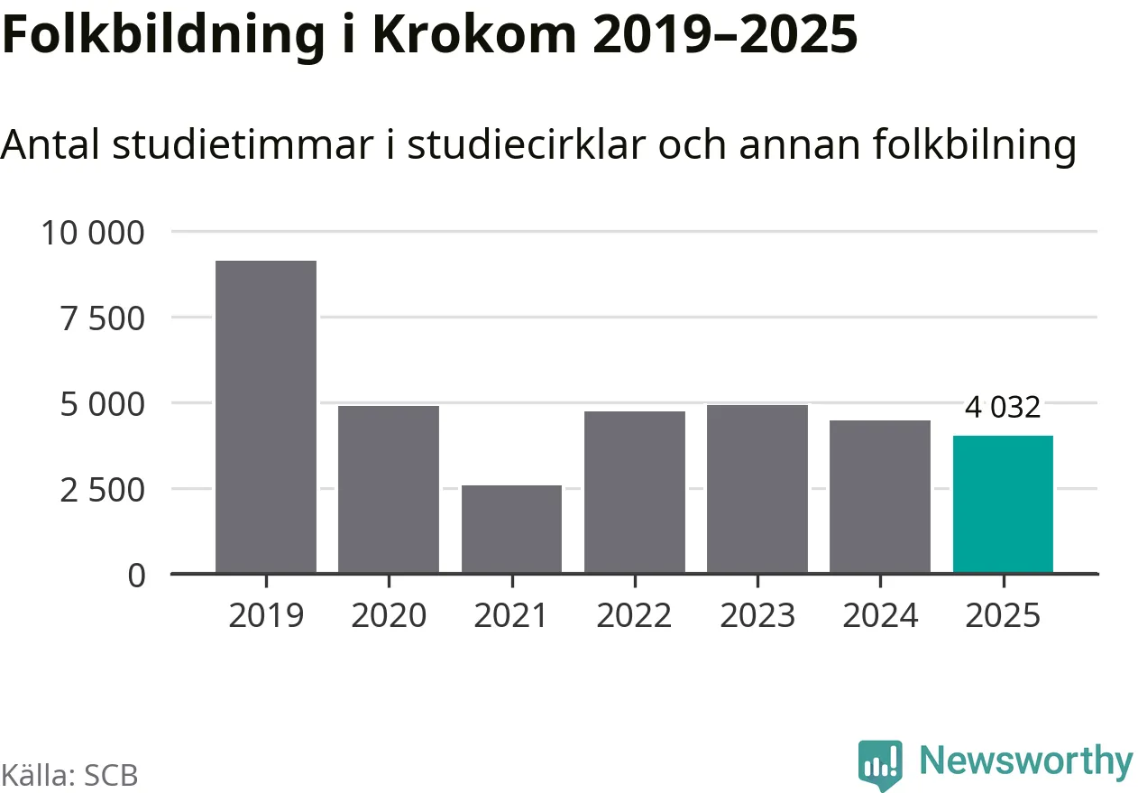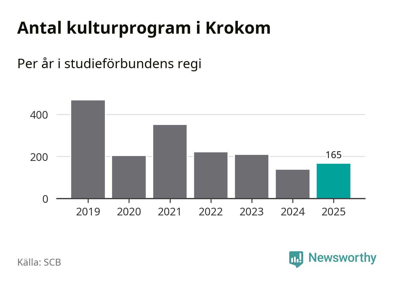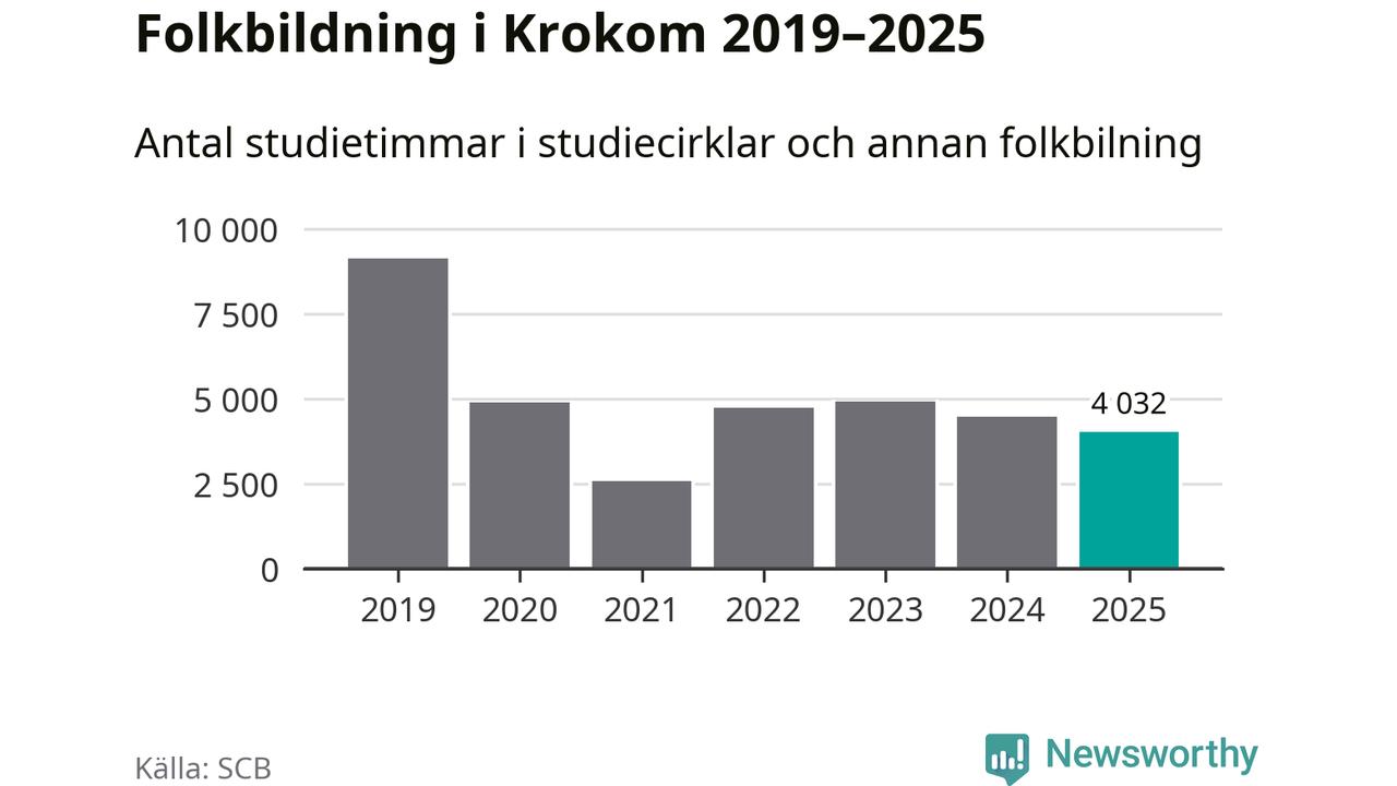 Studieförbunden drabbades hårt av pandemin. Även i Krokom noterades det lägsta antalet studietimmar under 2021, som då var 72 procent färre än 2019. År 2024 var antalet studietimmar åter högre men de var fortfarande långt från förpandeminivåerna.