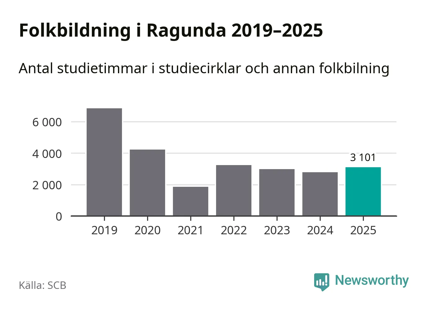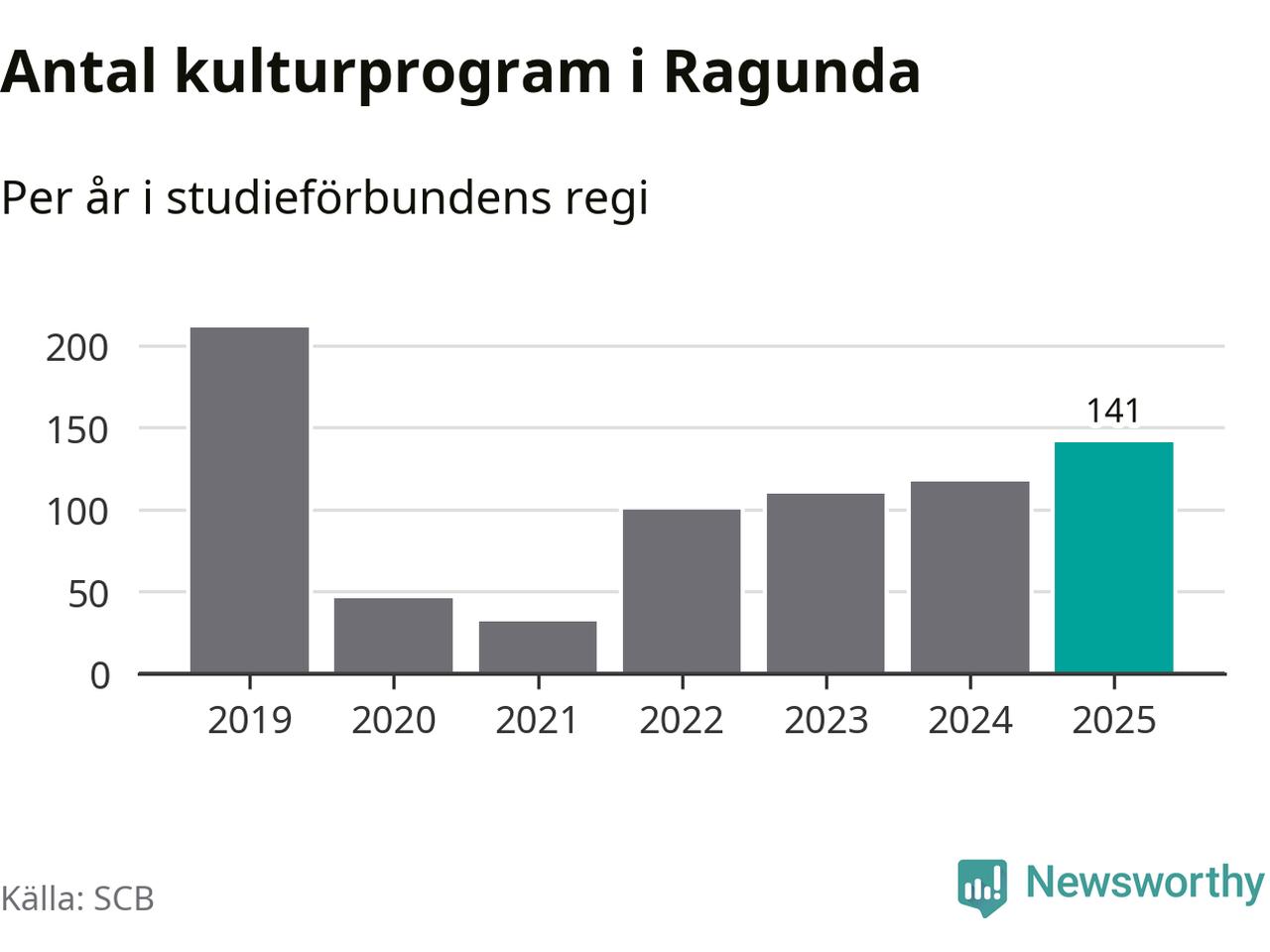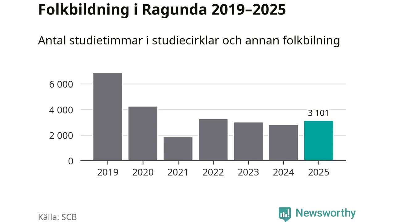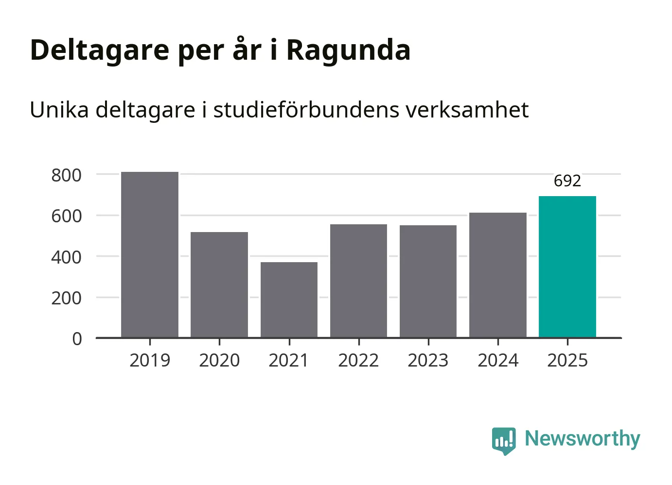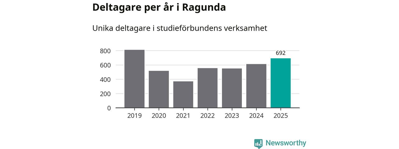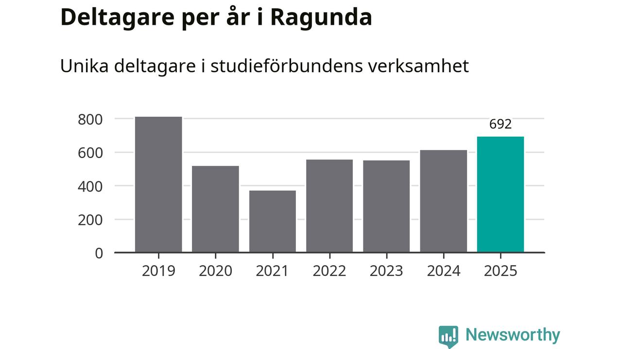 Sju av de studieförbund som 2025 fick bidrag från Folkbildningsrådet har haft någon form av verksamhet – antingen studiecirkel, annan folkbildning eller kulturprogram – i Ragunda under de två senaste åren. Under 2025 ökade fyra förbund antalet studietimmar i kommunen jämfört med året innan, medan Studiefrämjandet noterade färre timmar.