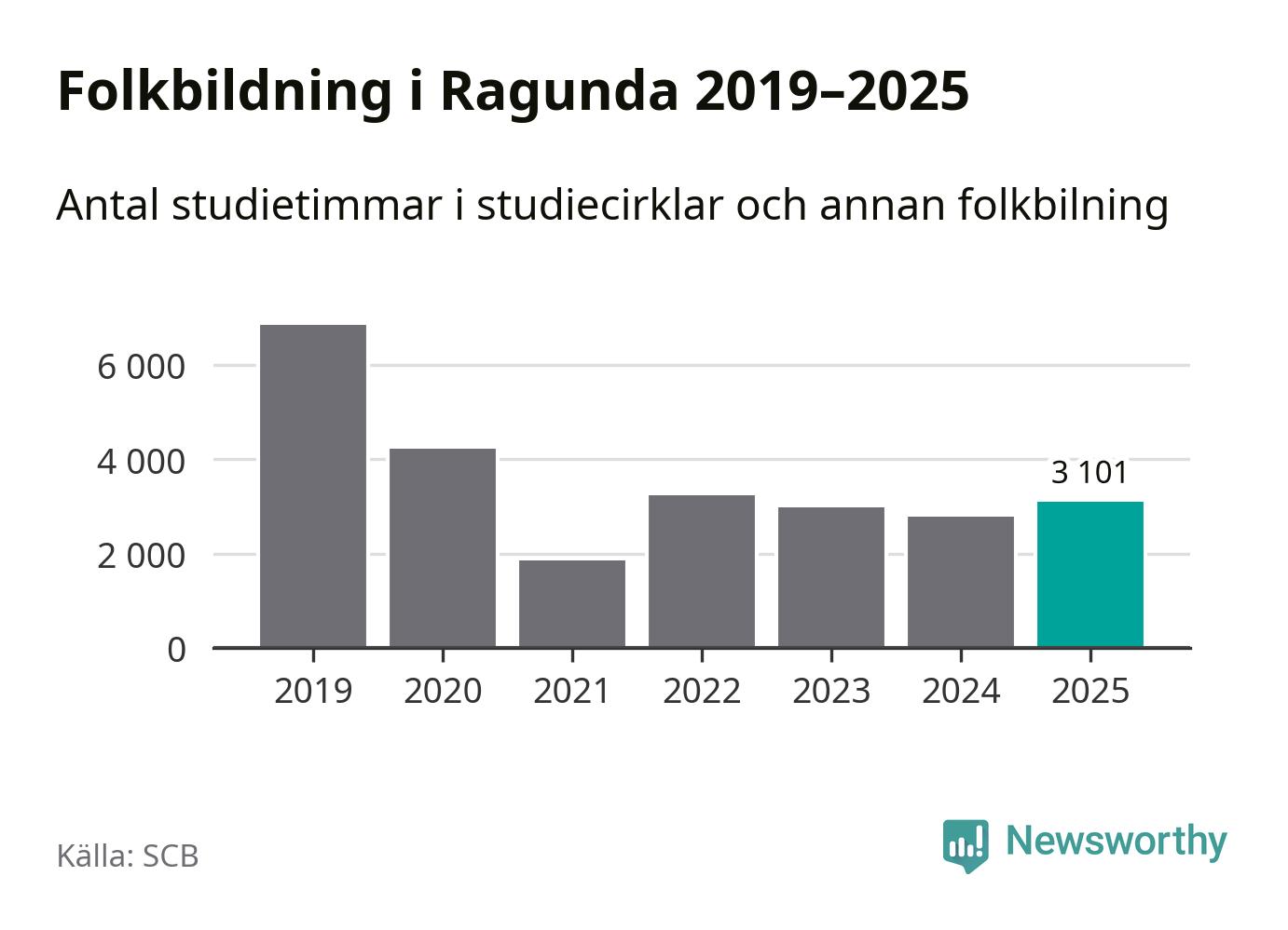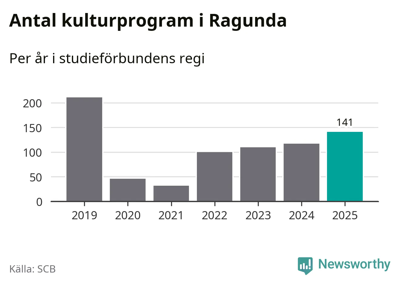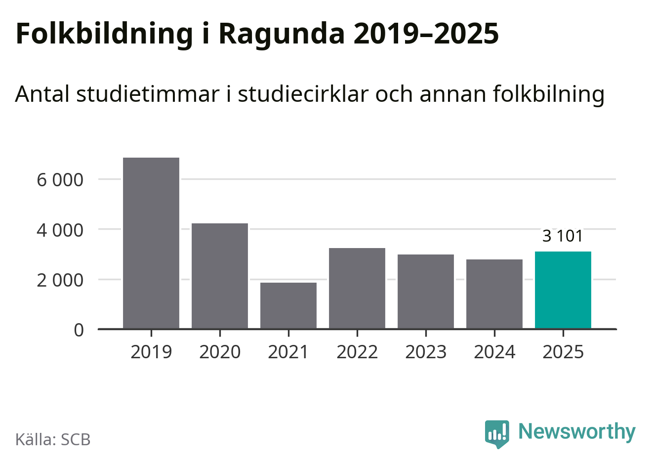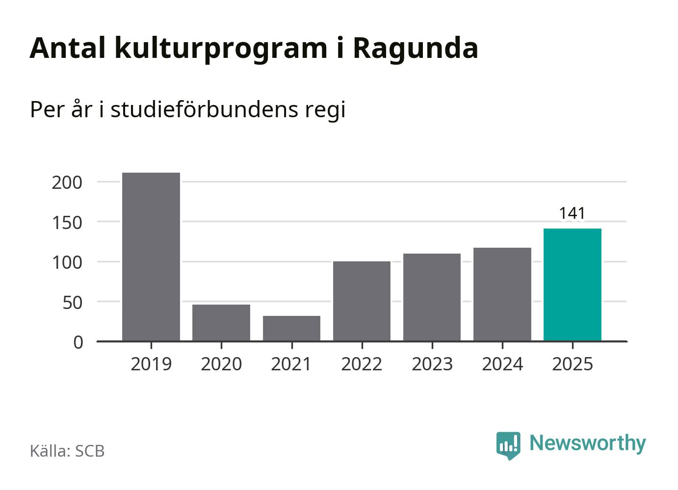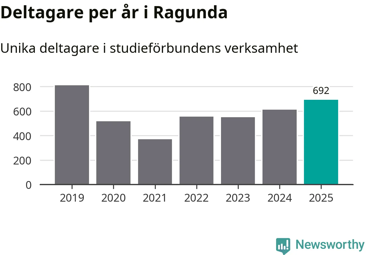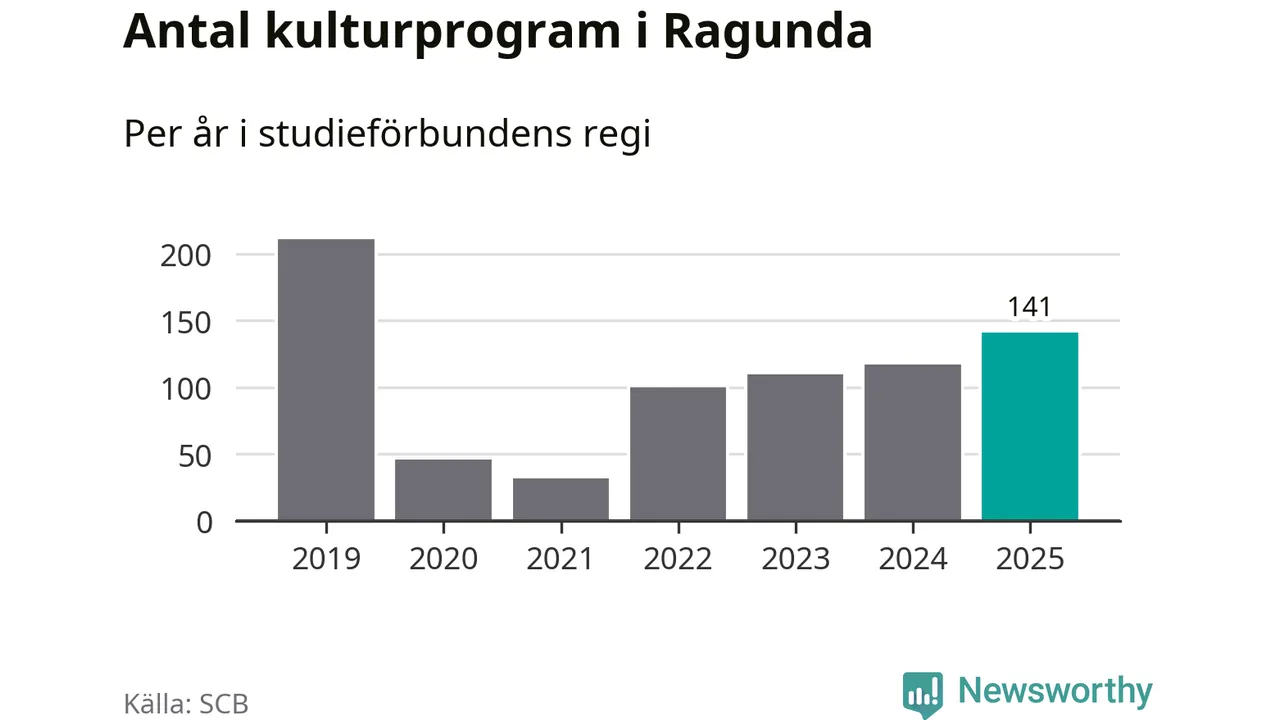Sju av de studieförbund som 2025 fick bidrag från Folkbildningsrådet har haft någon form av verksamhet – antingen studiecirkel, annan folkbildning eller kulturprogram – i Ragunda under de två senaste åren. Under 2025 ökade fyra förbund antalet studietimmar i kommunen jämfört med året innan, medan Studiefrämjandet noterade färre timmar.