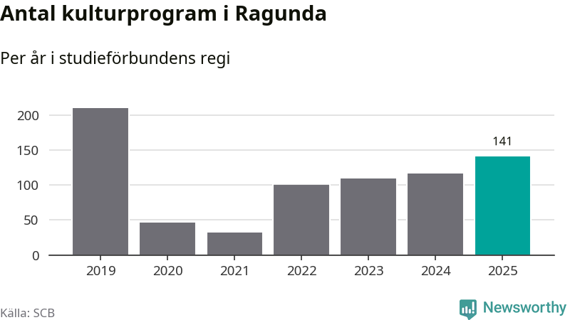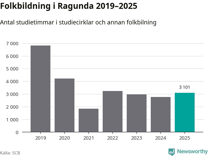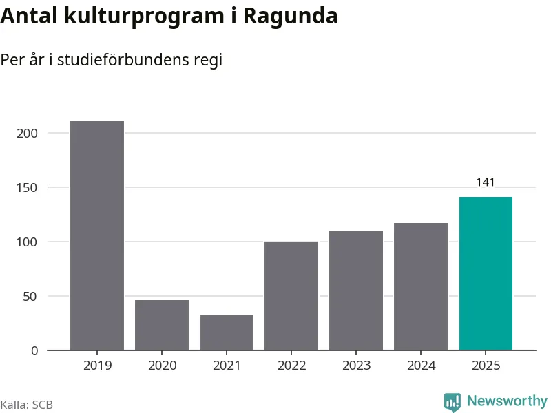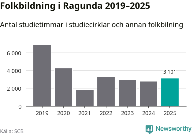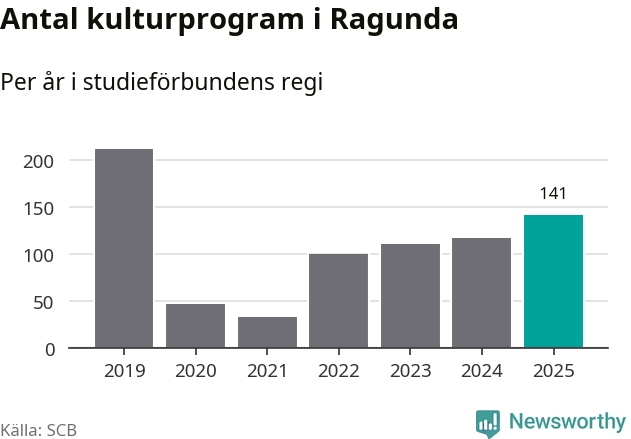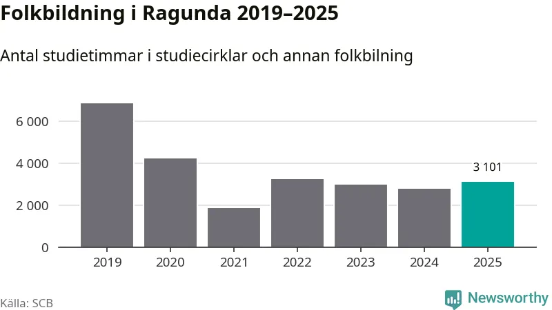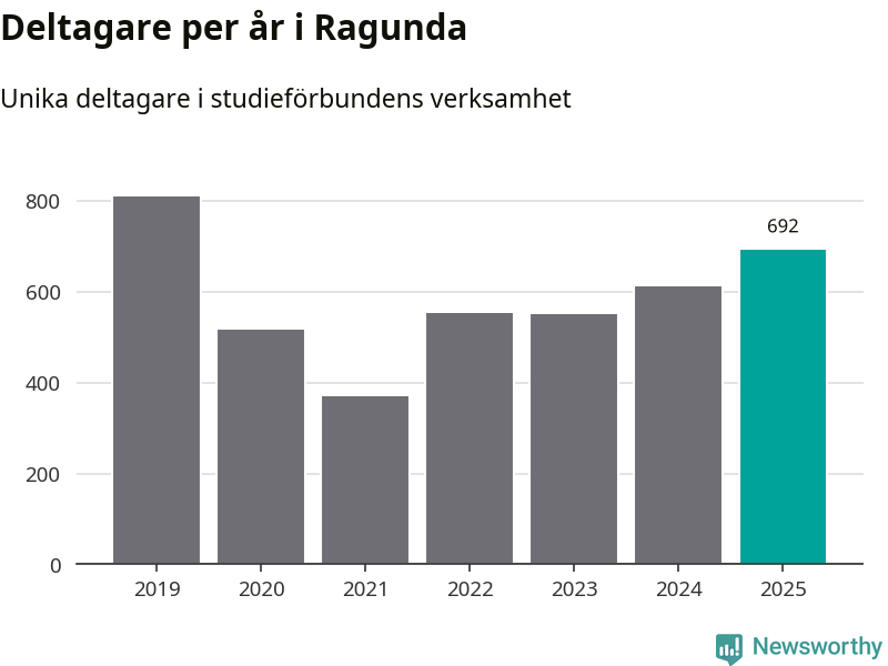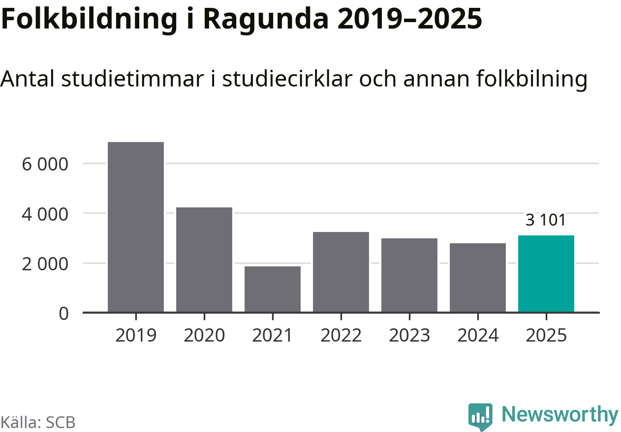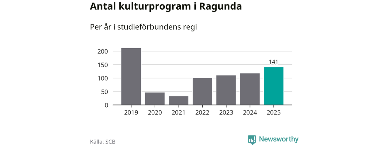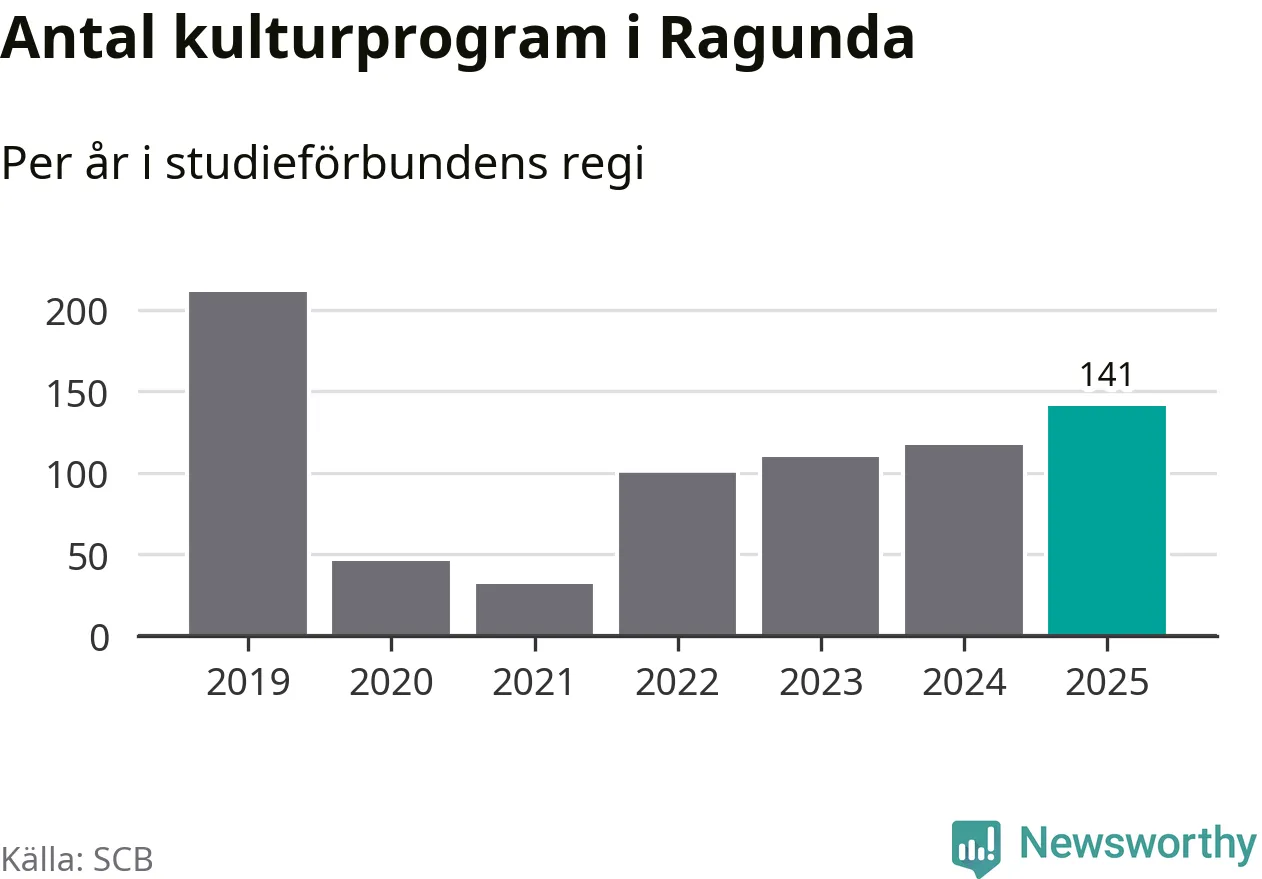 Sju av de studieförbund som 2025 fick bidrag från Folkbildningsrådet har haft någon form av verksamhet – antingen studiecirkel, annan folkbildning eller kulturprogram – i Ragunda under de två senaste åren. Under 2025 ökade fyra förbund antalet studietimmar i kommunen jämfört med året innan, medan Studiefrämjandet noterade färre timmar.