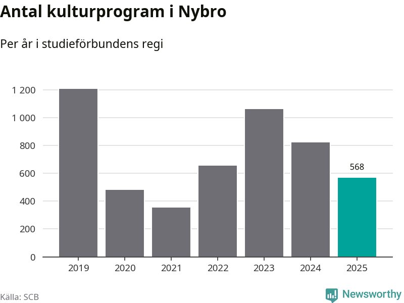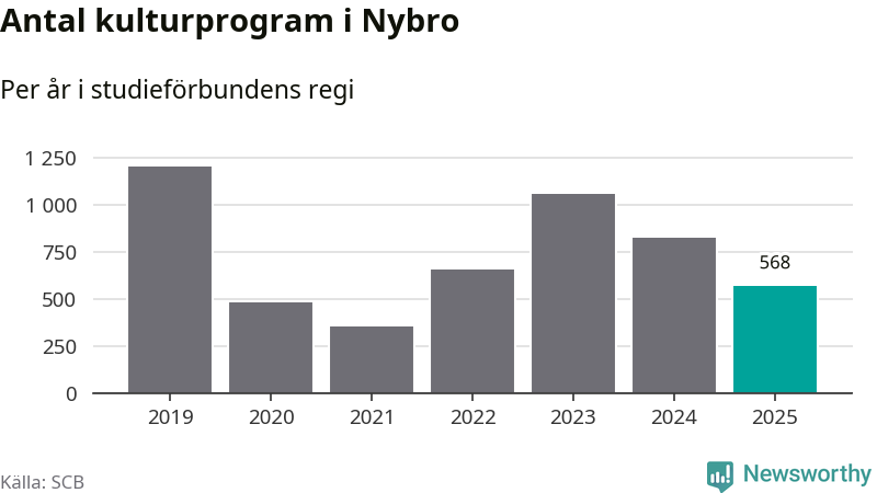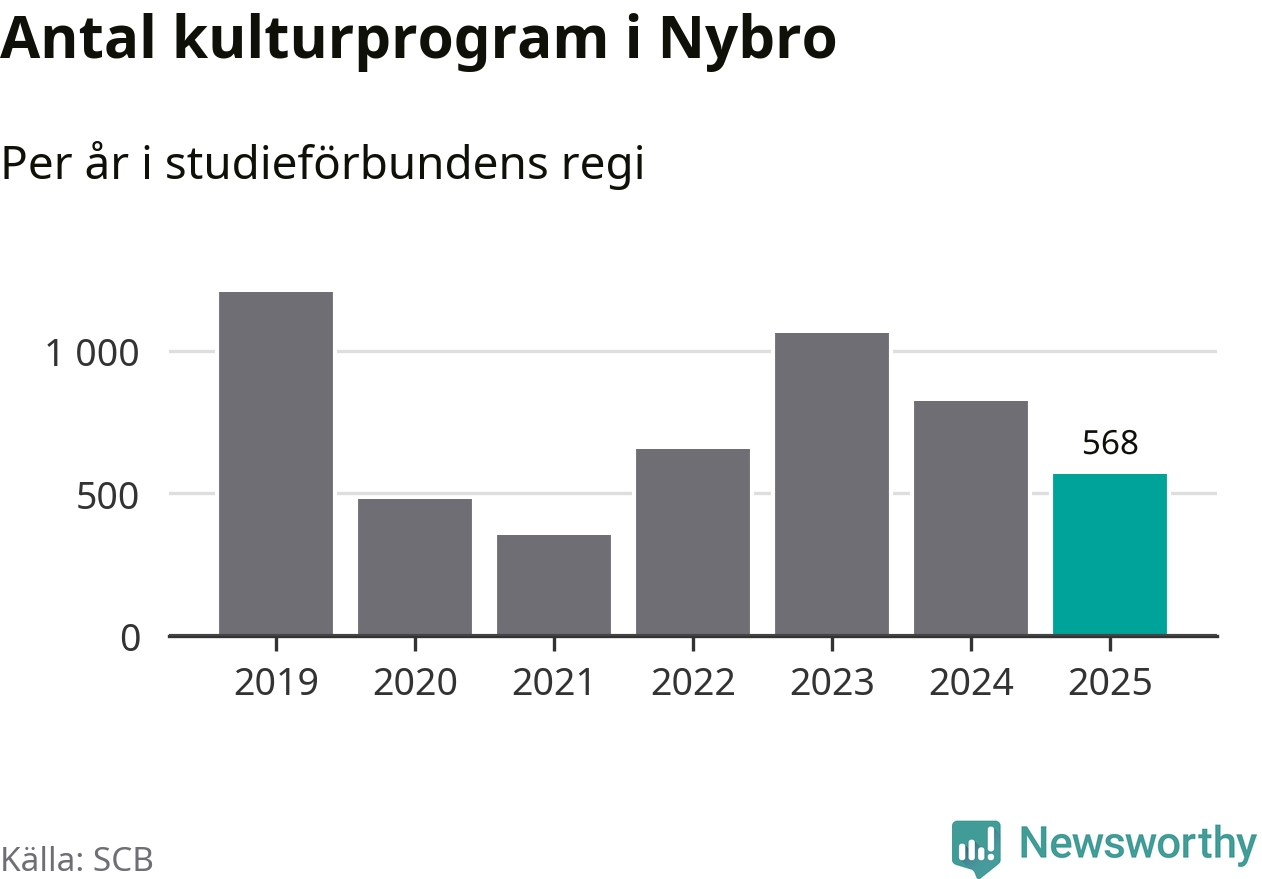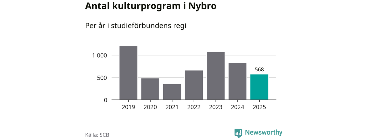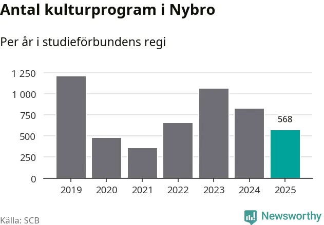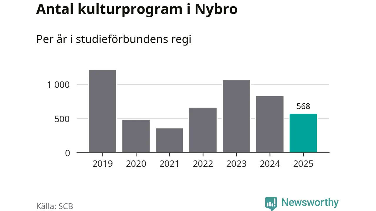 Utvecklingen ser ungefär likadan ut i Nybro, förra året hade studieförbunden omkring 13 700 studietimmar i kommunen jämfört med omkring 14 900 året innan, en minskning med åtta procent. Även antalet kulturprogram i studieförbundens regi minskade, från 824 till 568 stycken.