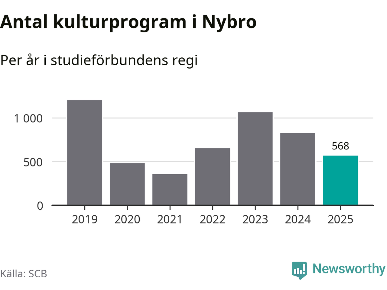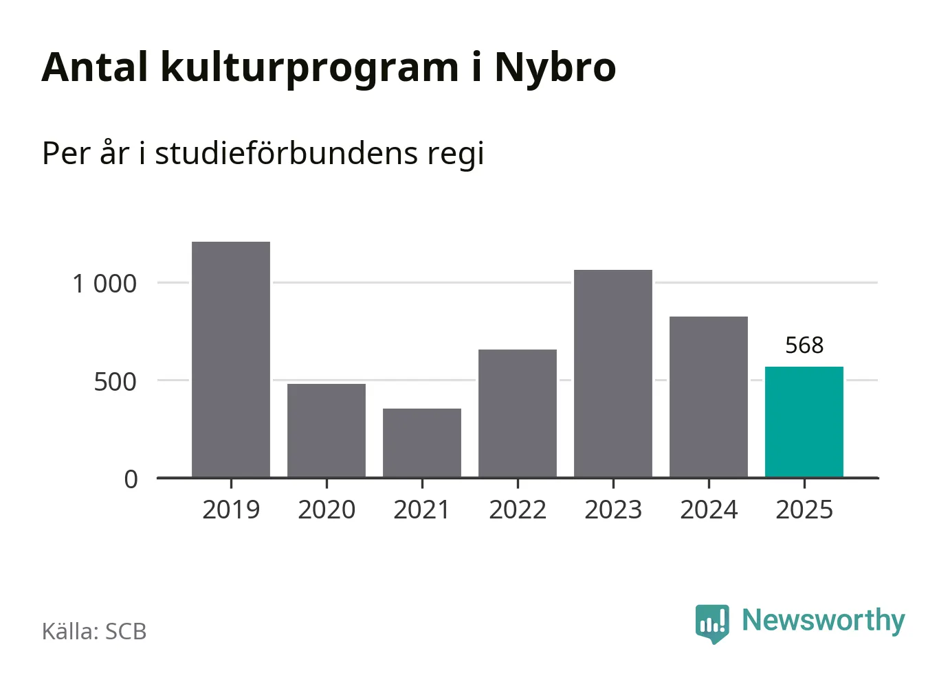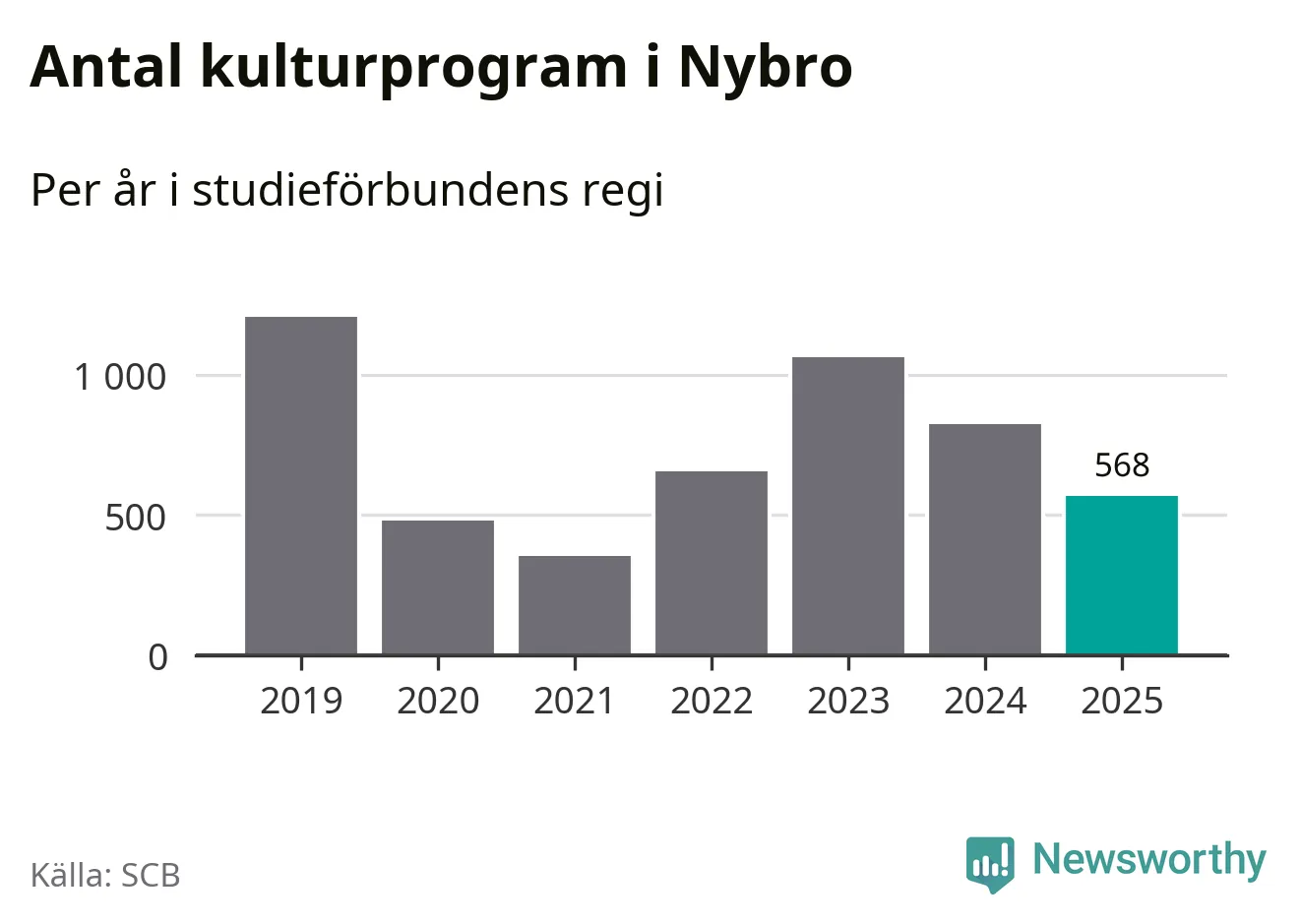 Utvecklingen ser ungefär likadan ut i Nybro, förra året hade studieförbunden omkring 13 700 studietimmar i kommunen jämfört med omkring 14 900 året innan, en minskning med åtta procent. Även antalet kulturprogram i studieförbundens regi minskade, från 824 till 568 stycken.