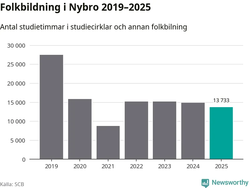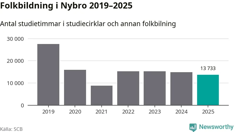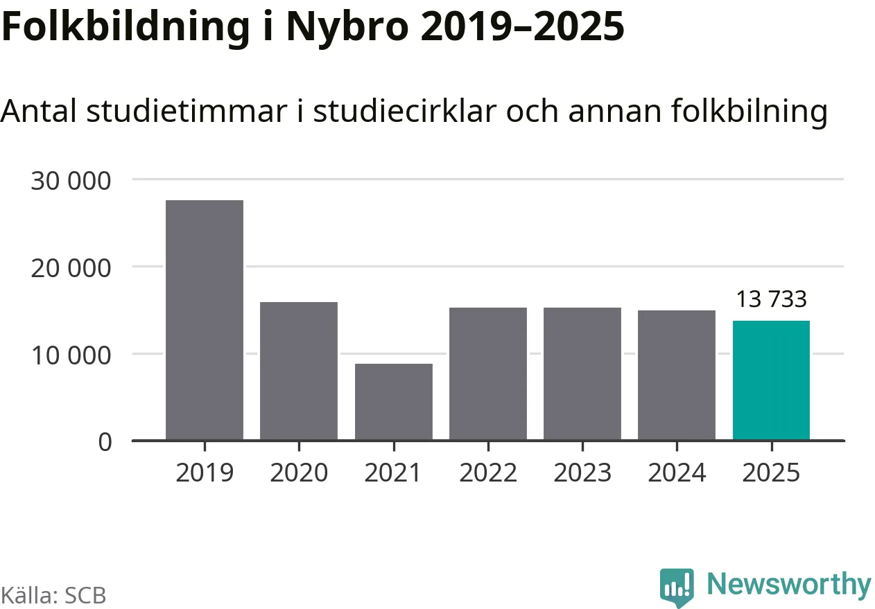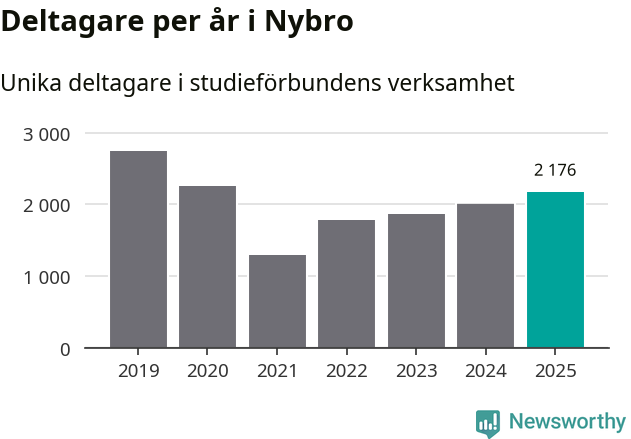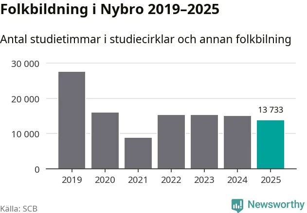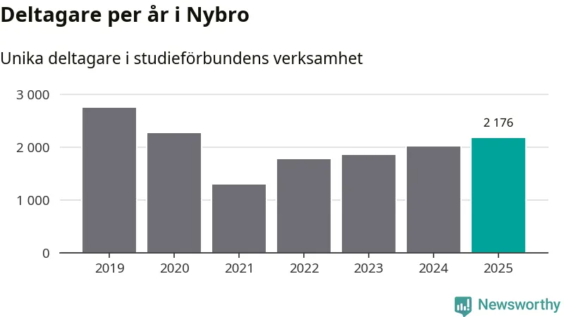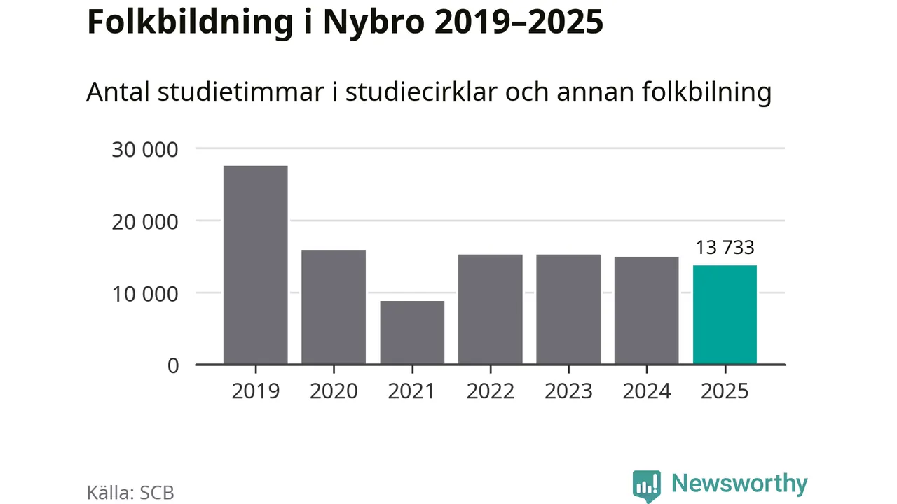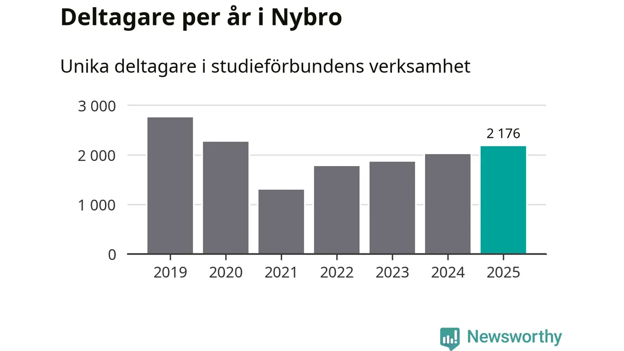 Studieförbunden drabbades hårt av pandemin. Även i Nybro noterades det lägsta antalet studietimmar under 2021, som då var 68 procent färre än 2019. År 2024 var antalet studietimmar åter högre men de var fortfarande långt från förpandeminivåerna.