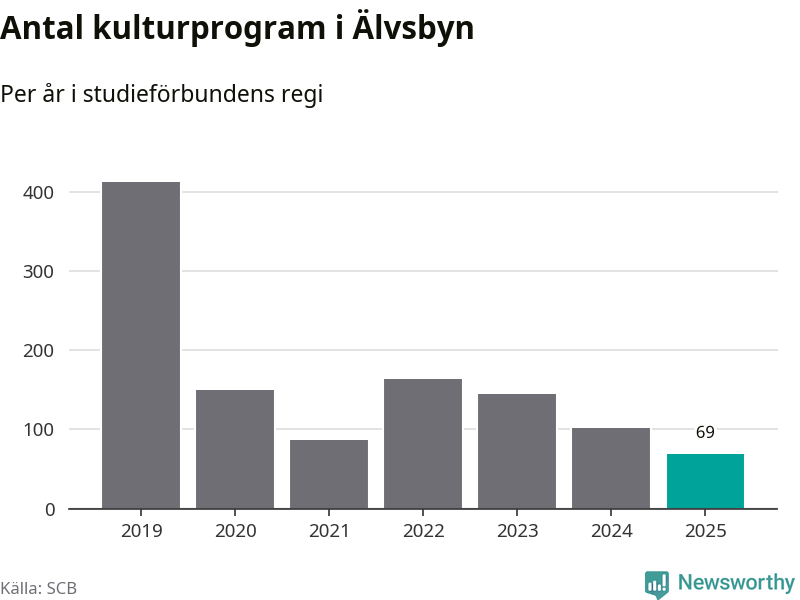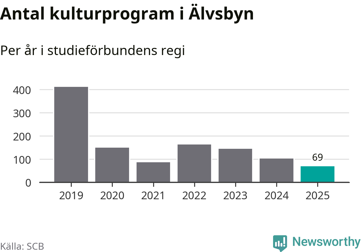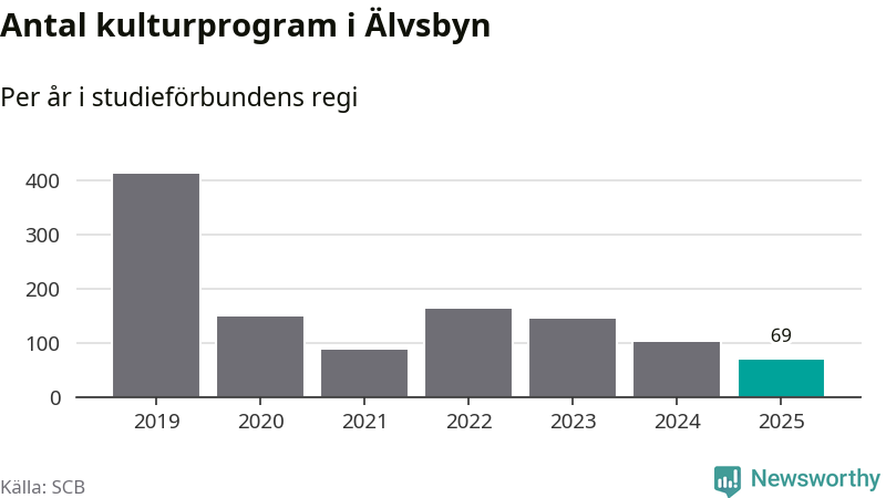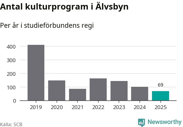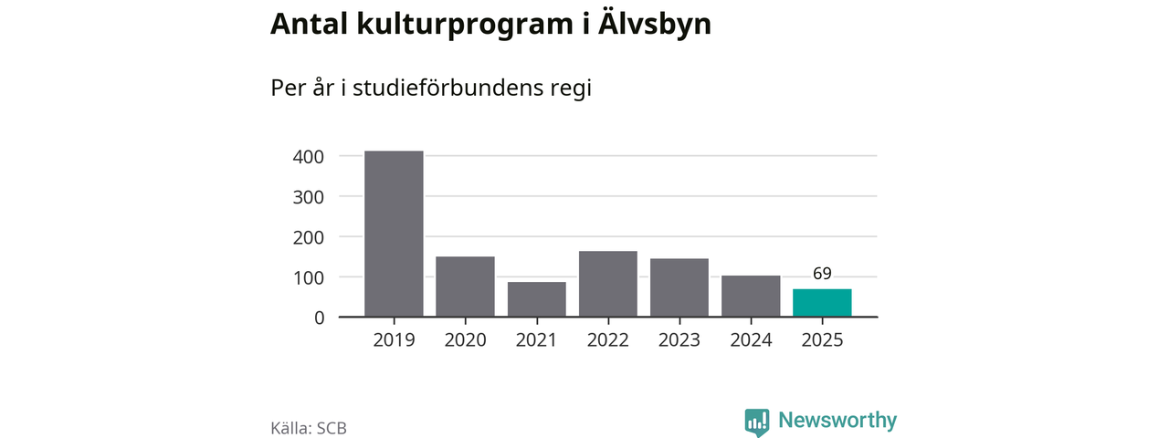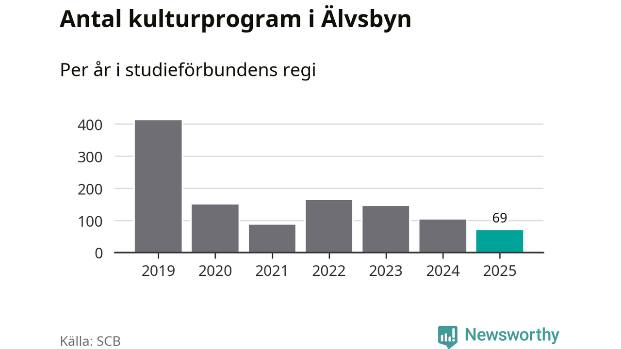 Utvecklingen ser ungefär likadan ut i Älvsbyn, förra året hade studieförbunden omkring 2 500 studietimmar i kommunen jämfört med omkring 2 600 året innan, en minskning med fem procent. Även antalet kulturprogram i studieförbundens regi minskade, från 102 till 69 stycken.