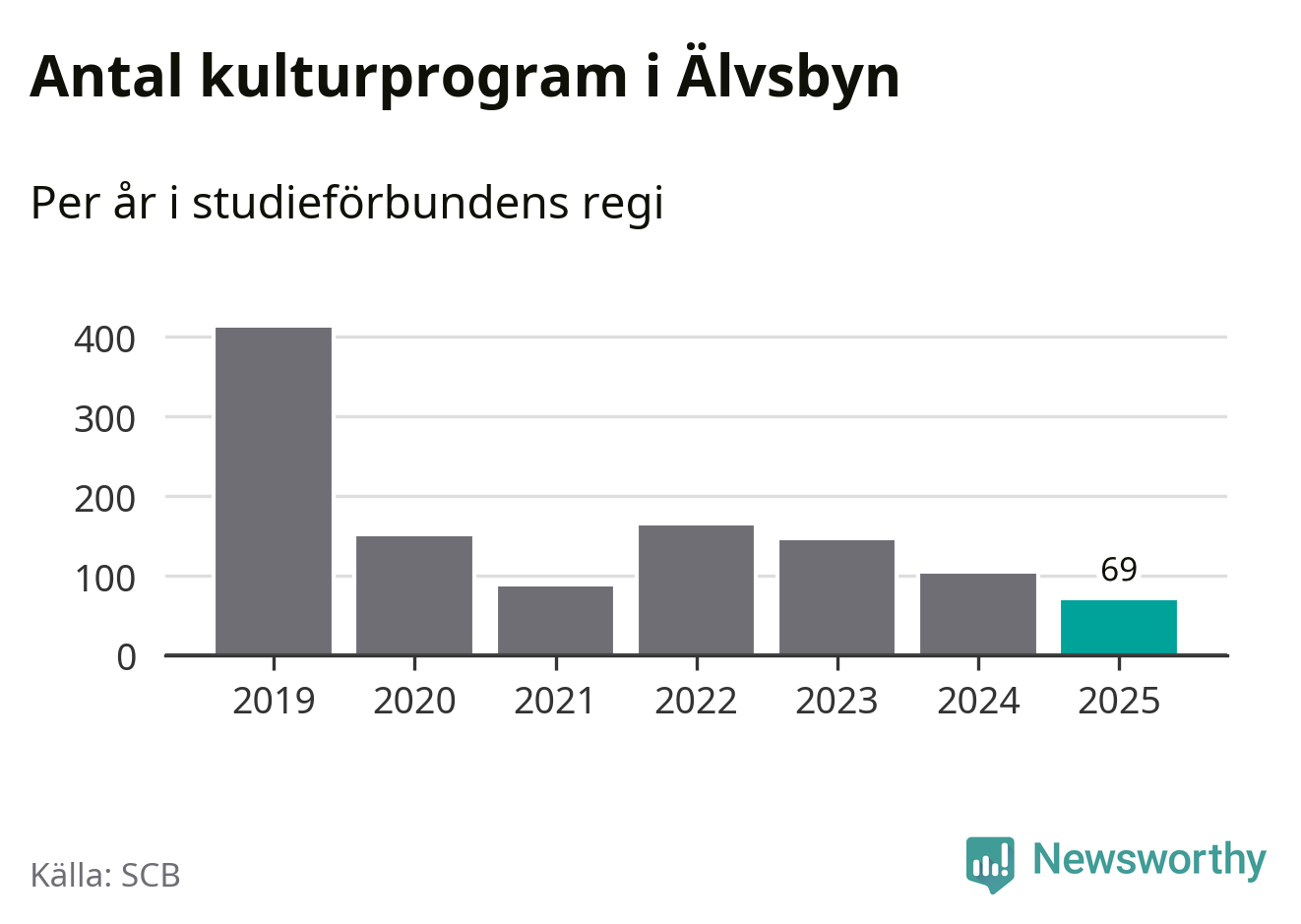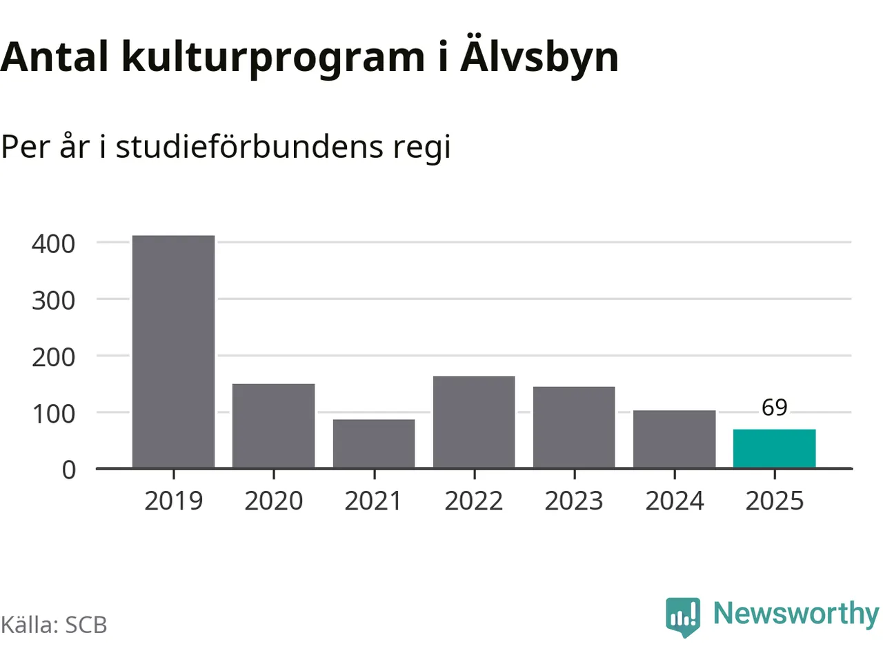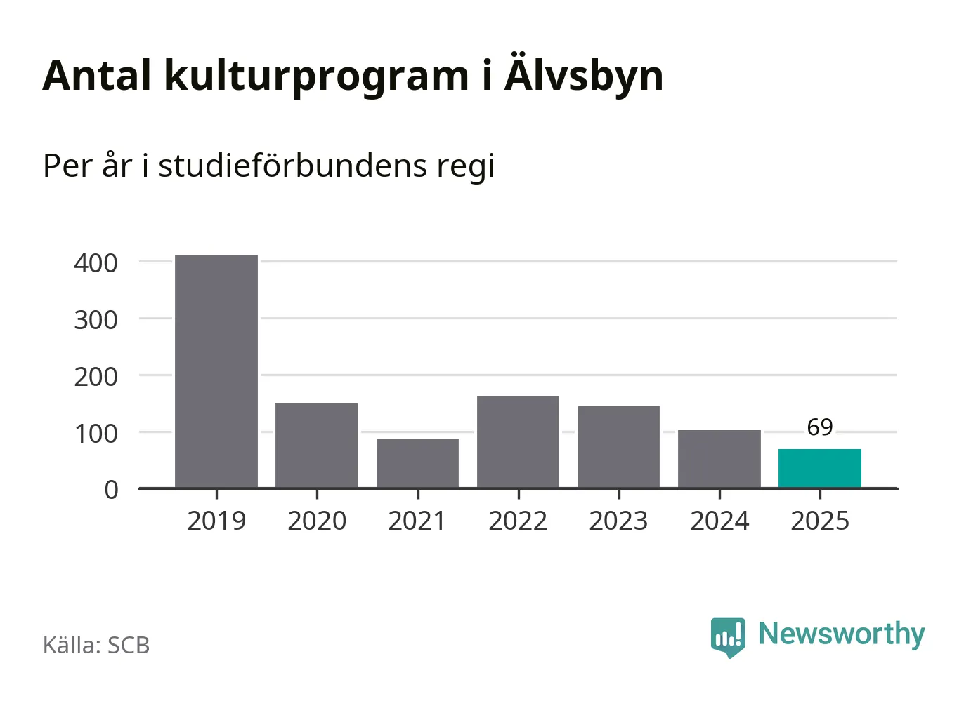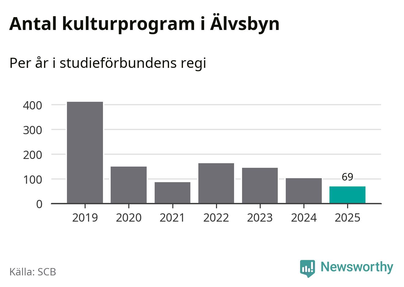 Utvecklingen ser ungefär likadan ut i Älvsbyn, förra året hade studieförbunden omkring 2 500 studietimmar i kommunen jämfört med omkring 2 600 året innan, en minskning med fem procent. Även antalet kulturprogram i studieförbundens regi minskade, från 102 till 69 stycken.