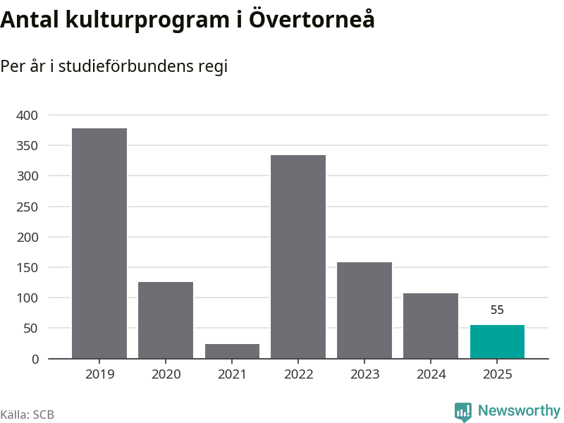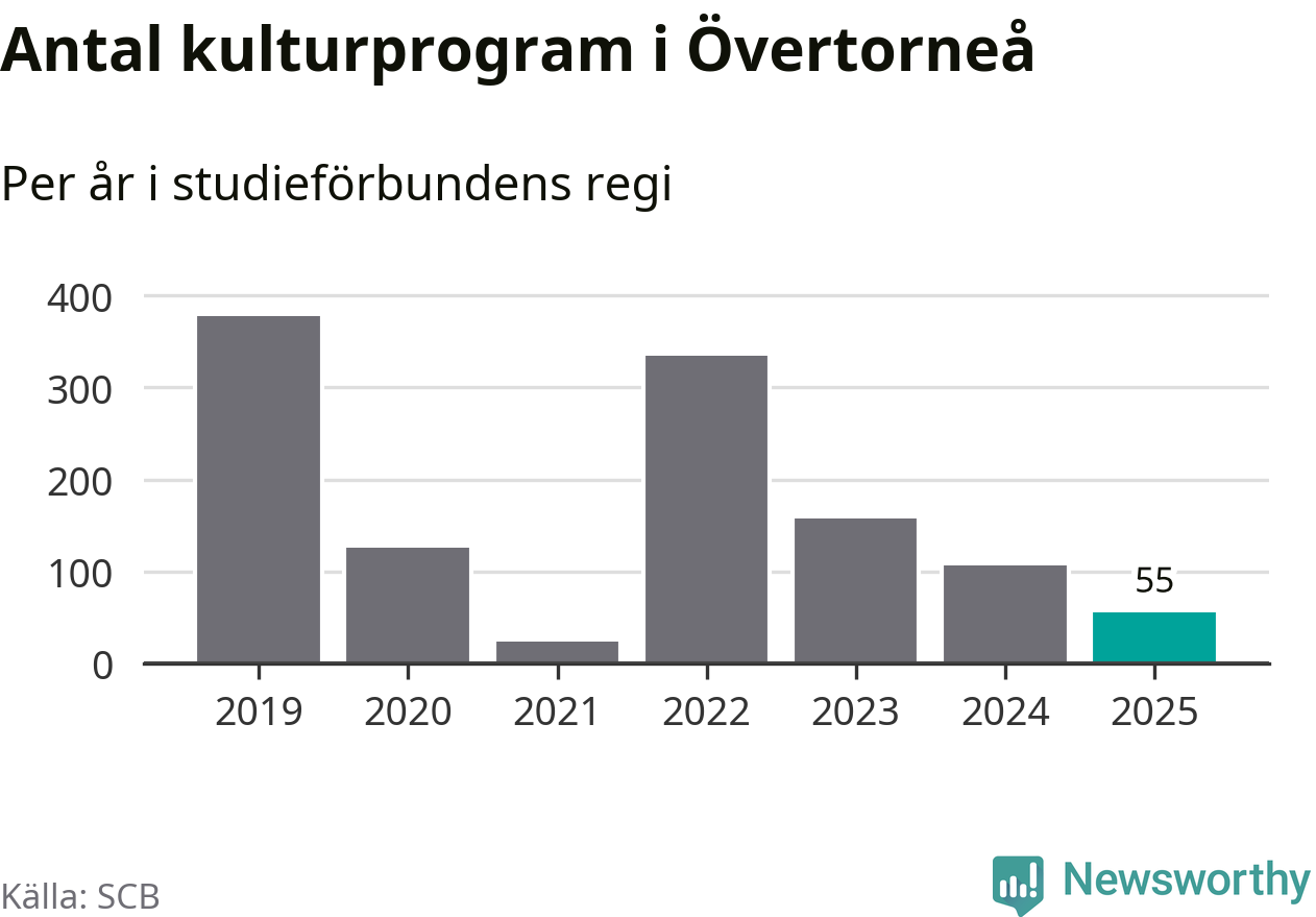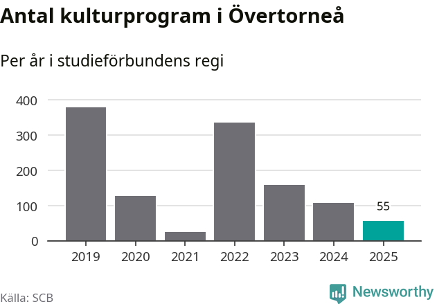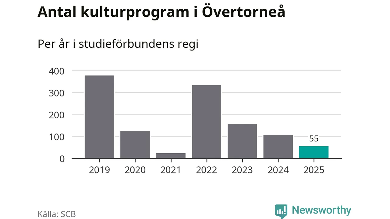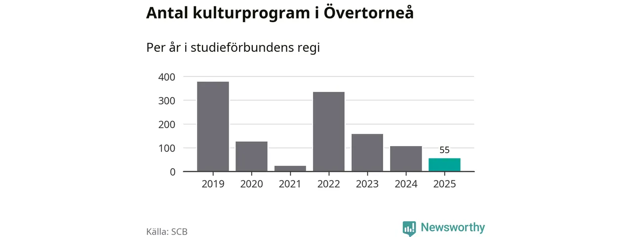 I Övertorneå är minskningen ännu större: förra året hade studieförbunden omkring 1 200 studietimmar i kommunen, vilket är en minskning med tolv procent jämfört med året innan. Även antalet kulturprogram i studieförbundens regi minskade, från 107 till 55 stycken.