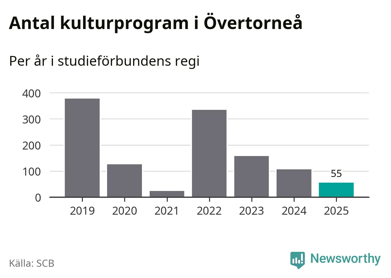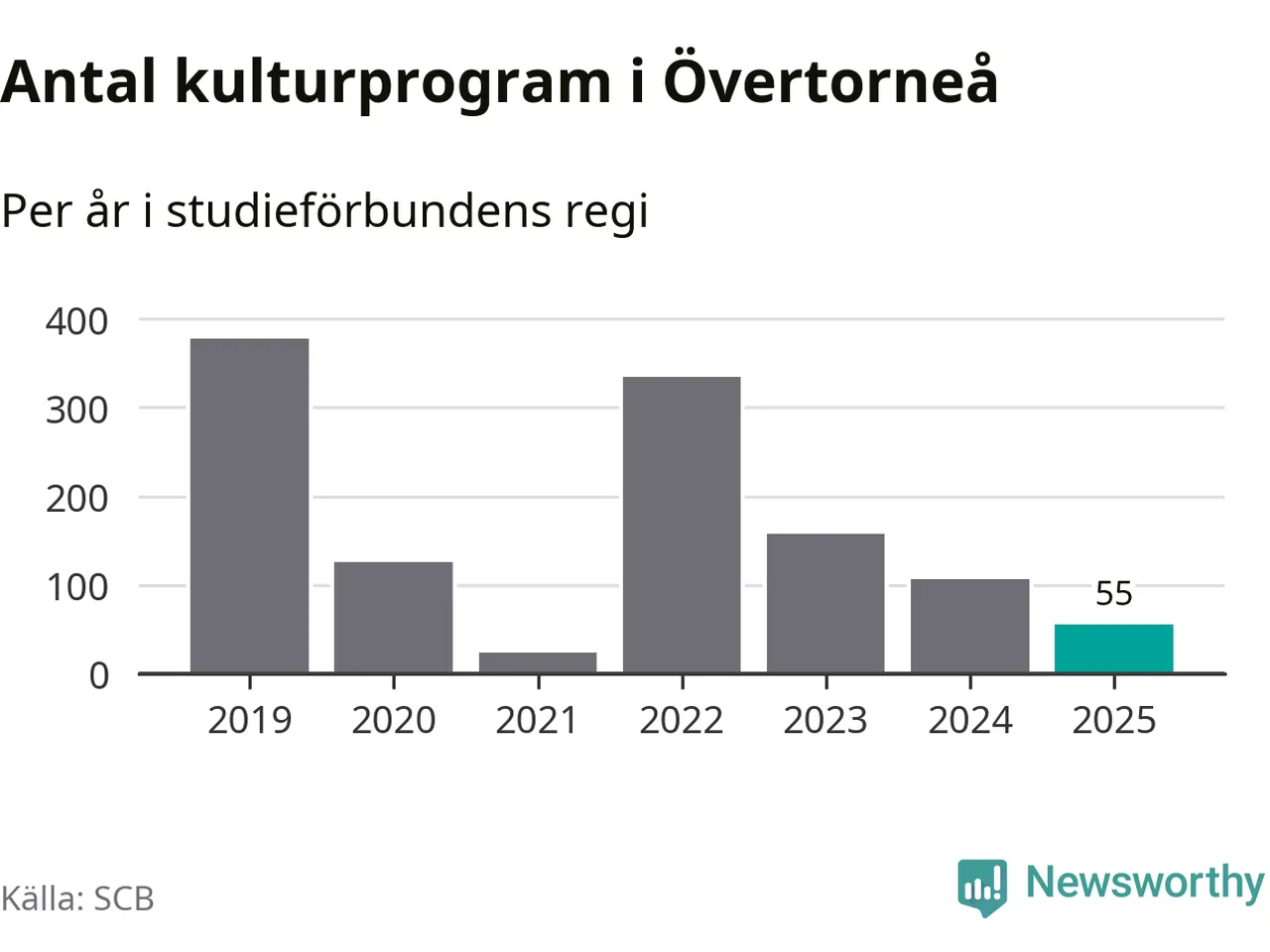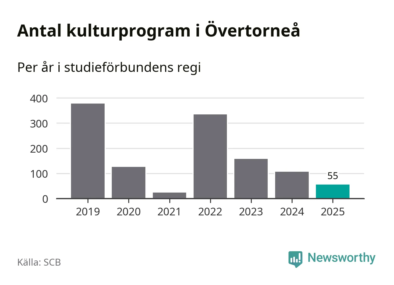 I Övertorneå är minskningen ännu större: förra året hade studieförbunden omkring 1 200 studietimmar i kommunen, vilket är en minskning med tolv procent jämfört med året innan. Även antalet kulturprogram i studieförbundens regi minskade, från 107 till 55 stycken.