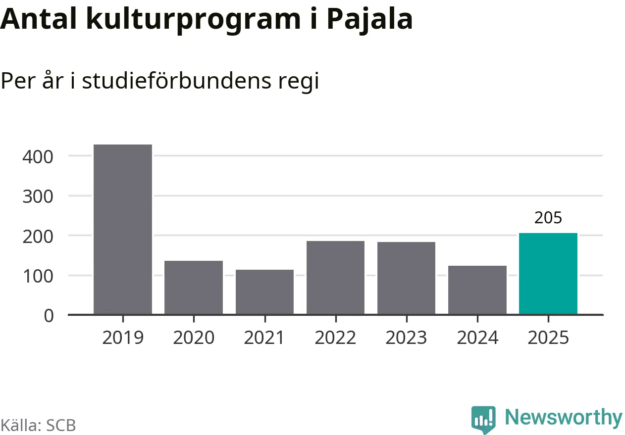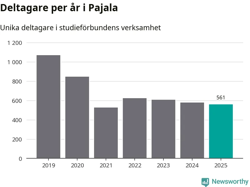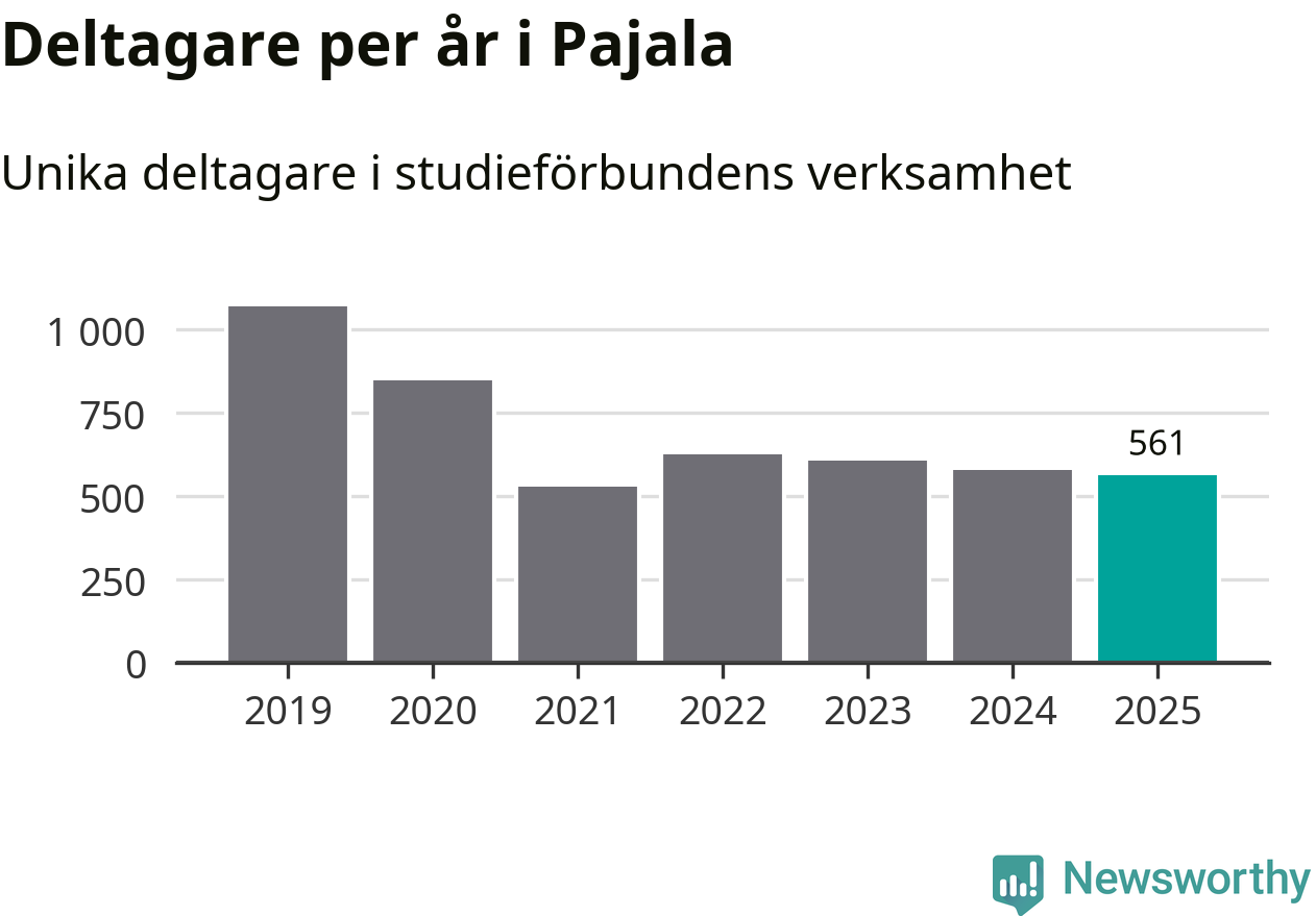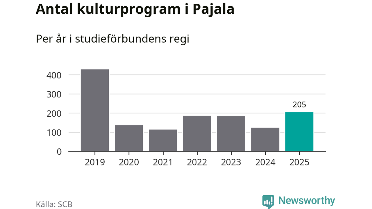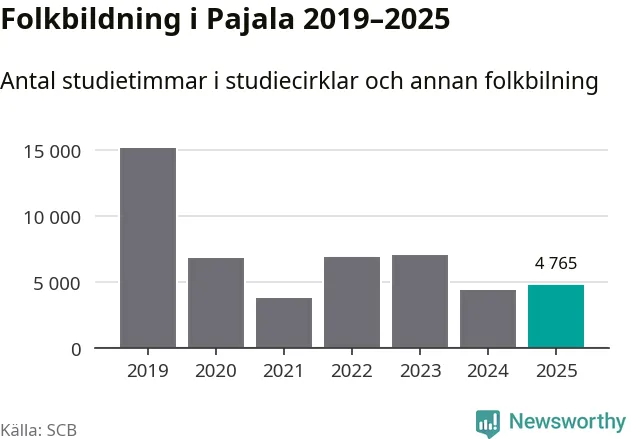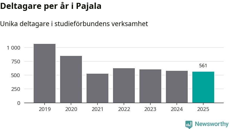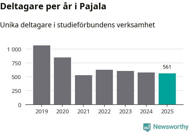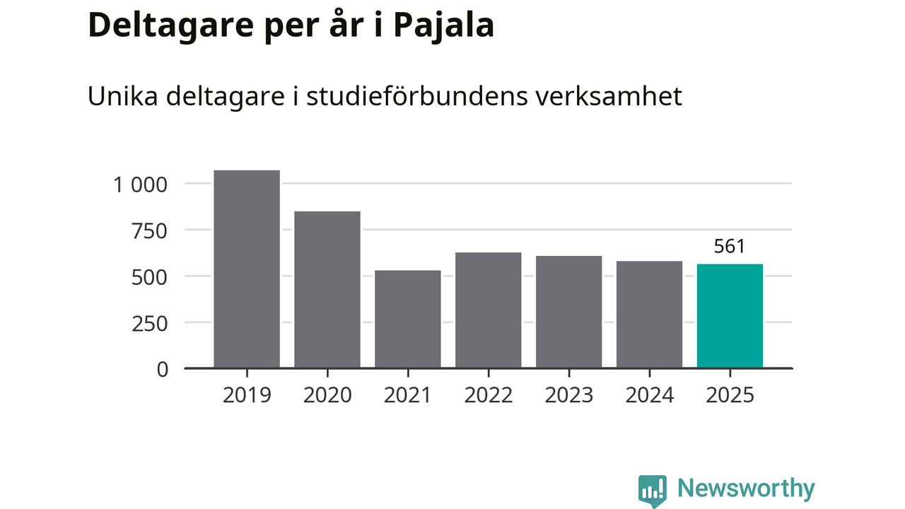 Sett till unika deltagare är folkbildningen på tillbakagång i Pajala. 2025 deltog 561 personer i studieförbundens verksamhet, vilket är en minskning med tre procent jämfört med året innan. Det innebär att var tionde invånare i kommunen deltog i studieförbundens verksamhet under 2025. Det är den näst högsta andelen i Norrbotten.