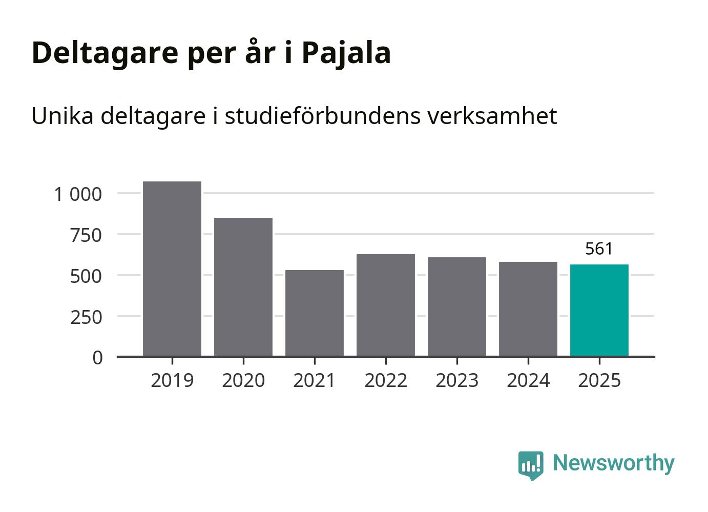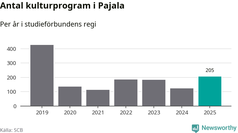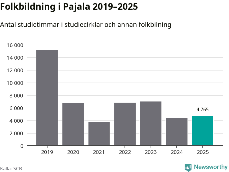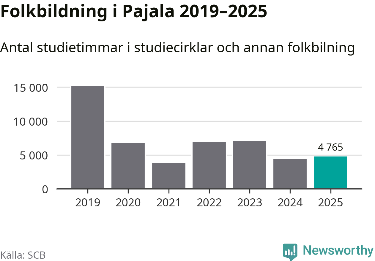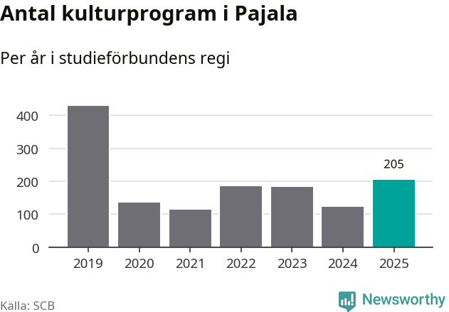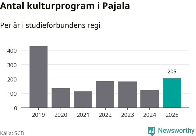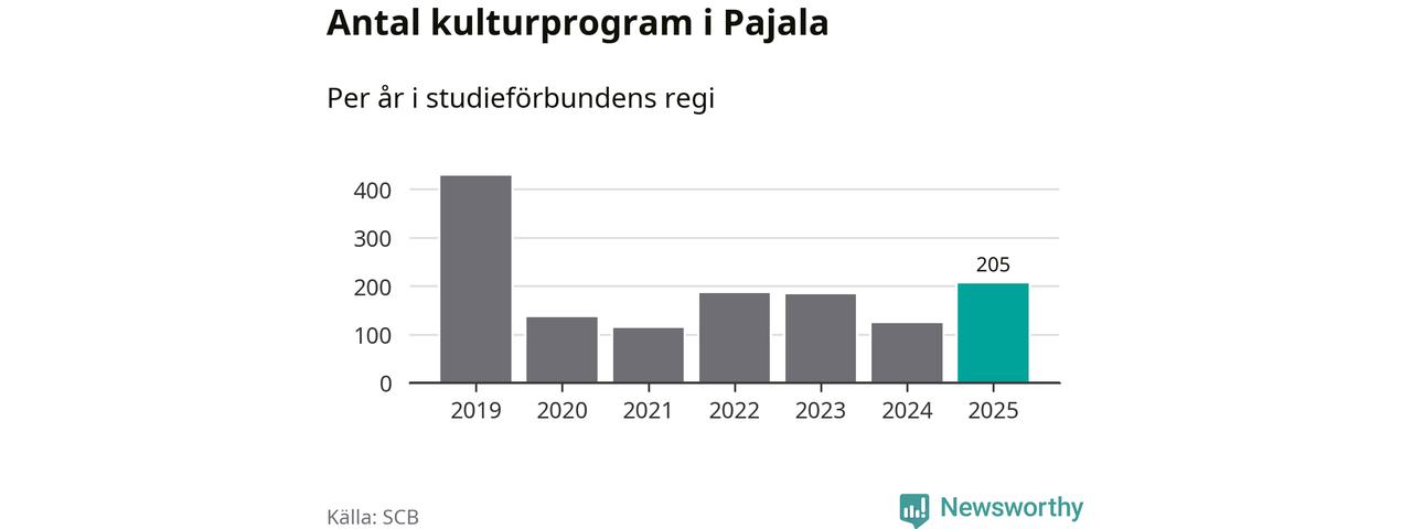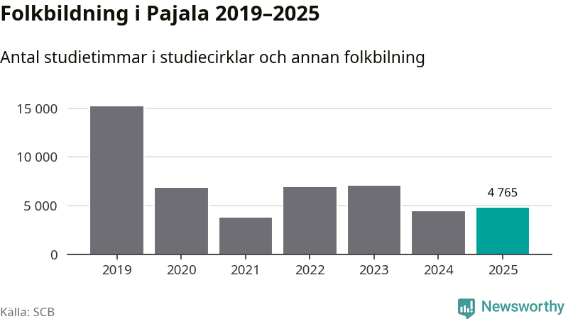 Sett till unika deltagare är folkbildningen på tillbakagång i Pajala. 2025 deltog 561 personer i studieförbundens verksamhet, vilket är en minskning med tre procent jämfört med året innan. Det innebär att var tionde invånare i kommunen deltog i studieförbundens verksamhet under 2025. Det är den näst högsta andelen i Norrbotten.