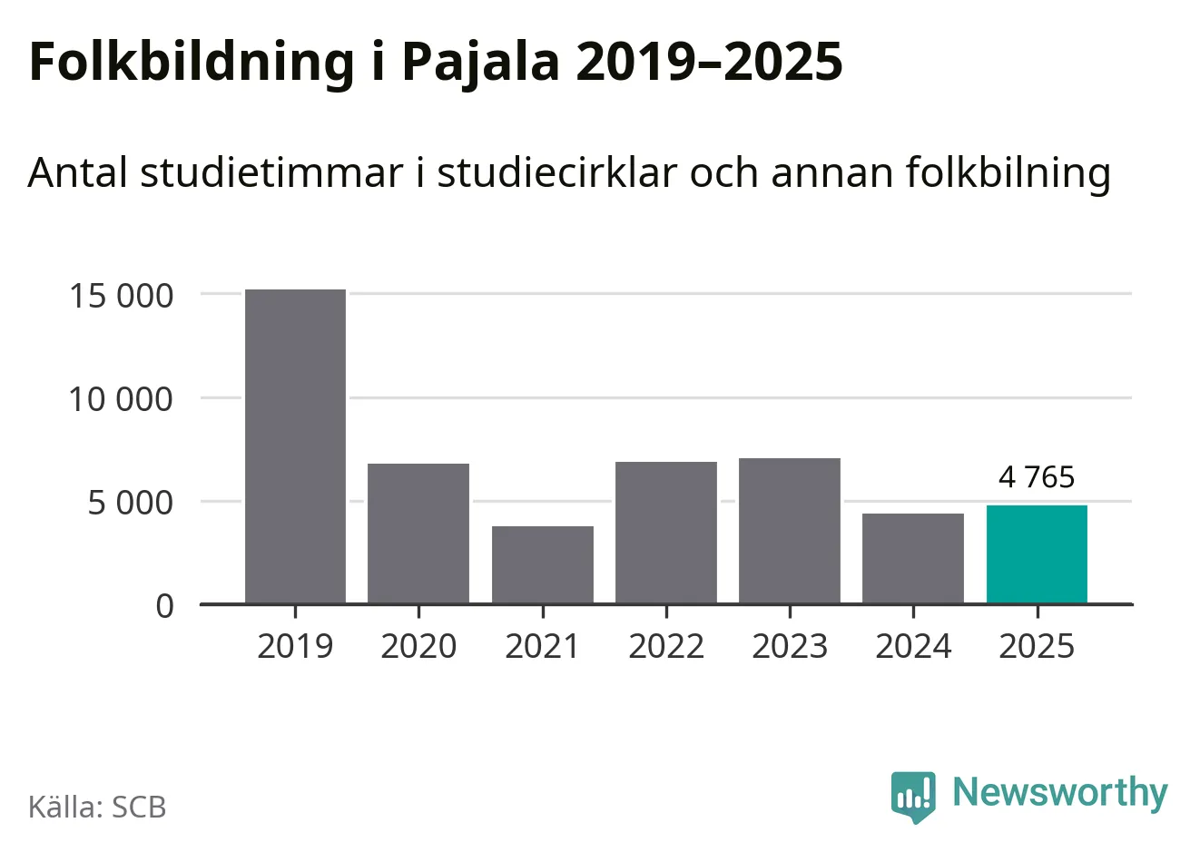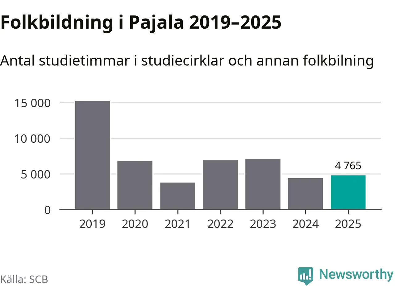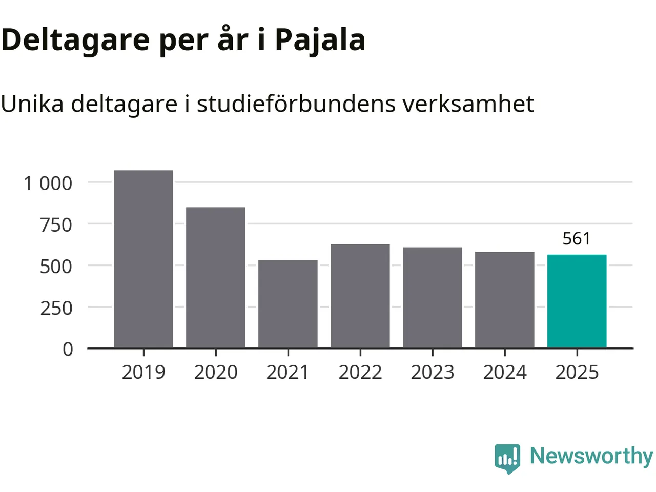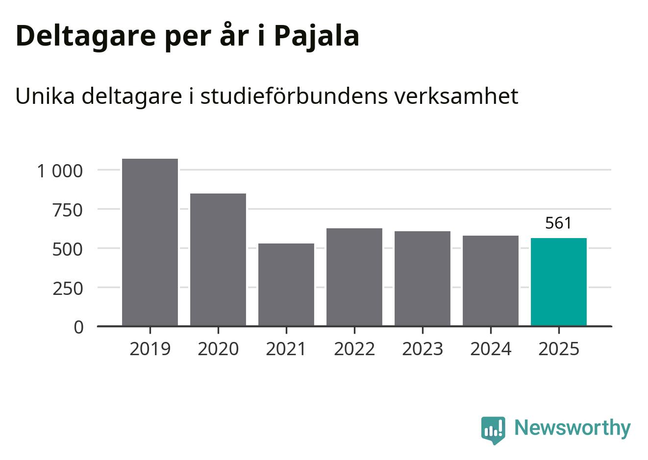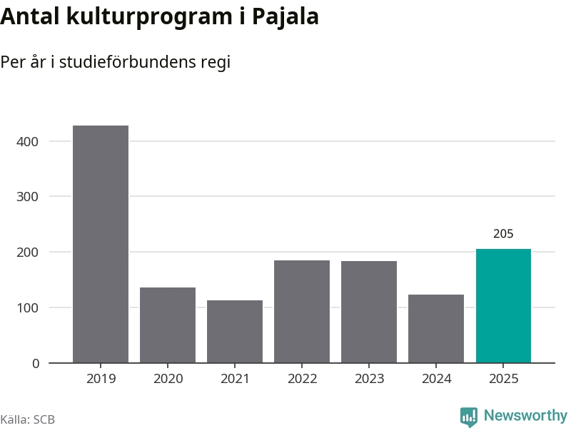 Sett till unika deltagare är folkbildningen på tillbakagång i Pajala. 2025 deltog 561 personer i studieförbundens verksamhet, vilket är en minskning med tre procent jämfört med året innan. Det innebär att var tionde invånare i kommunen deltog i studieförbundens verksamhet under 2025. Det är den näst högsta andelen i Norrbotten.