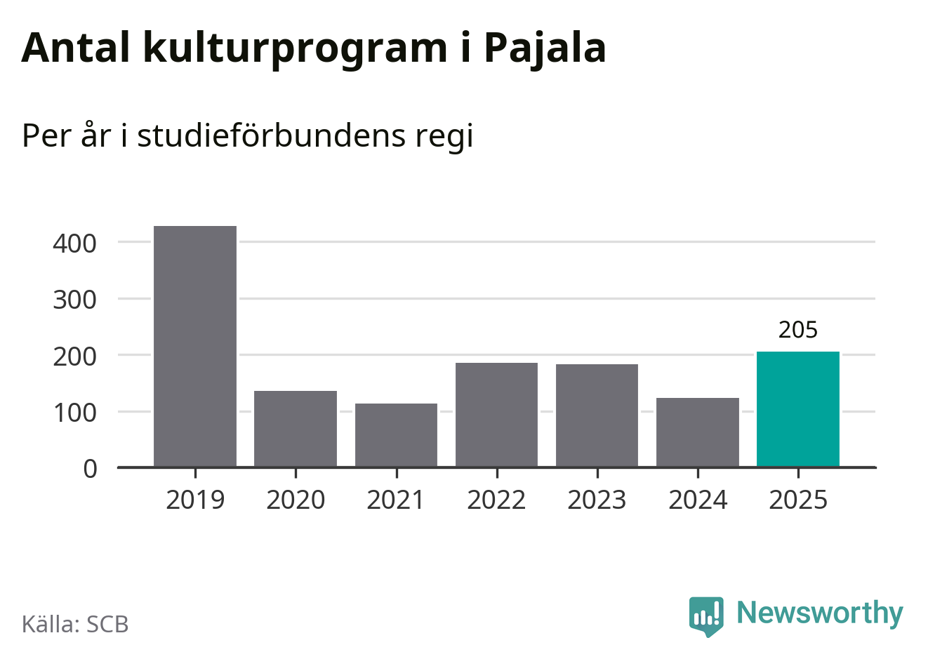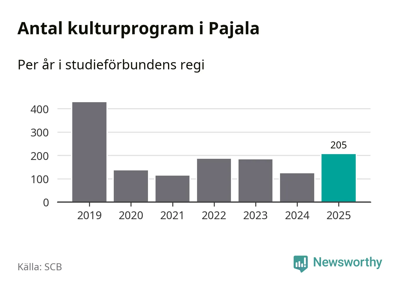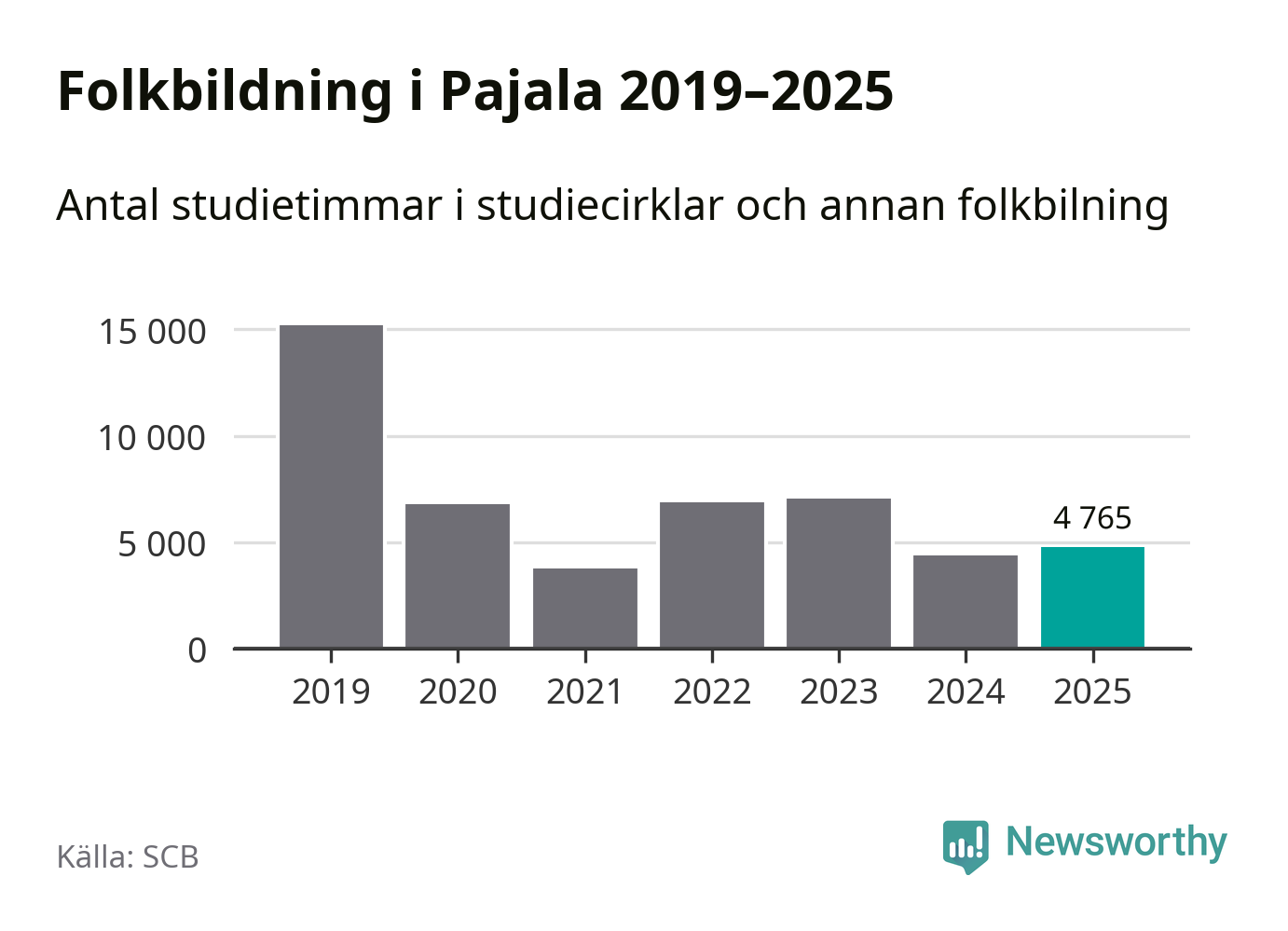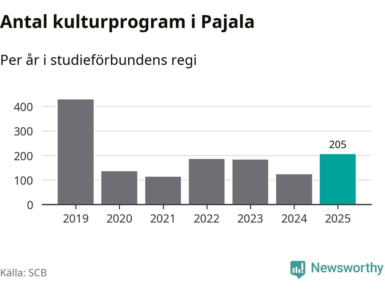 Sett till unika deltagare är folkbildningen på tillbakagång i Pajala. 2025 deltog 561 personer i studieförbundens verksamhet, vilket är en minskning med tre procent jämfört med året innan. Det innebär att var tionde invånare i kommunen deltog i studieförbundens verksamhet under 2025. Det är den näst högsta andelen i Norrbotten.