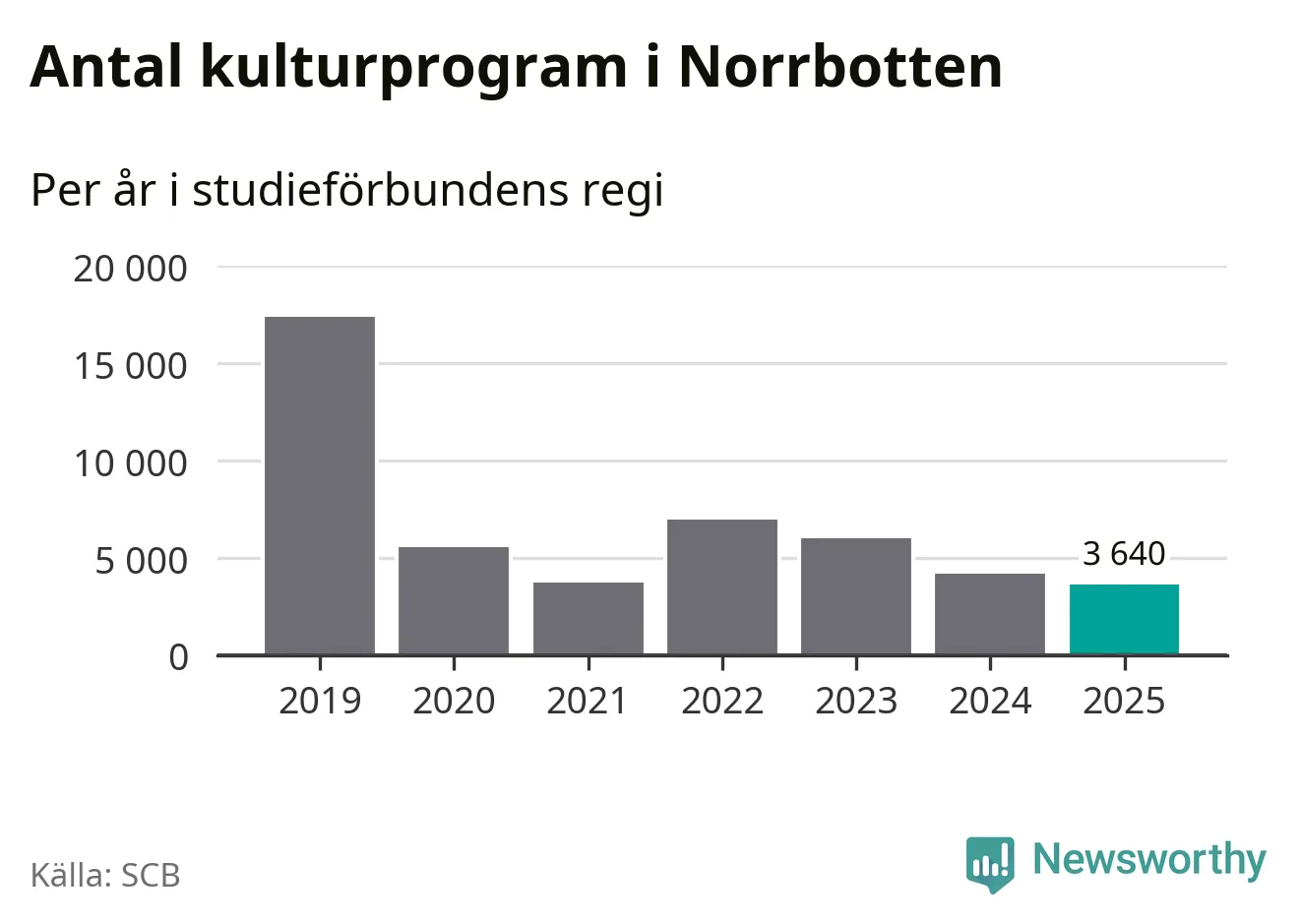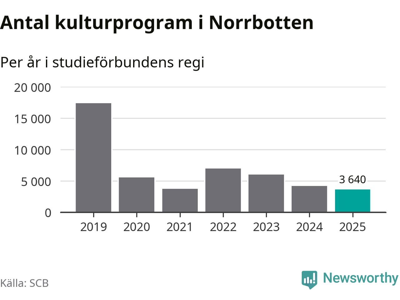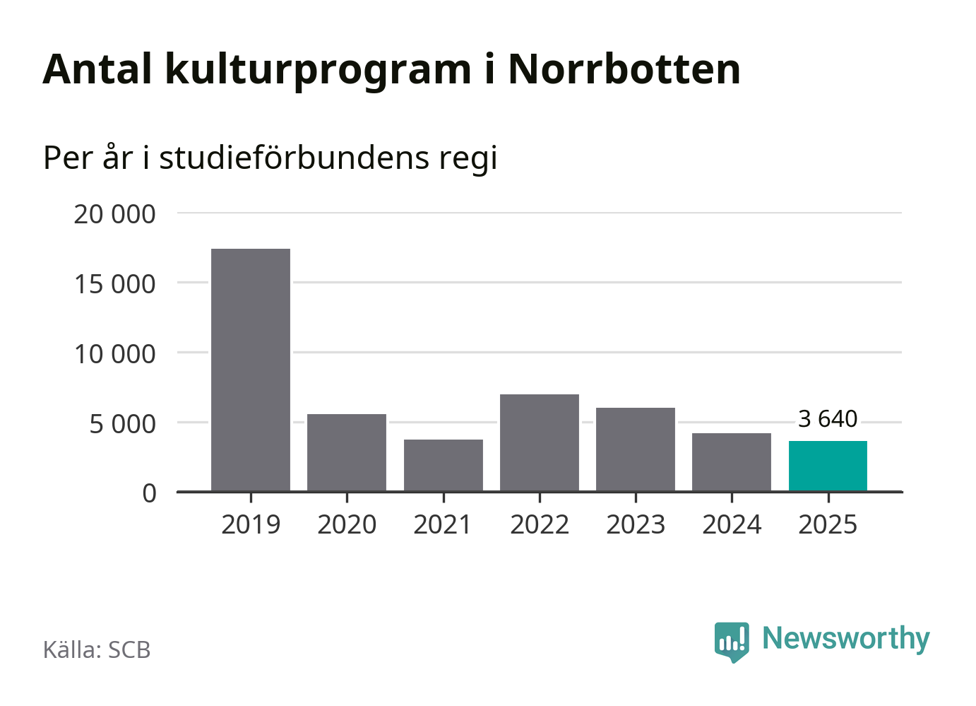 I Norrbotten är minskningen ännu större: förra året hade studieförbunden omkring 97 000 studietimmar i länet, vilket är en minskning med tio procent jämfört med året innan. Även antalet kulturprogram i studieförbundens regi minskade, från 4 220 till 3 640 stycken.