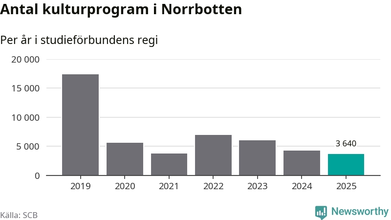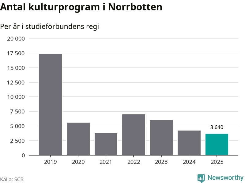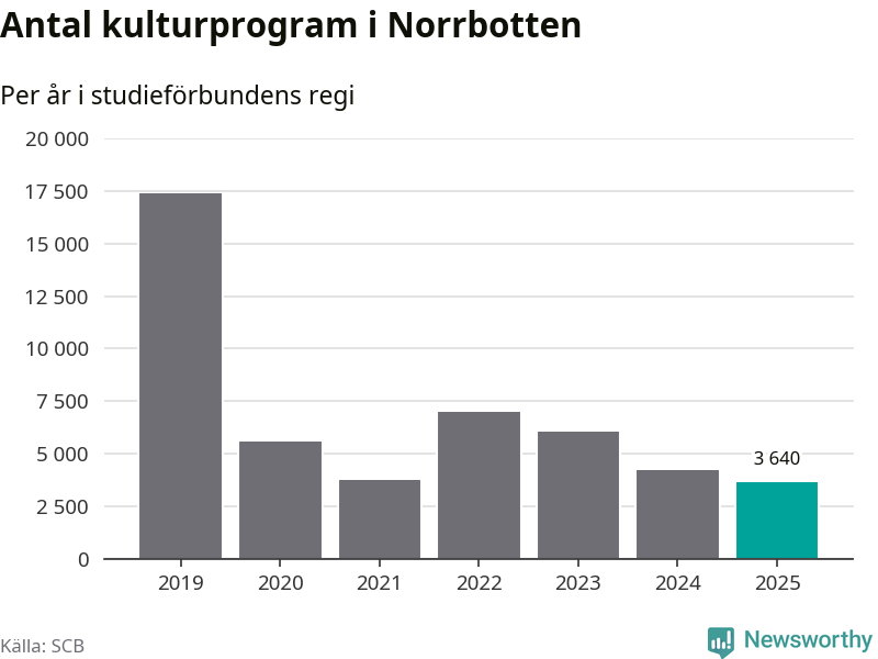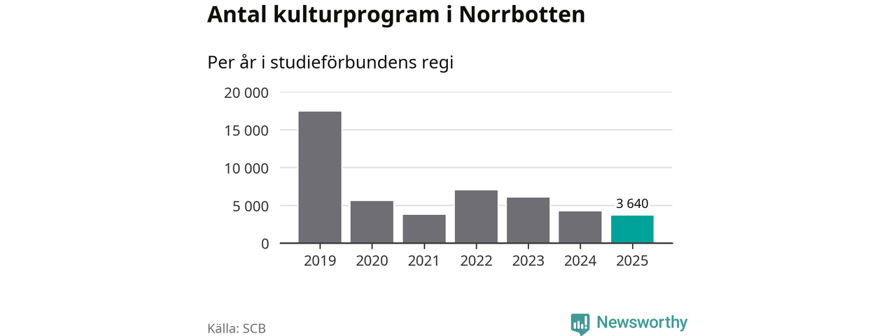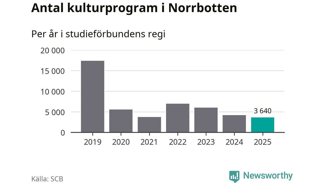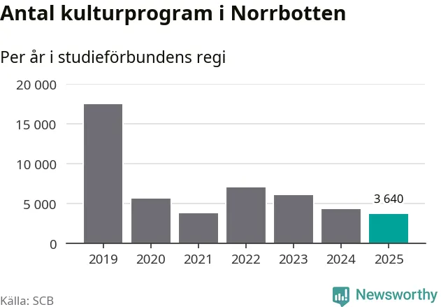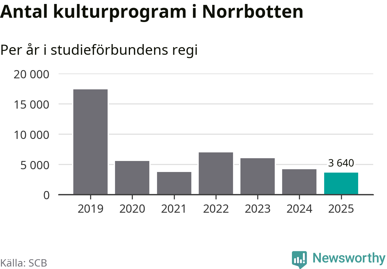 I Norrbotten är minskningen ännu större: förra året hade studieförbunden omkring 97 000 studietimmar i länet, vilket är en minskning med tio procent jämfört med året innan. Även antalet kulturprogram i studieförbundens regi minskade, från 4 220 till 3 640 stycken.