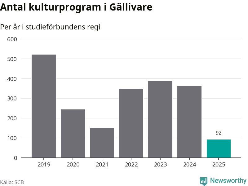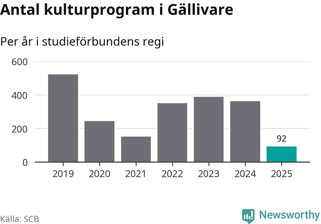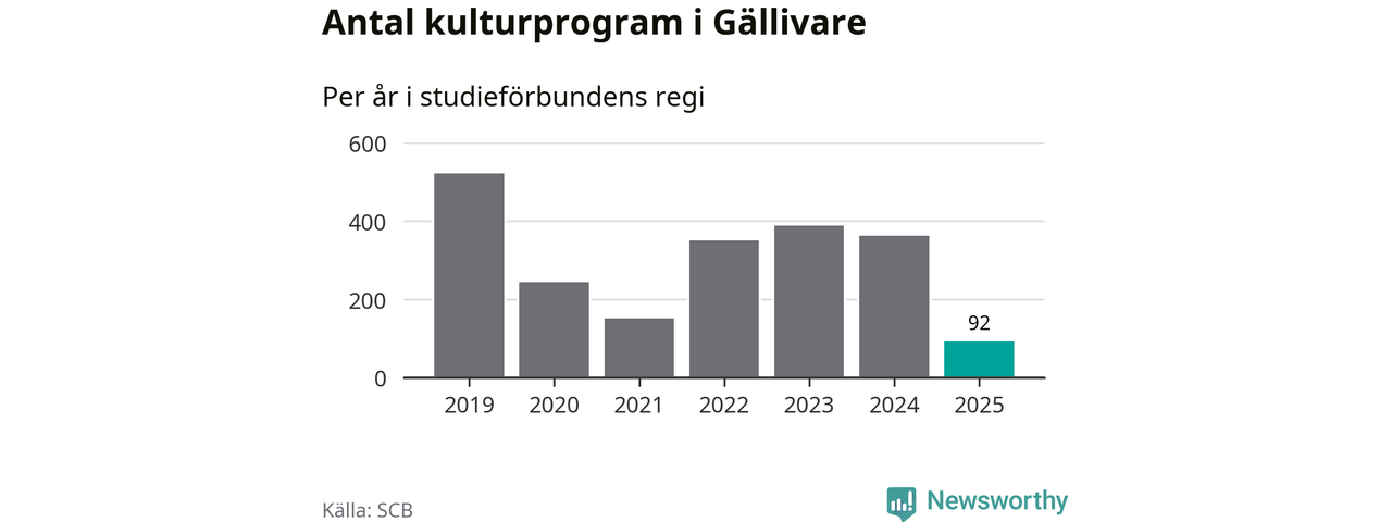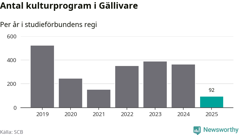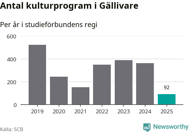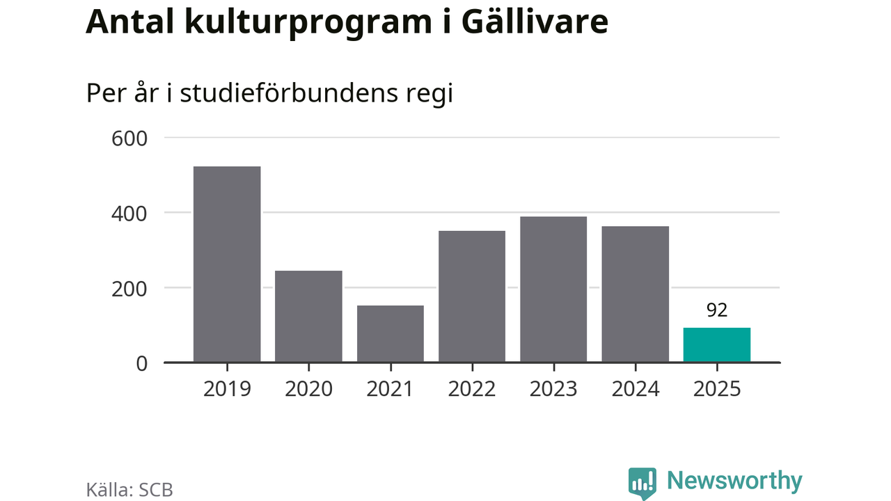 I Gällivare är minskningen ännu större: förra året hade studieförbunden omkring 3 800 studietimmar i kommunen, vilket är en minskning med 18 procent jämfört med året innan. Även antalet kulturprogram i studieförbundens regi minskade, från 362 till 92 stycken.