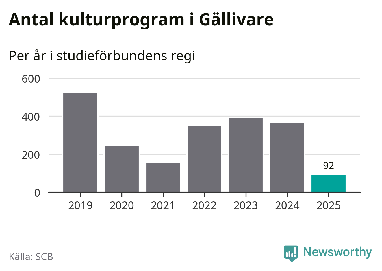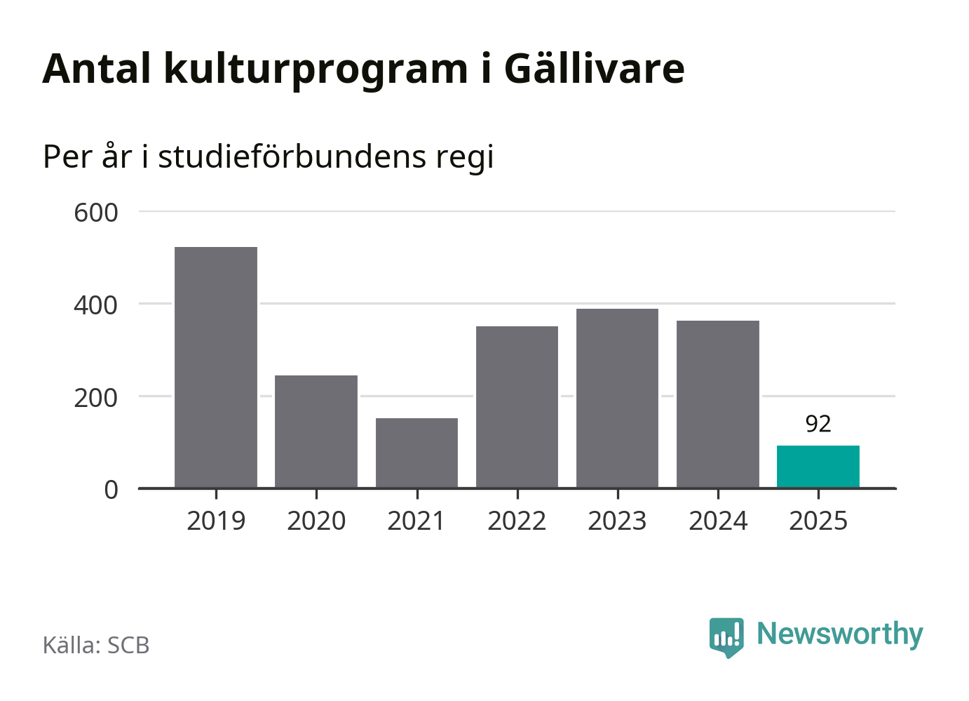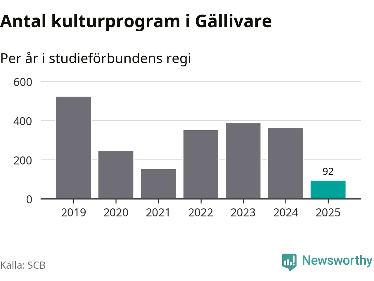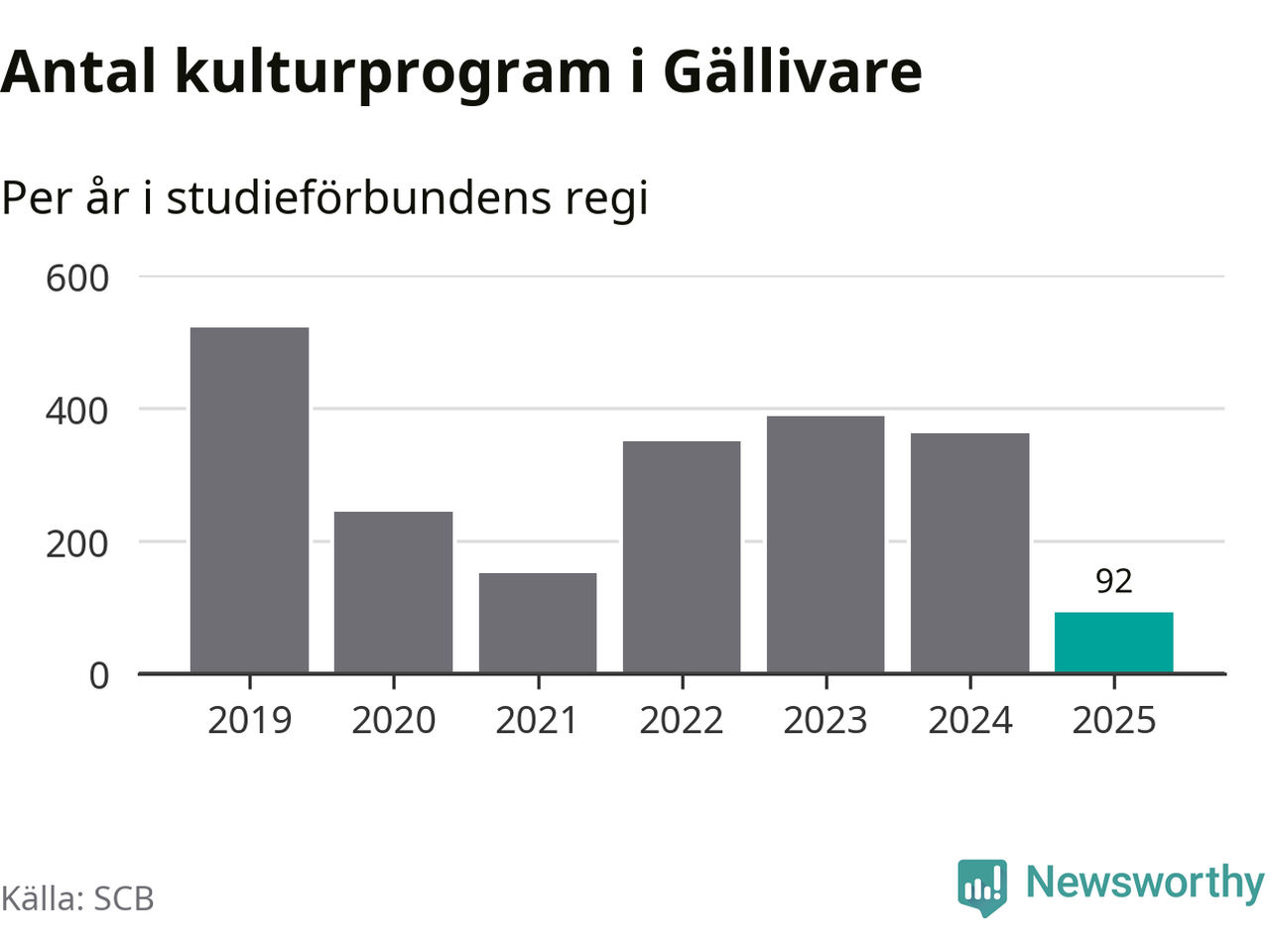 I Gällivare är minskningen ännu större: förra året hade studieförbunden omkring 3 800 studietimmar i kommunen, vilket är en minskning med 18 procent jämfört med året innan. Även antalet kulturprogram i studieförbundens regi minskade, från 362 till 92 stycken.