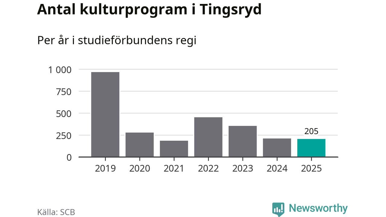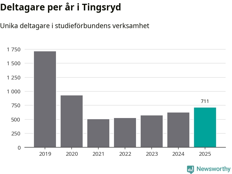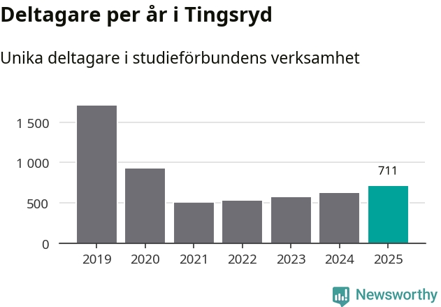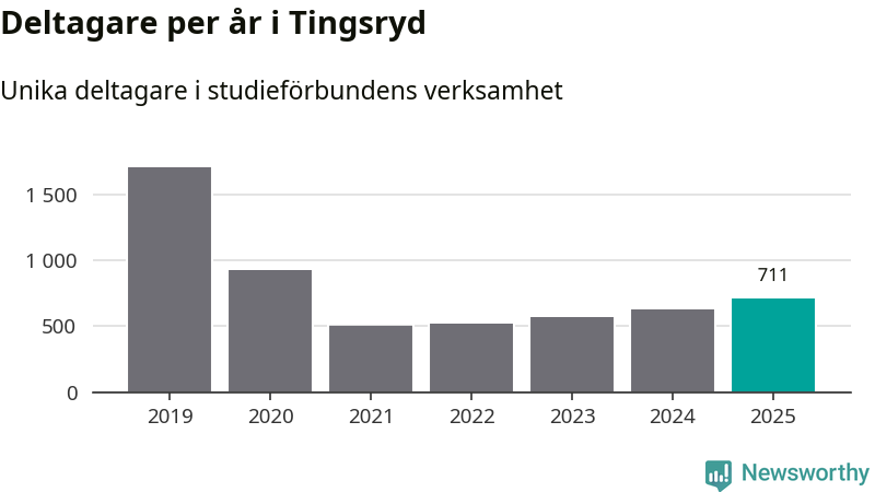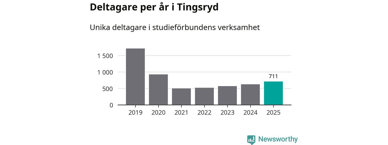 Även antalet unika deltagare ökade i Tingsryd i fjol: från 625 till 711 personer. Det innebär att sex procent av befolkningen i kommunen deltog i studieförbundens verksamhet under 2025, vilket är ungefär som rikssnittet.