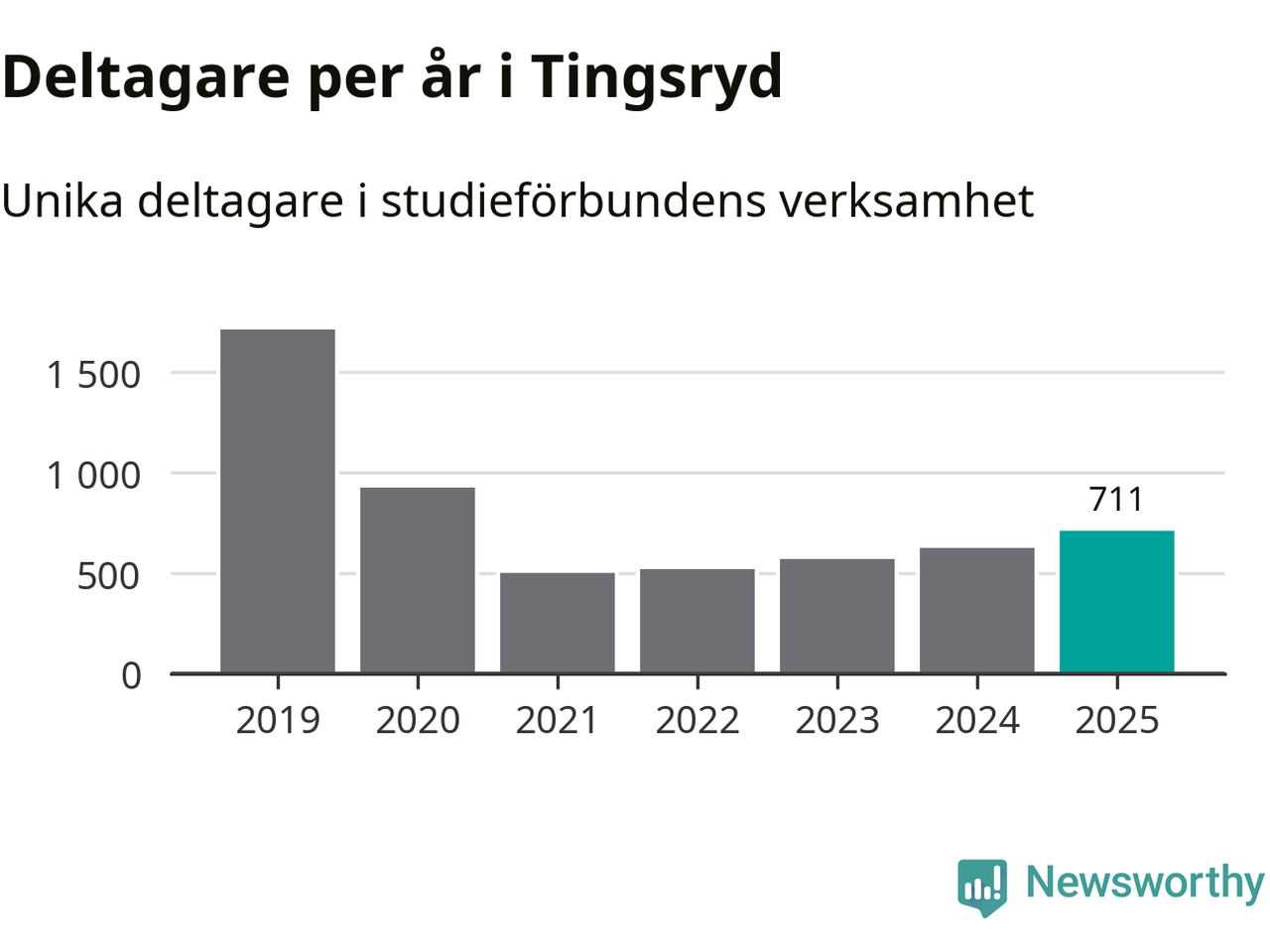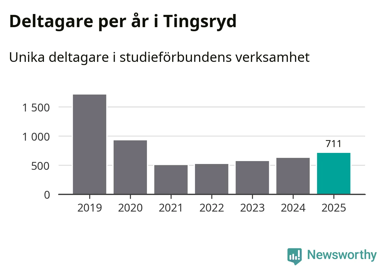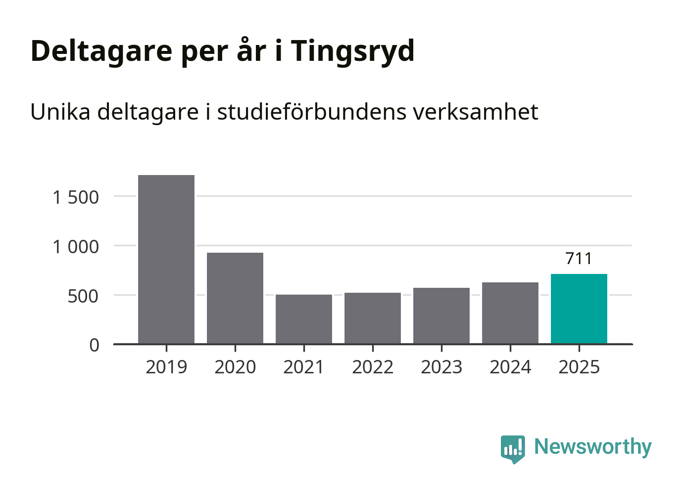 Även antalet unika deltagare ökade i Tingsryd i fjol: från 625 till 711 personer. Det innebär att sex procent av befolkningen i kommunen deltog i studieförbundens verksamhet under 2025, vilket är ungefär som rikssnittet.