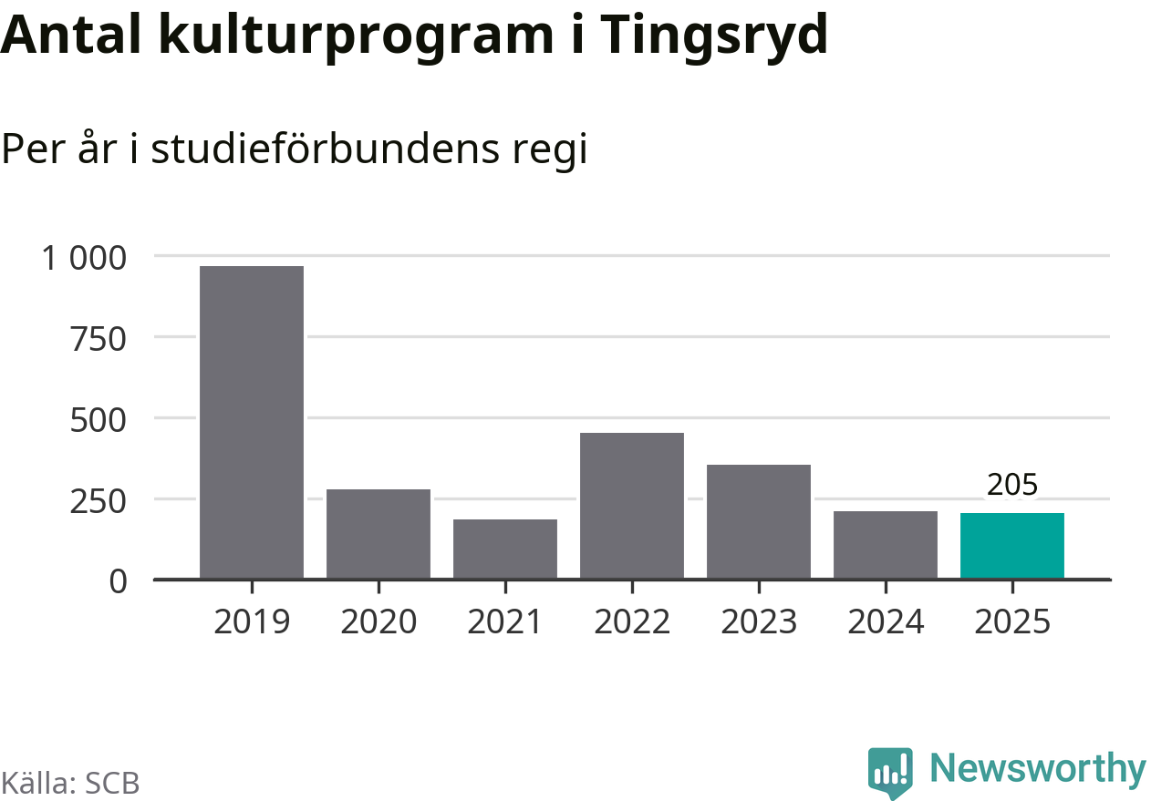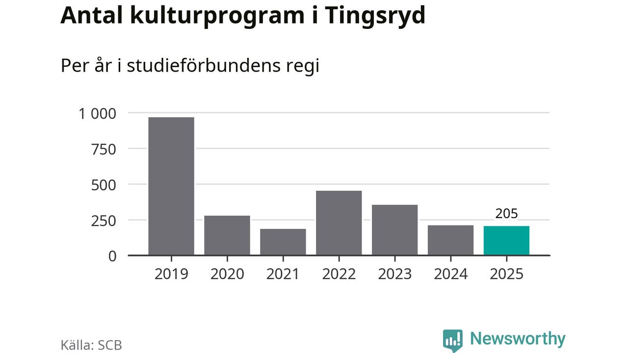 Men Tingsryd är en av 80 kommuner i landet där antalet studietimmar faktiskt ökade under under fjolåret. Omkring 2 800 studietimmar innebär en ökning med 9 procent jämfört med året innan. Däremot minskade antalet kulturarrangemang i studieförbundens regi i kommunen jämfört med året innan.