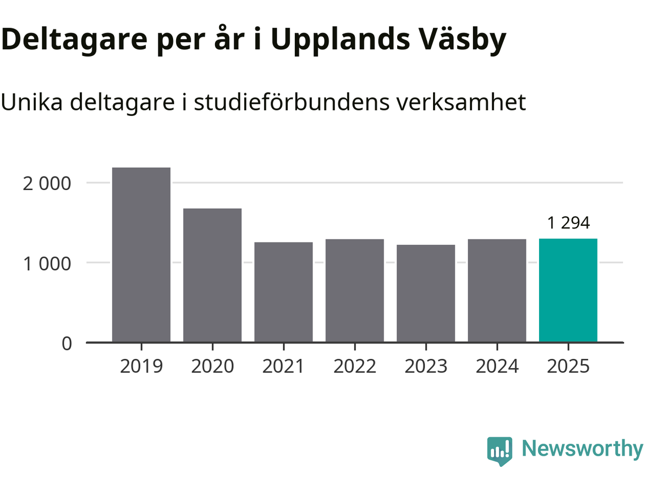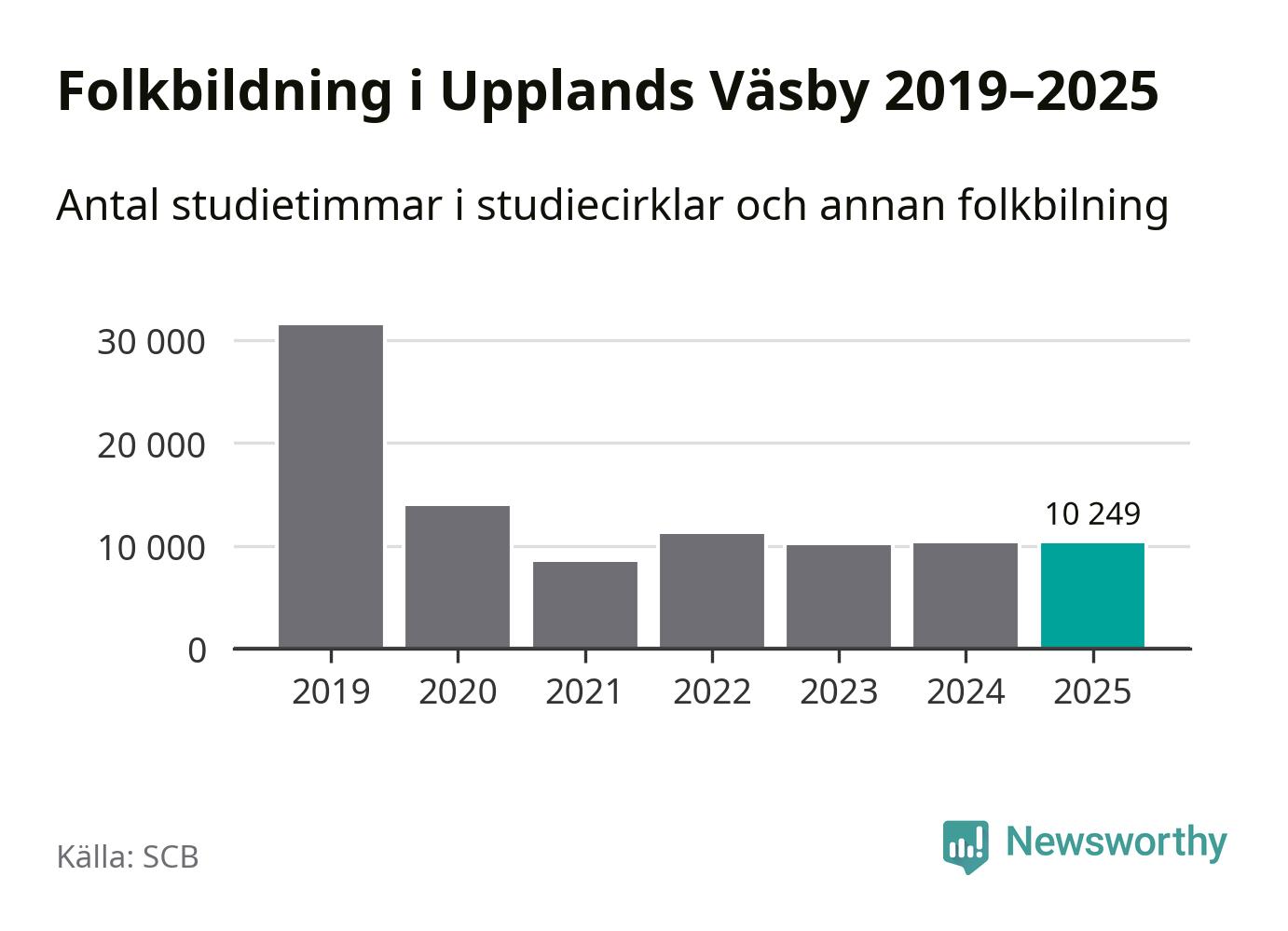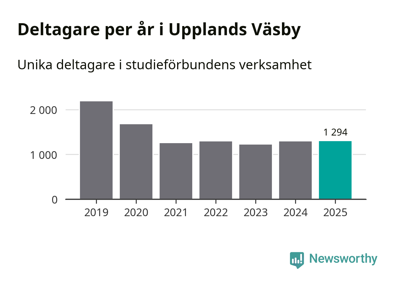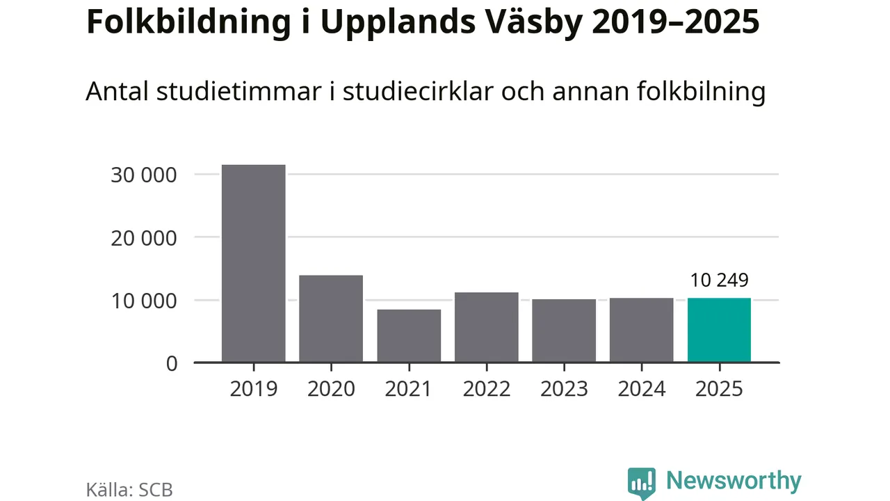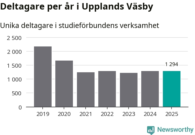 Omkring 1 300 Väsbybor deltog i någon form av folkbildning under 2025, vilket är ungefär lika många som året innan. Det innebär att tre procent av befolkningen i kommunen deltog i studieförbundens verksamhet under 2025, vilket är lägre än rikssnittet.