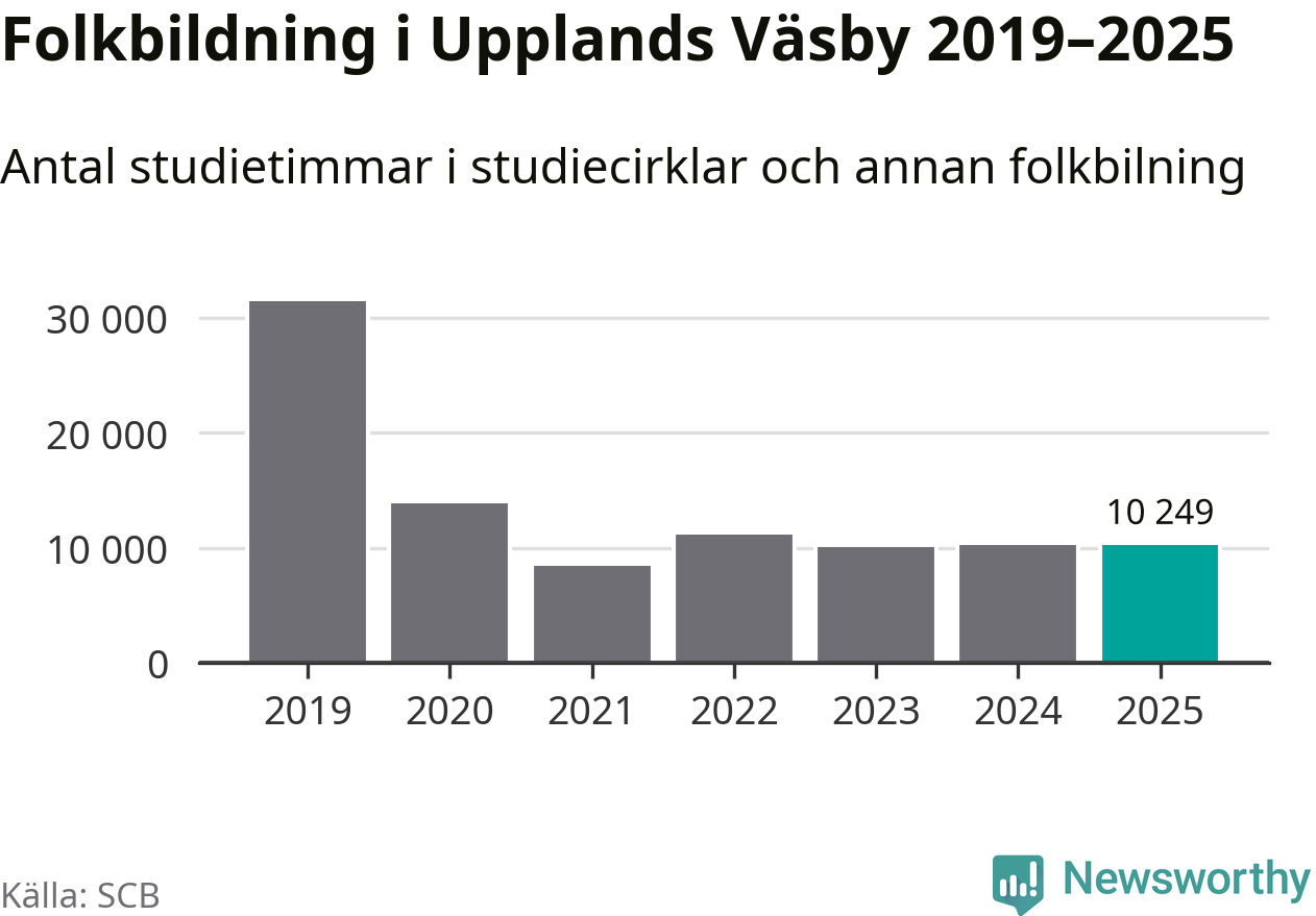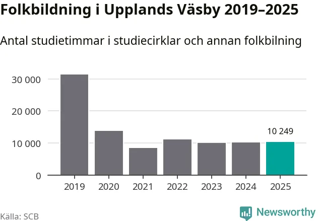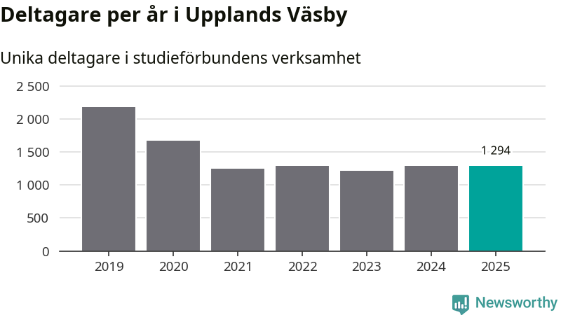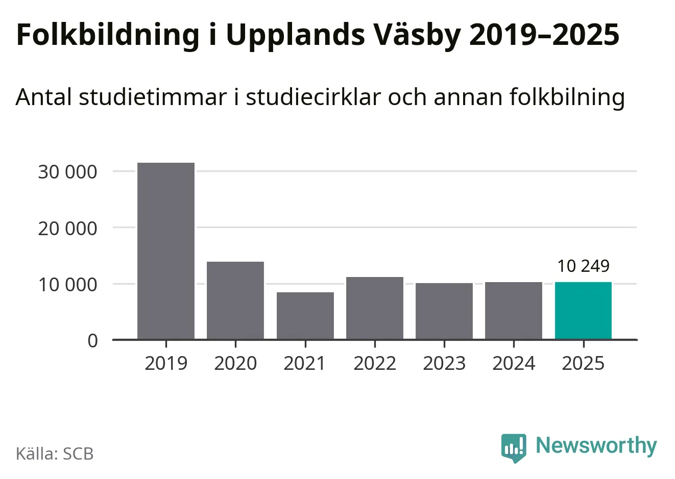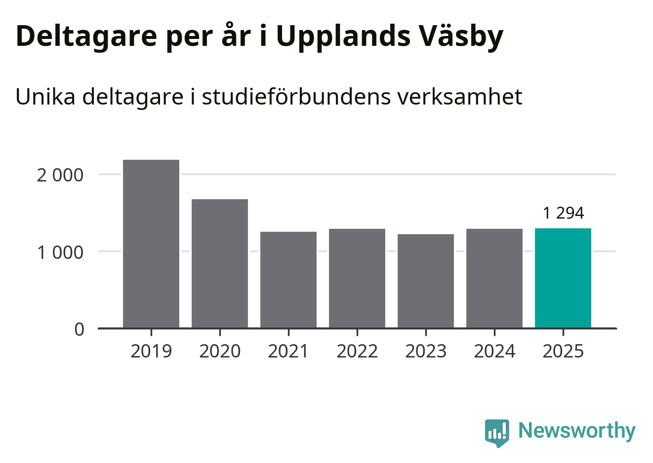 Omkring 1 300 Väsbybor deltog i någon form av folkbildning under 2025, vilket är ungefär lika många som året innan. Det innebär att tre procent av befolkningen i kommunen deltog i studieförbundens verksamhet under 2025, vilket är lägre än rikssnittet.