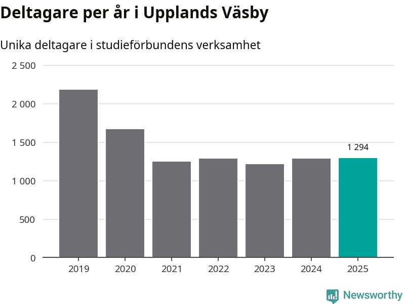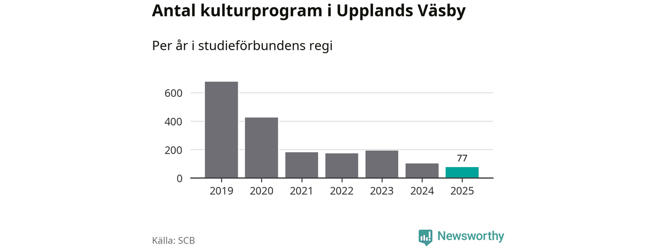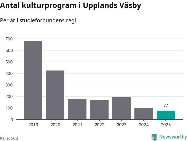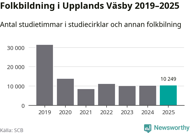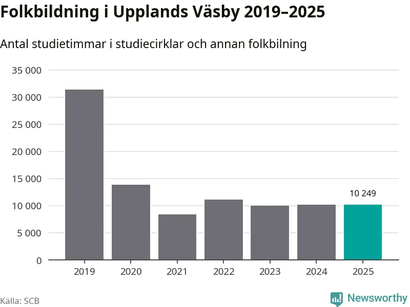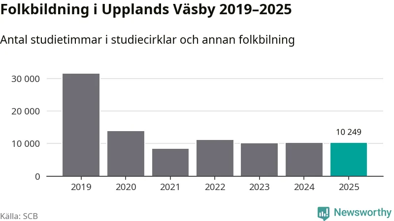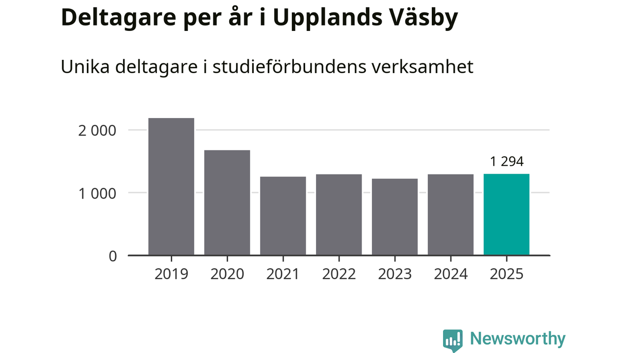 Omkring 1 300 Väsbybor deltog i någon form av folkbildning under 2025, vilket är ungefär lika många som året innan. Det innebär att tre procent av befolkningen i kommunen deltog i studieförbundens verksamhet under 2025, vilket är lägre än rikssnittet.
