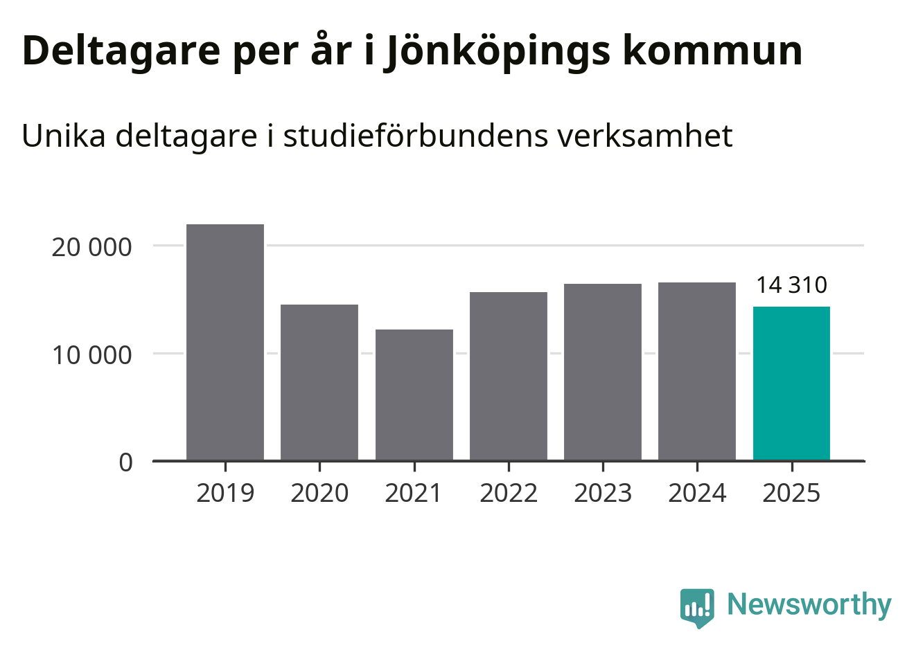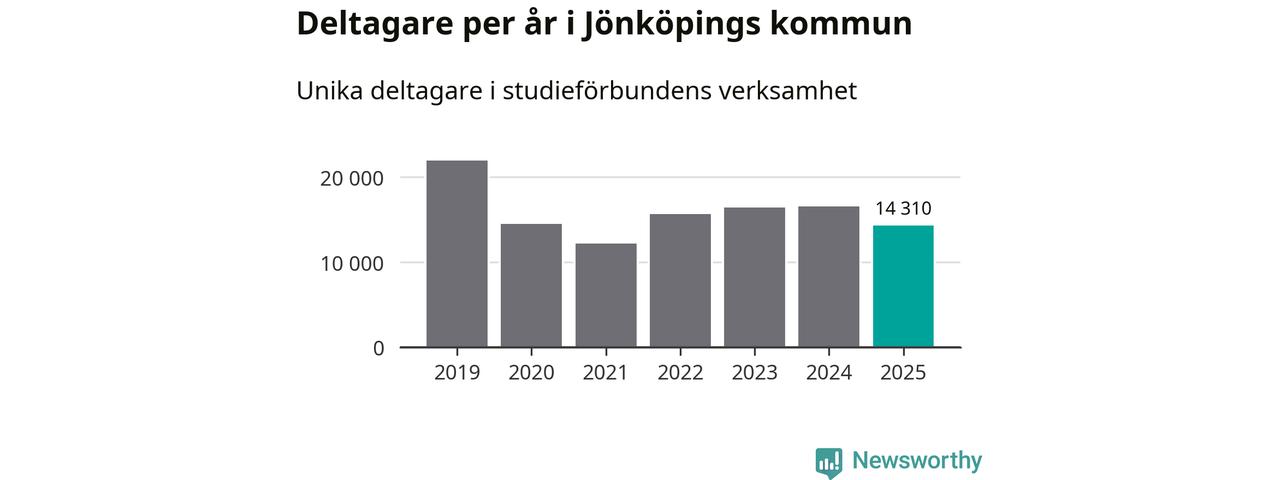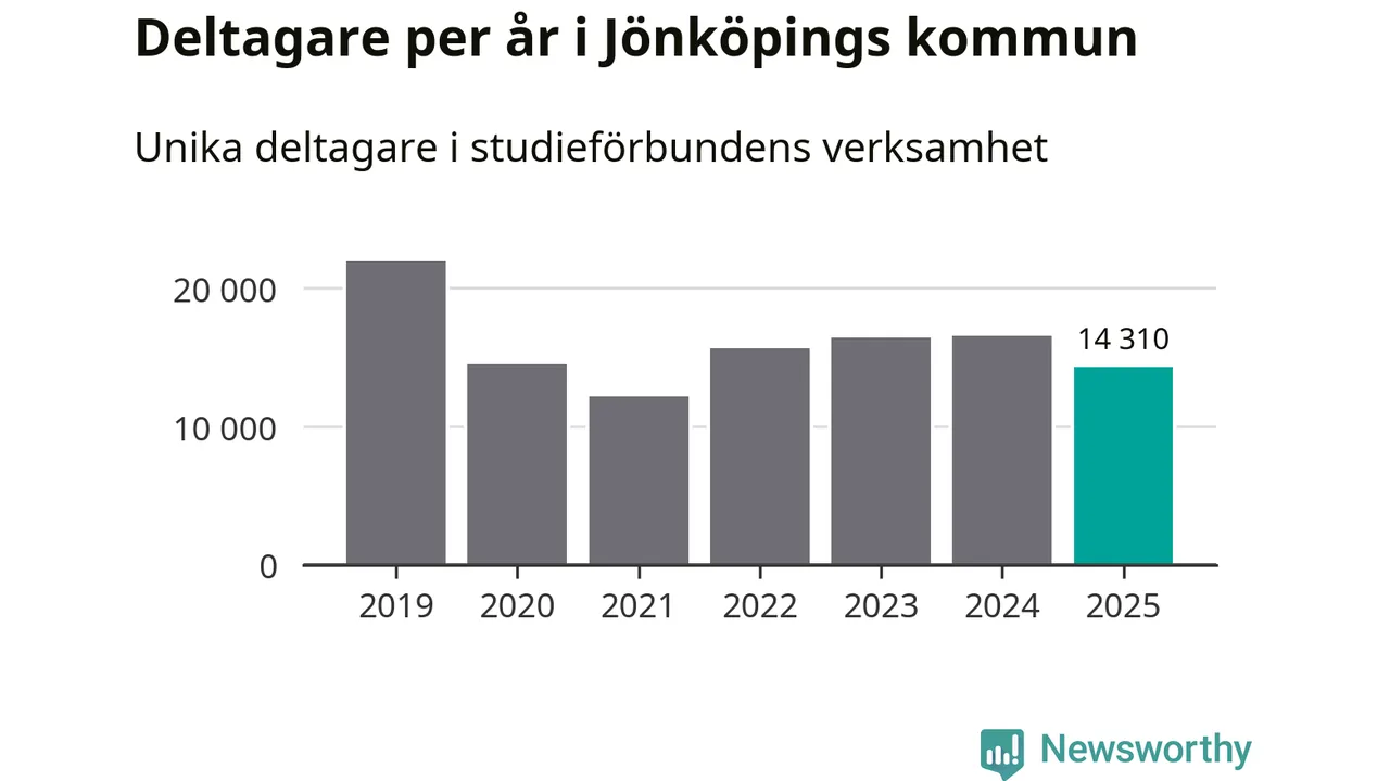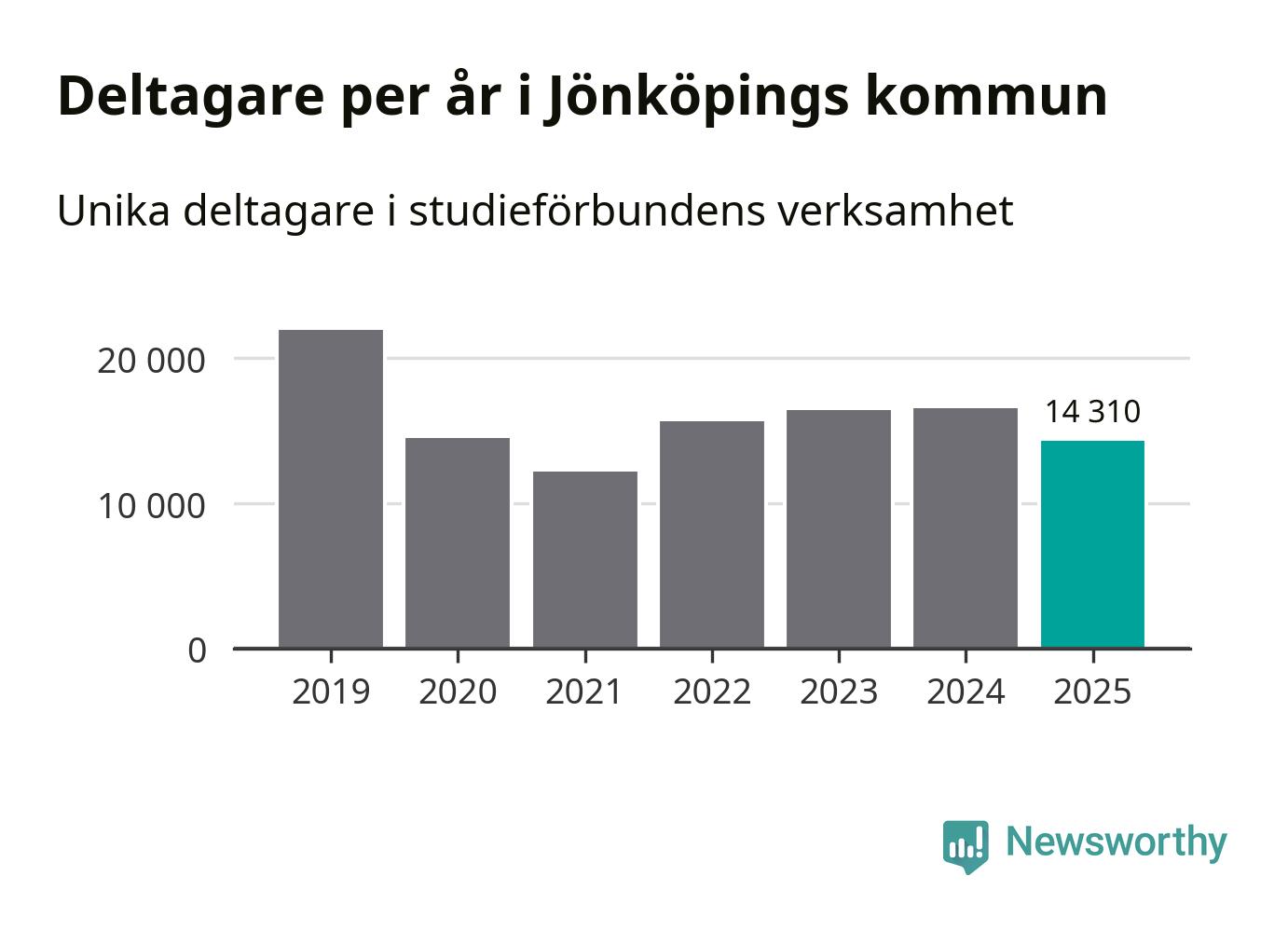 Även sett till unika deltagare är folkbildningen på tillbakagång i Jönköpings kommun. 2025 deltog 14 310 personer i studieförbundens verksamhet, vilket är en minskning med 14 procent jämfört med året innan. Det innebär att var tionde invånare i kommunen deltog i studieförbundens verksamhet under 2025, vilket är högre än rikssnittet.