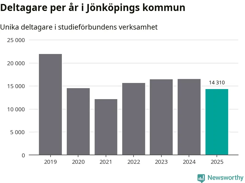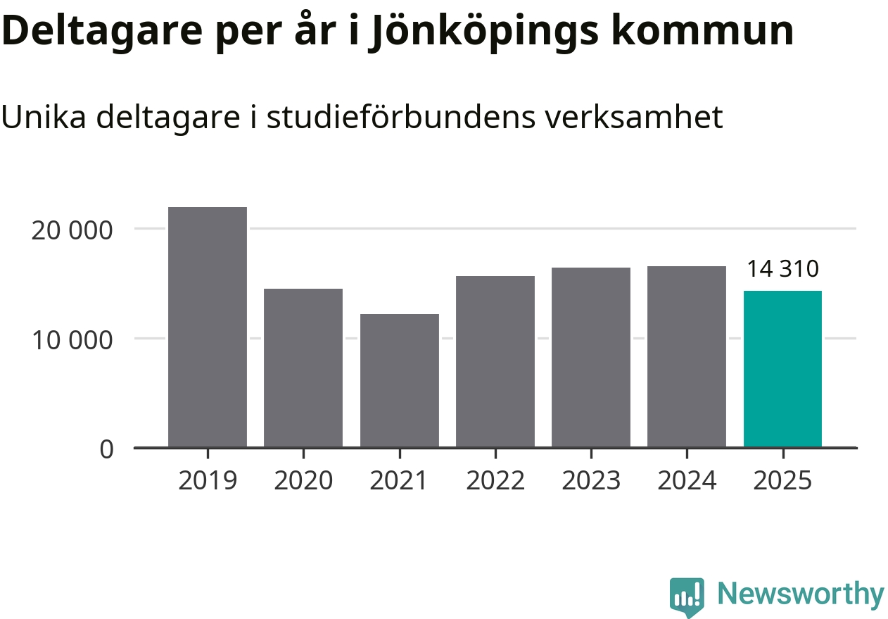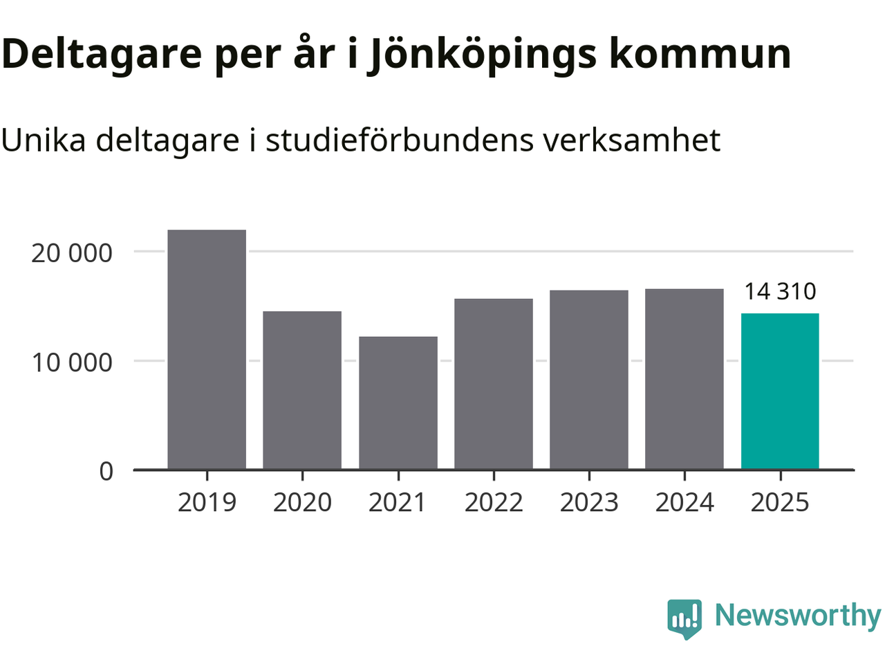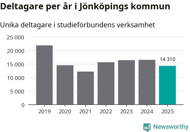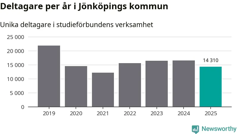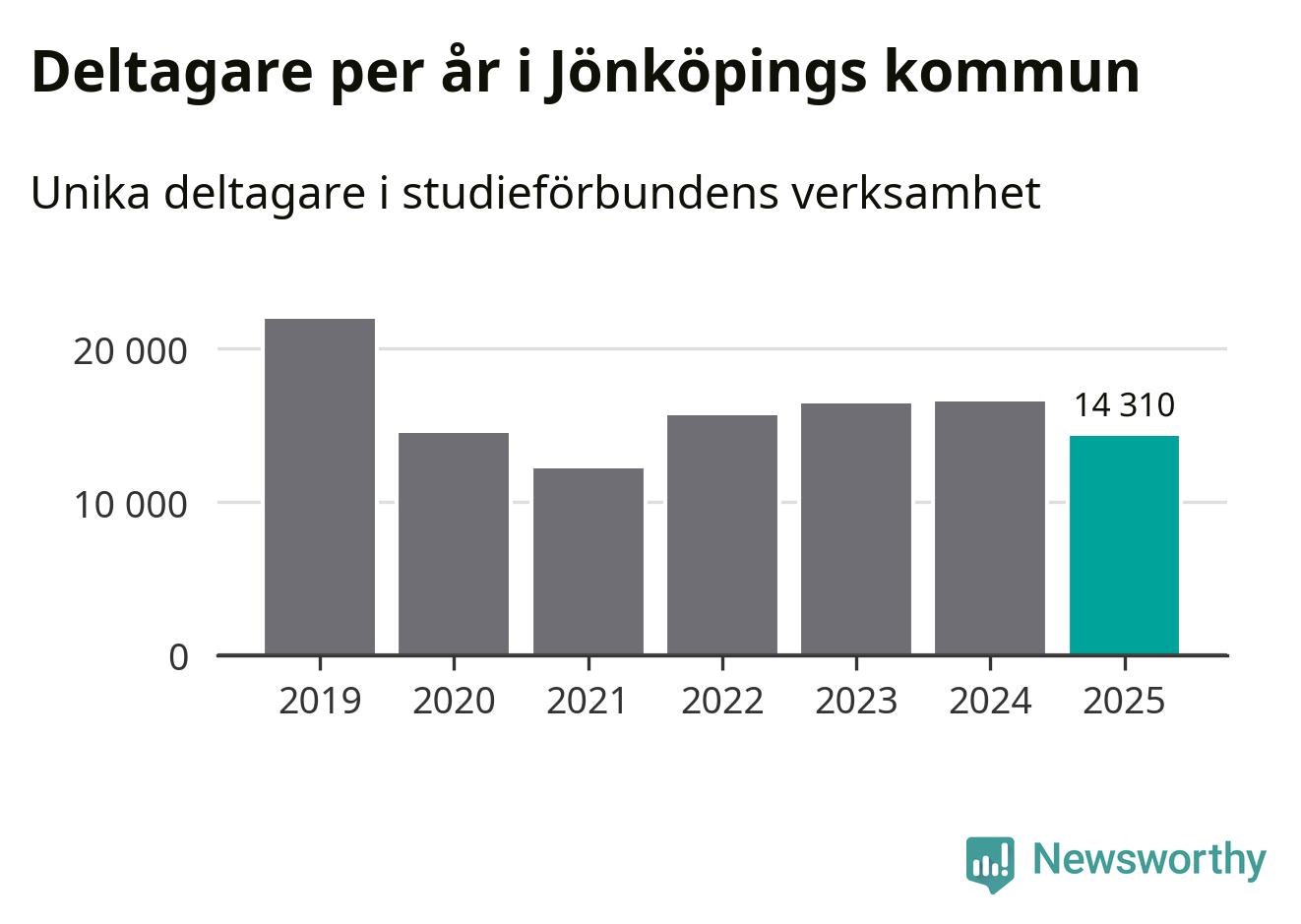 Även sett till unika deltagare är folkbildningen på tillbakagång i Jönköpings kommun. 2025 deltog 14 310 personer i studieförbundens verksamhet, vilket är en minskning med 14 procent jämfört med året innan. Det innebär att var tionde invånare i kommunen deltog i studieförbundens verksamhet under 2025, vilket är högre än rikssnittet.