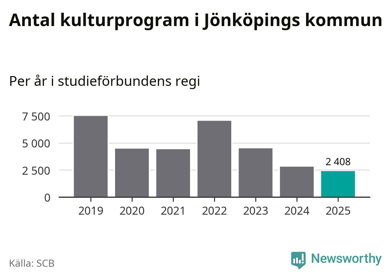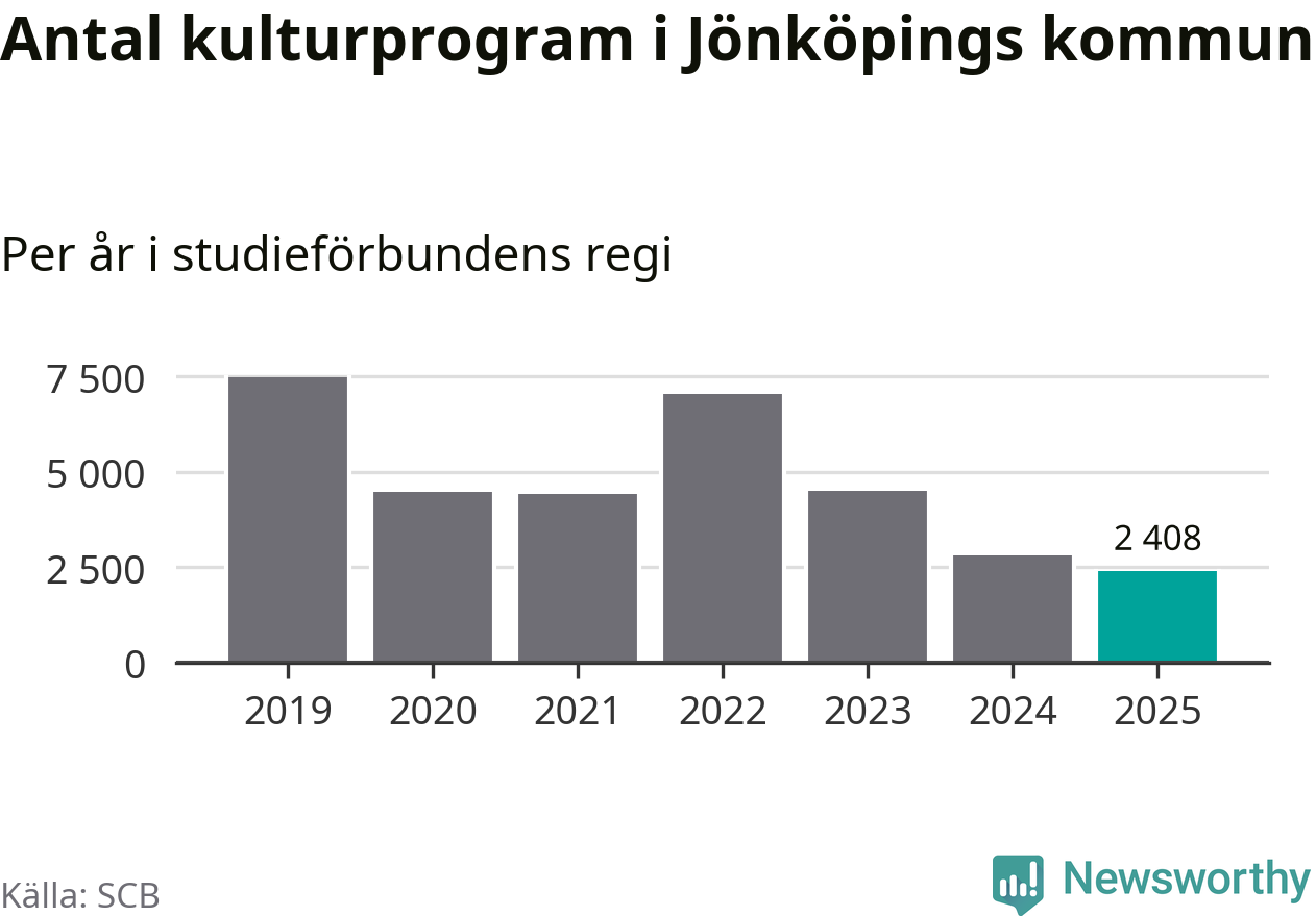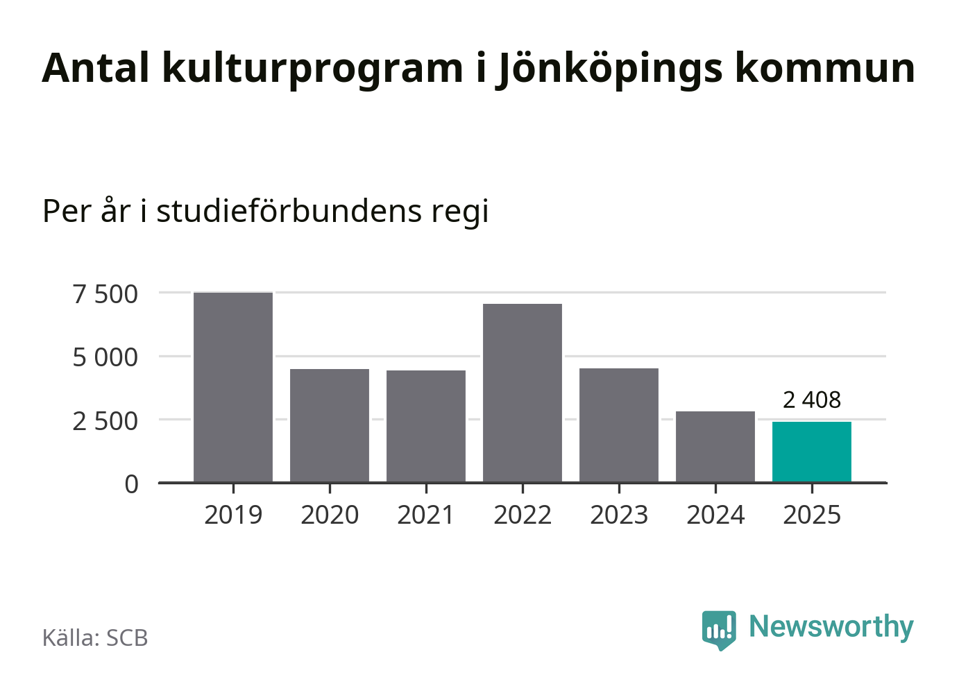 Utvecklingen ser ungefär likadan ut i Jönköpings kommun, förra året hade studieförbunden omkring 65 200 studietimmar i kommunen jämfört med omkring 68 100 året innan, en minskning med fyra procent. Även antalet kulturprogram i studieförbundens regi minskade, från 2 815 till 2 408 stycken.