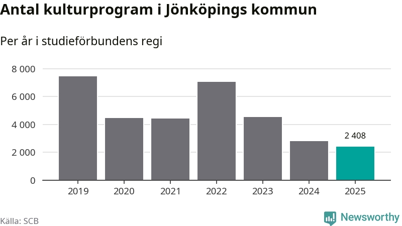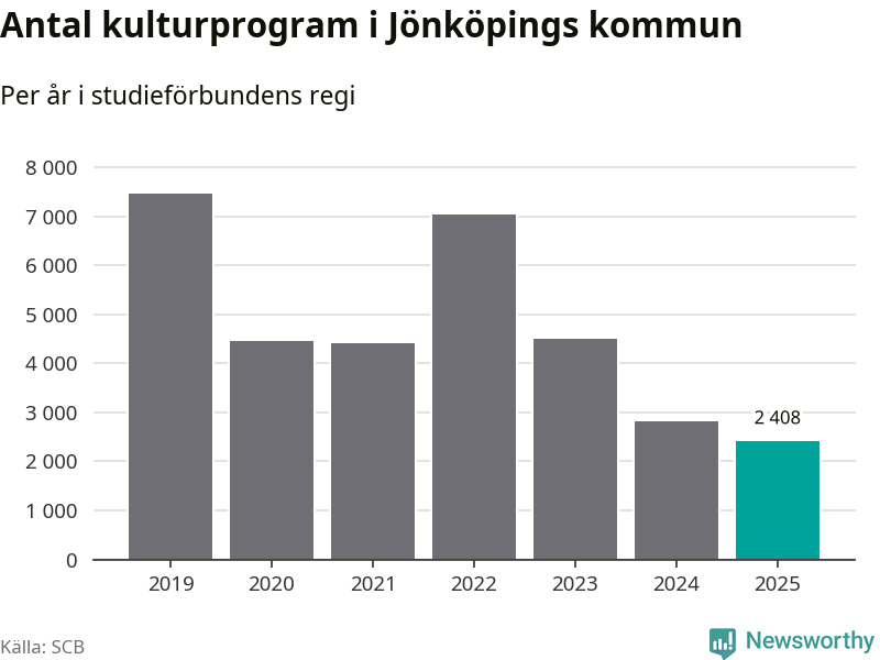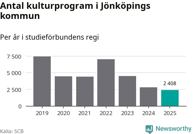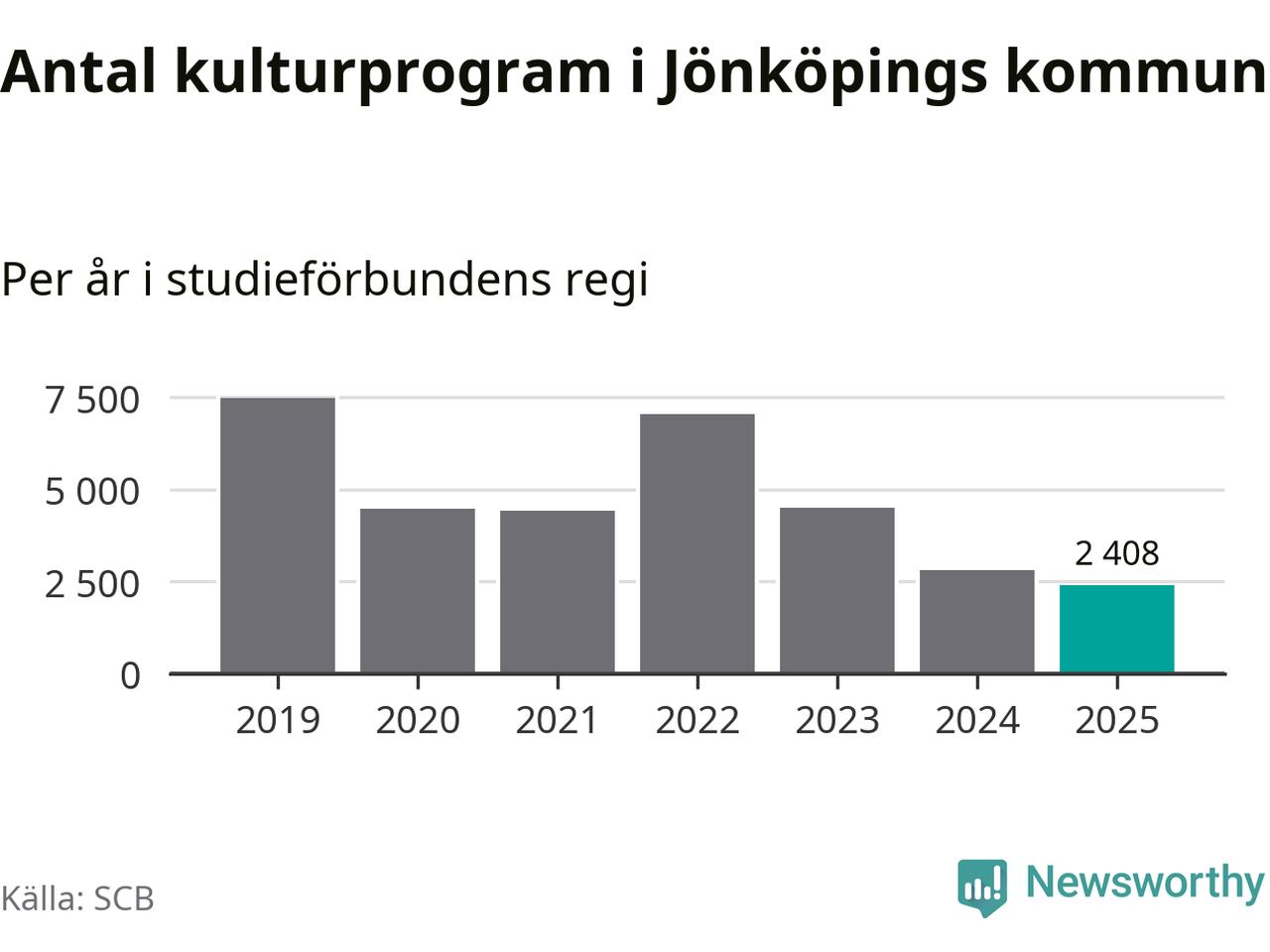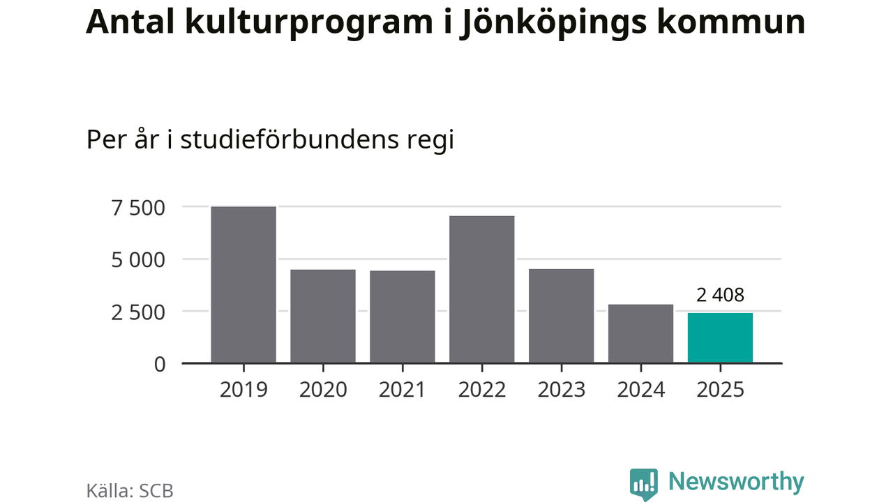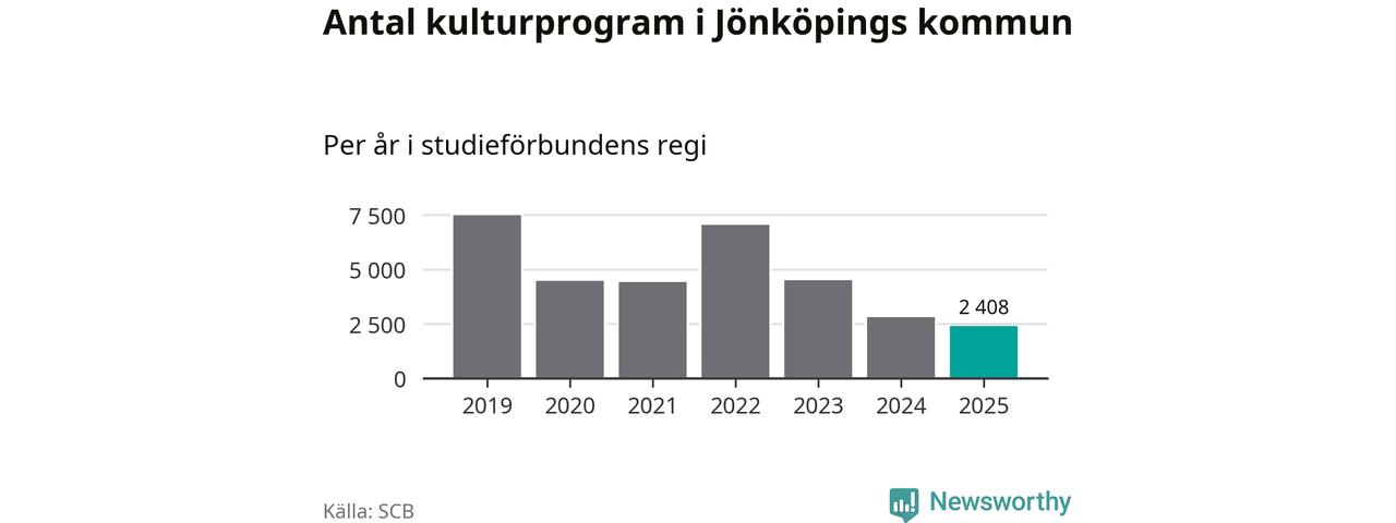 Utvecklingen ser ungefär likadan ut i Jönköpings kommun, förra året hade studieförbunden omkring 65 200 studietimmar i kommunen jämfört med omkring 68 100 året innan, en minskning med fyra procent. Även antalet kulturprogram i studieförbundens regi minskade, från 2 815 till 2 408 stycken.