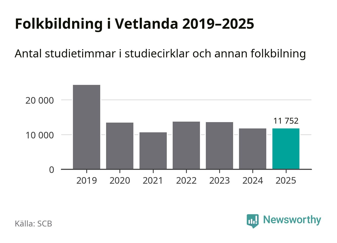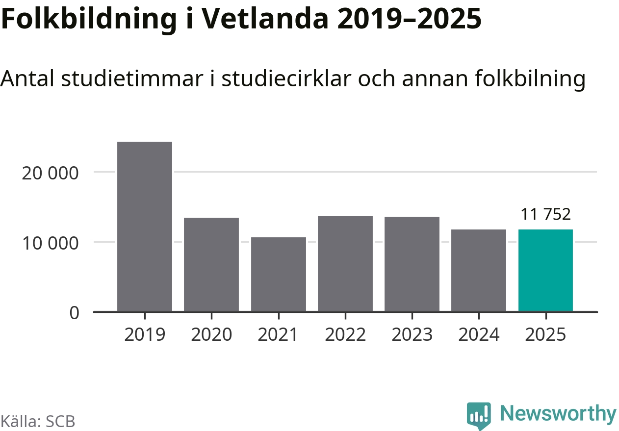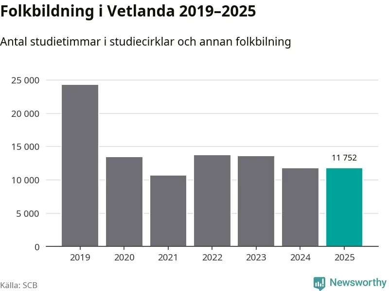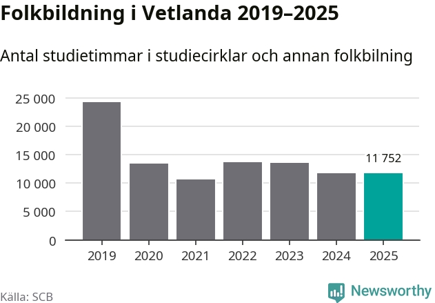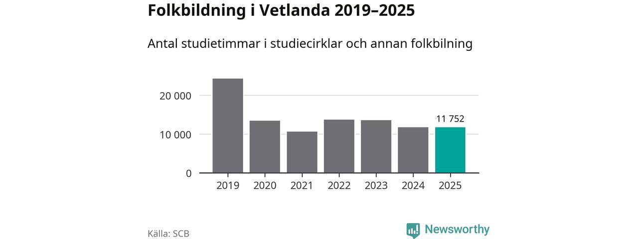 Sju av de studieförbund som 2025 fick bidrag från Folkbildningsrådet har haft någon form av verksamhet – antingen studiecirkel, annan folkbildning eller kulturprogram – i Vetlanda under de två senaste åren. Under 2025 ökade Medborgarskolan, Bilda och NBV antalet studietimmar i kommunen jämfört med året innan, medan de fyra andra förbunden i kommunen noterade färre timmar.