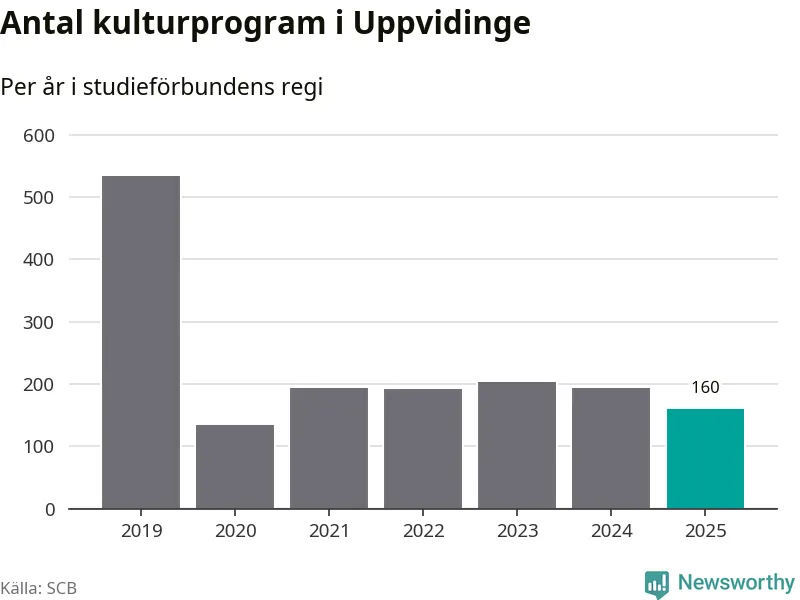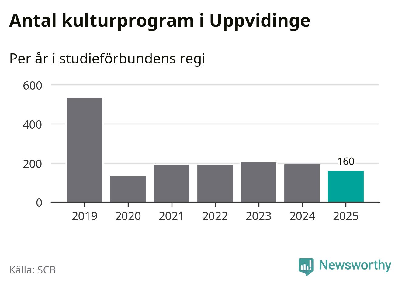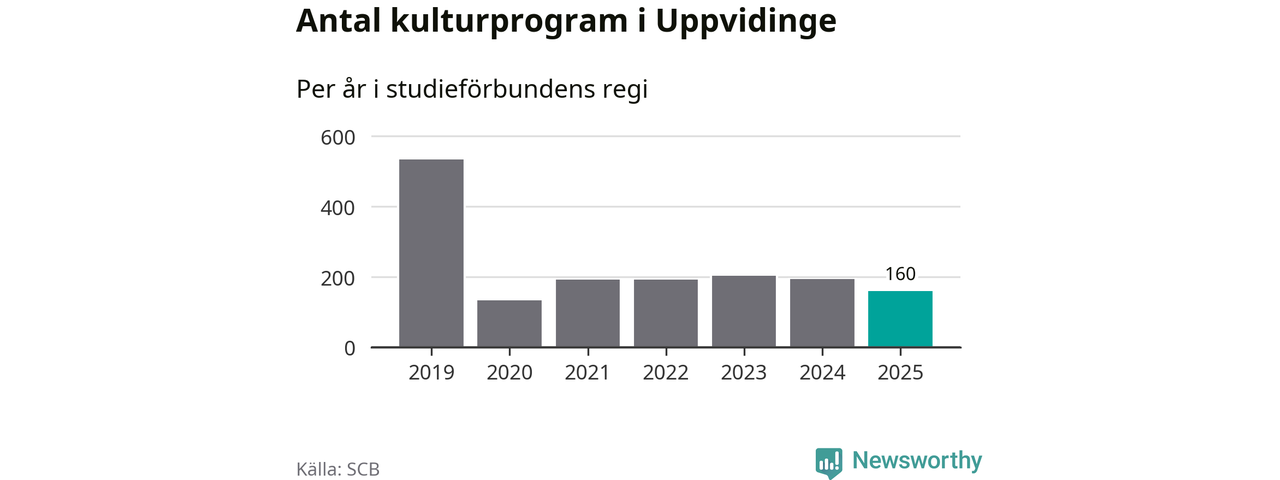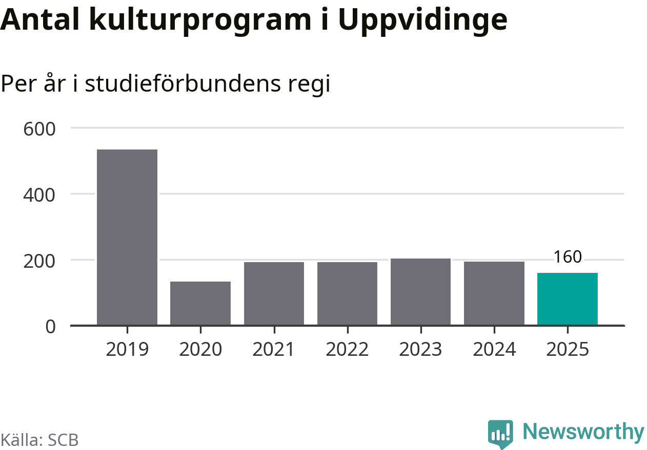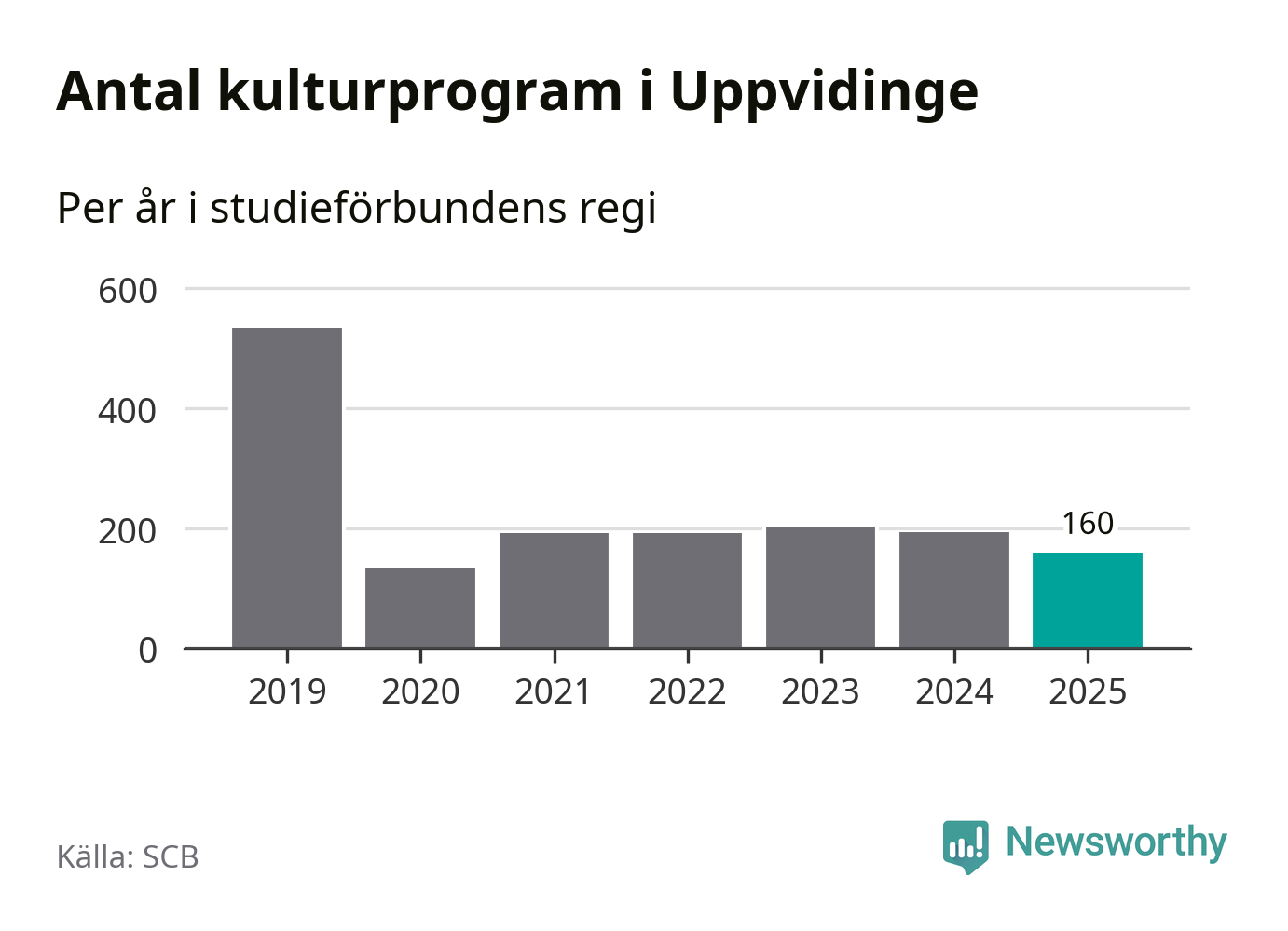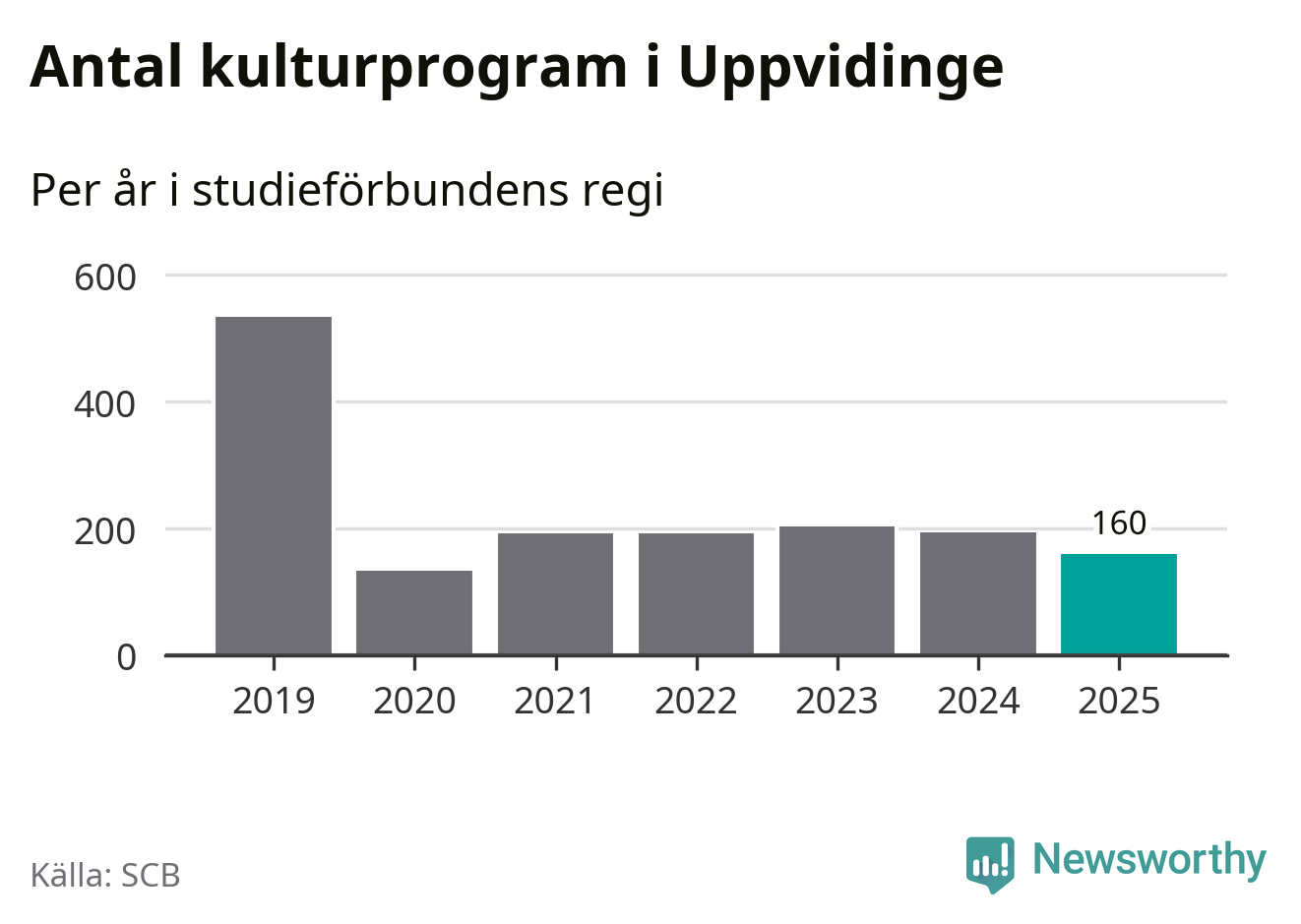 Utvecklingen ser ungefär likadan ut i Uppvidinge, förra året hade studieförbunden omkring 2 400 studietimmar i kommunen jämfört med omkring 2 500 året innan, en minskning med sju procent. Även antalet kulturprogram i studieförbundens regi minskade, från 194 till 160 stycken.