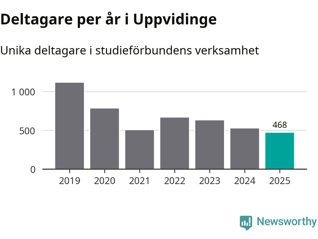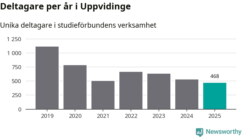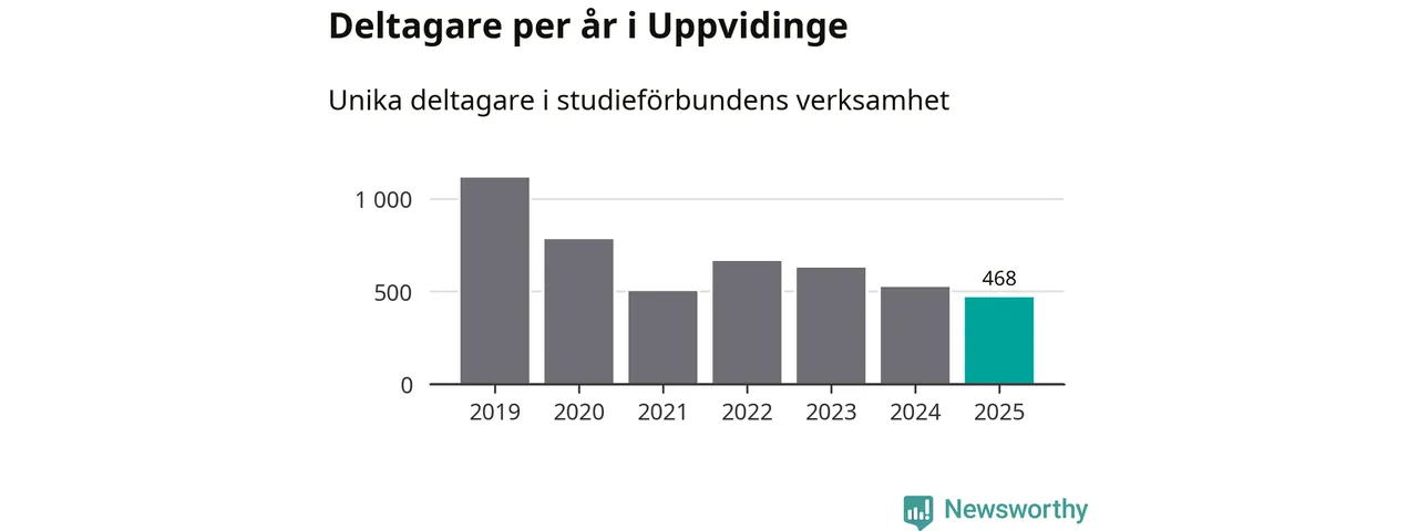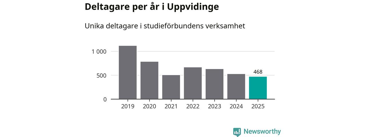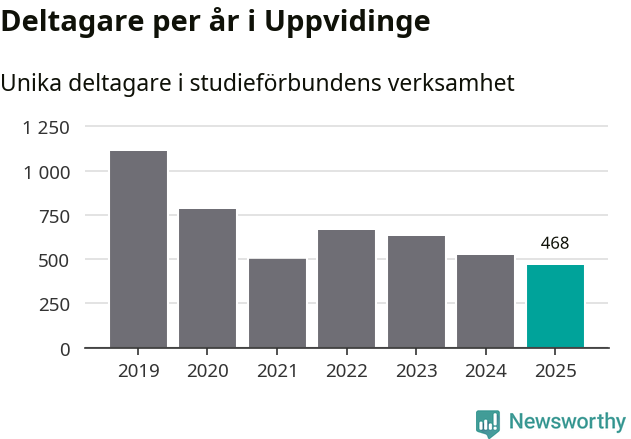 Även sett till unika deltagare är folkbildningen på tillbakagång i Uppvidinge. 2025 deltog 468 personer i studieförbundens verksamhet, vilket är en minskning med elva procent jämfört med året innan. Det innebär att fem procent av befolkningen i kommunen deltog i studieförbundens verksamhet under 2025. Det är den näst lägsta andelen i Kronoberg.