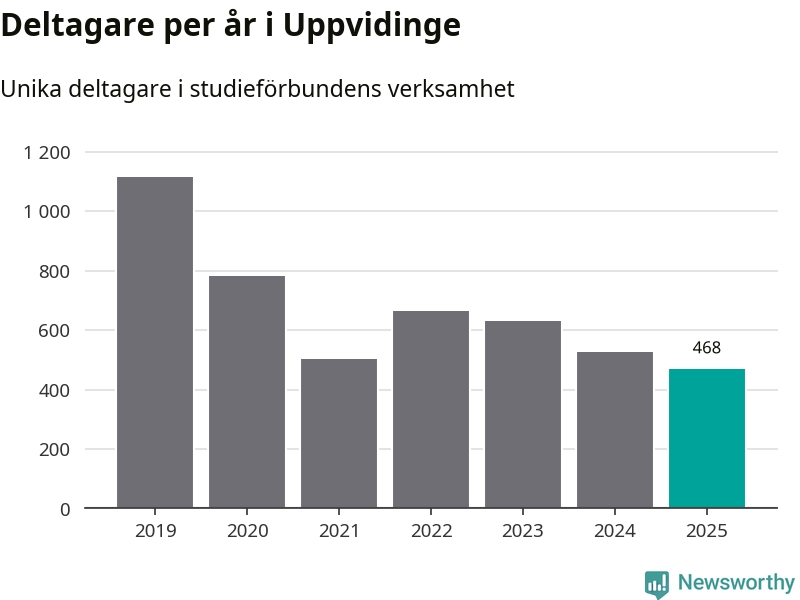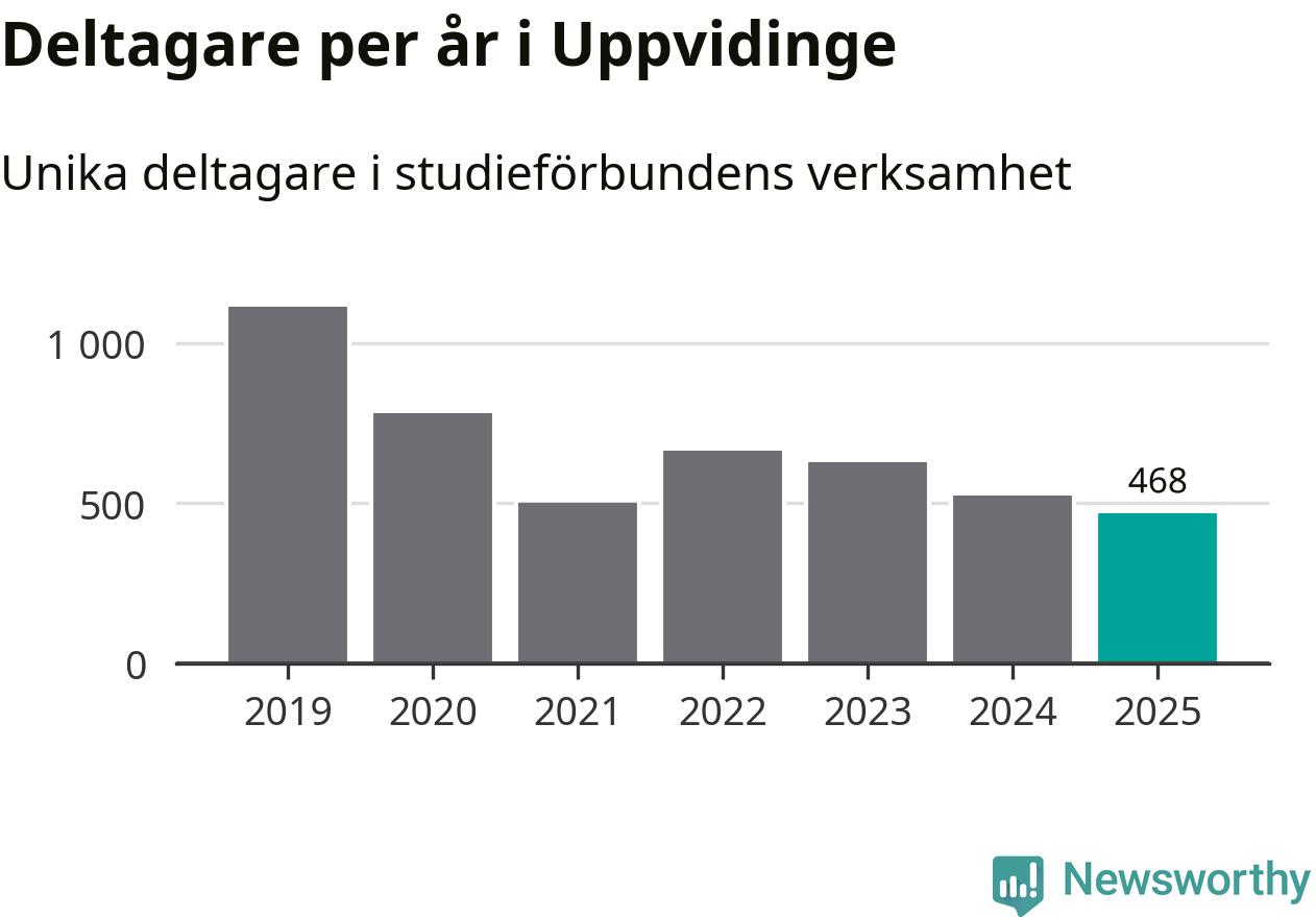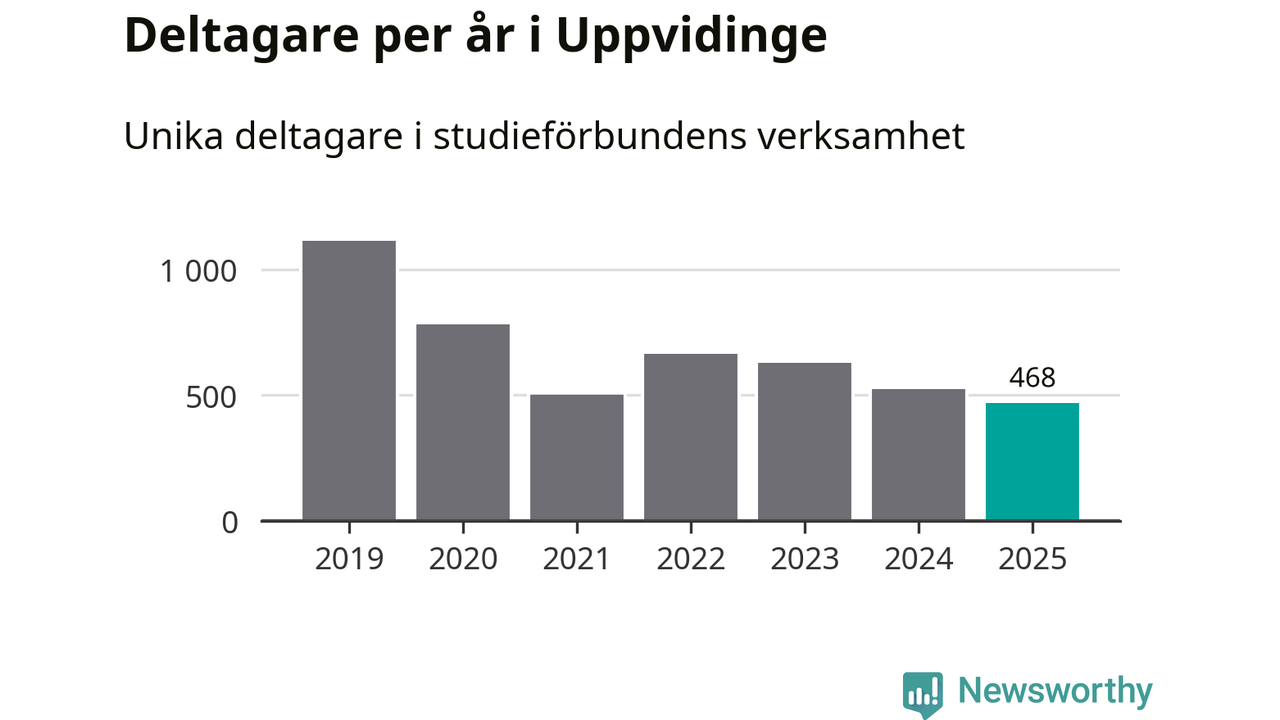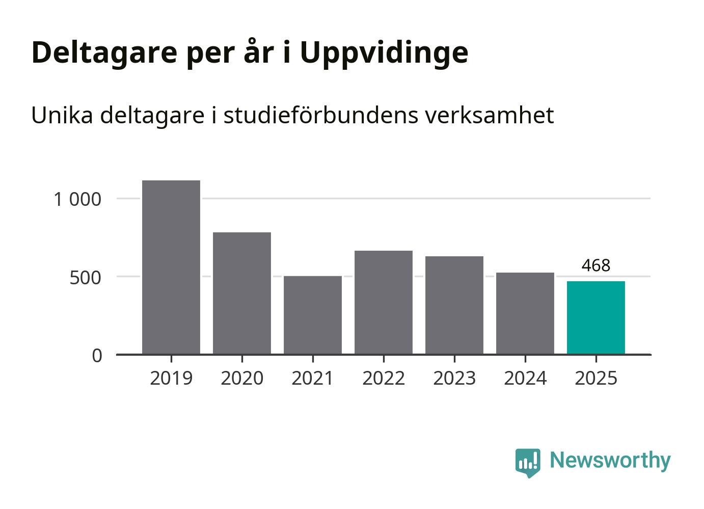 Även sett till unika deltagare är folkbildningen på tillbakagång i Uppvidinge. 2025 deltog 468 personer i studieförbundens verksamhet, vilket är en minskning med elva procent jämfört med året innan. Det innebär att fem procent av befolkningen i kommunen deltog i studieförbundens verksamhet under 2025. Det är den näst lägsta andelen i Kronoberg.