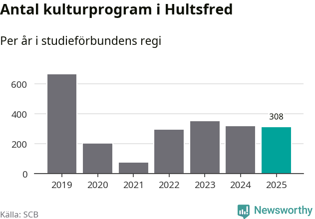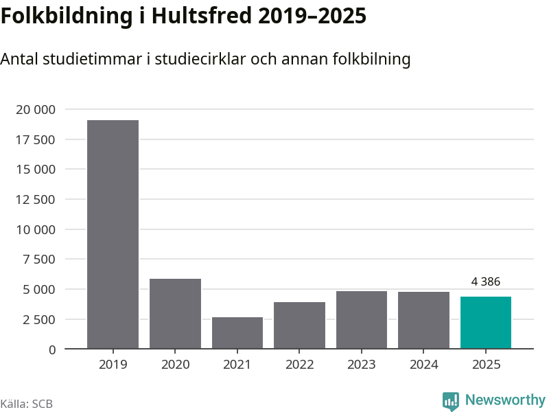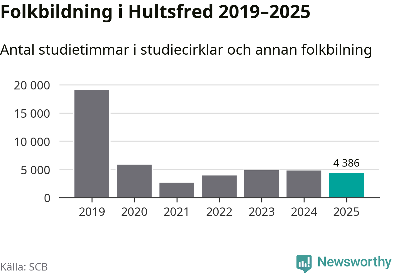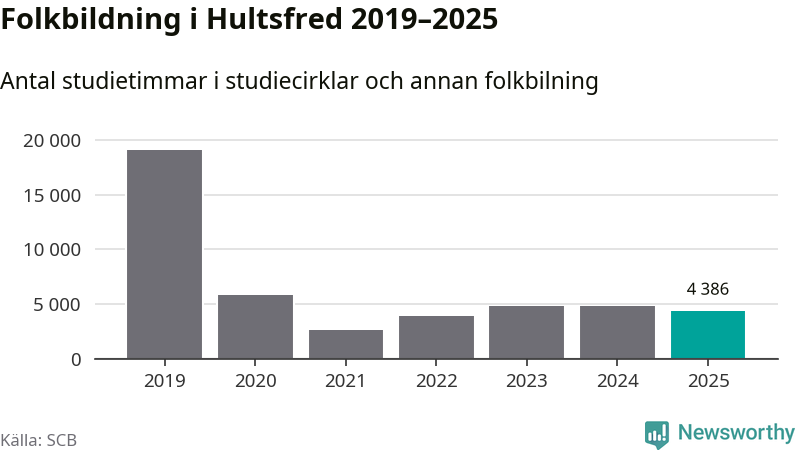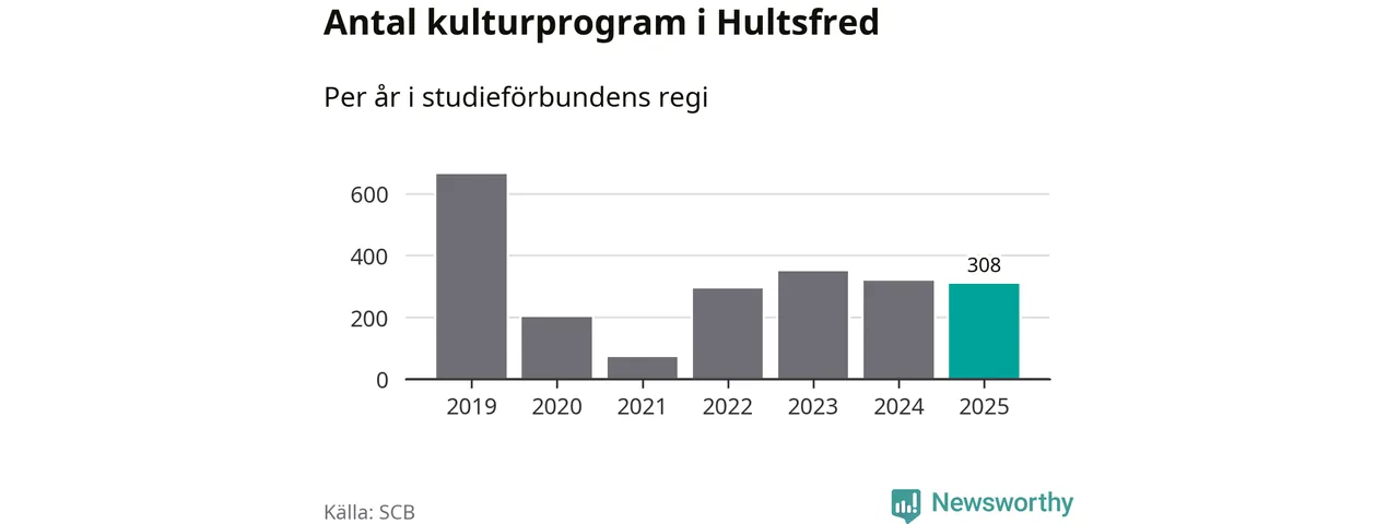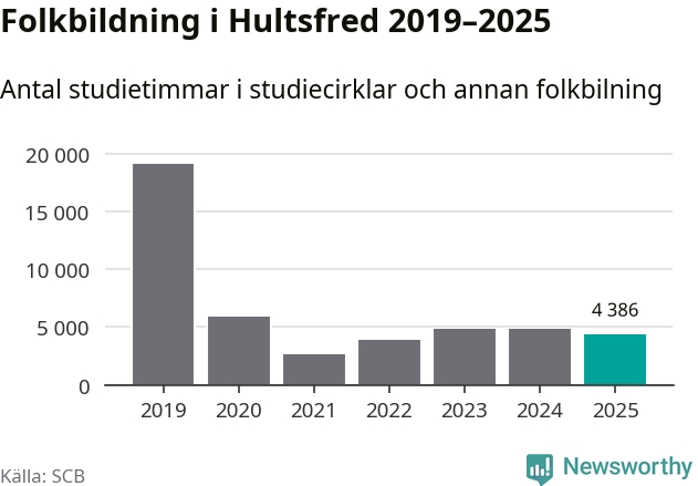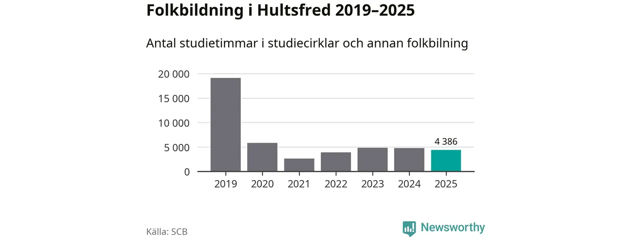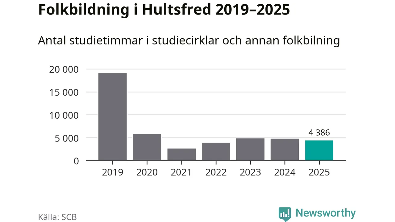 Studieförbunden drabbades hårt av pandemin. Även i Hultsfred noterades det lägsta antalet studietimmar under 2021, som då var 86 procent färre än 2019. År 2024 var antalet studietimmar åter högre men de var fortfarande långt från förpandeminivåerna.