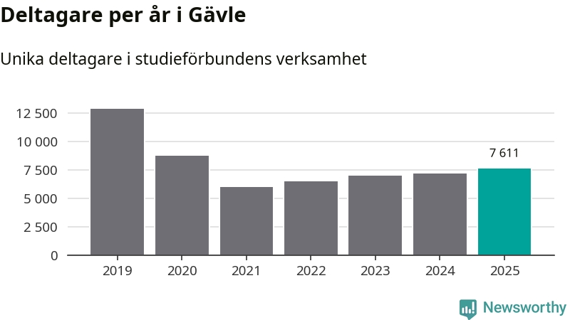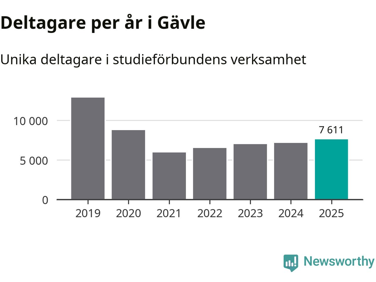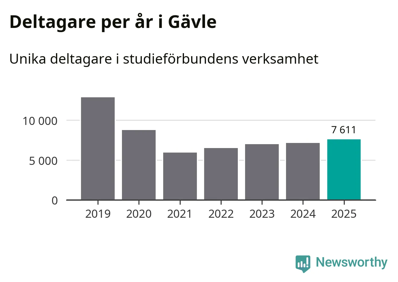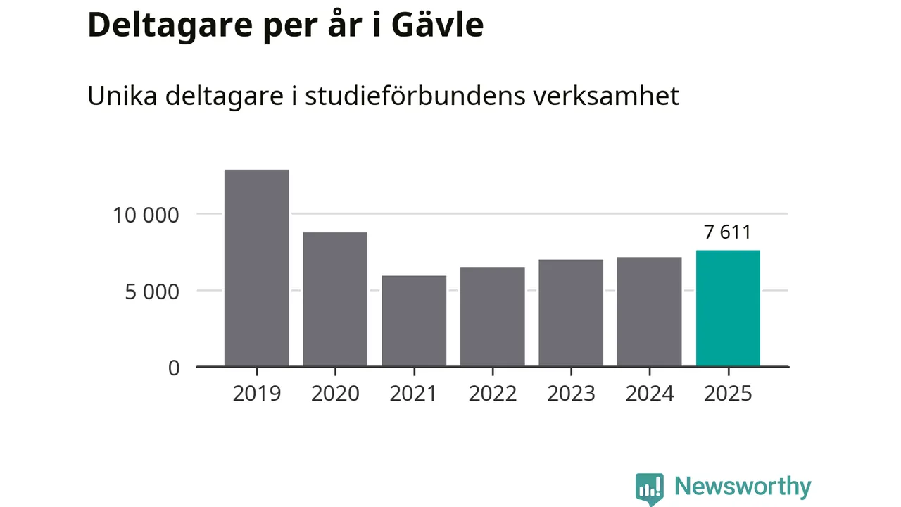 Antalet unika deltagare ökade i Gävle i fjol: från 7 147 till 7 611 personer. Det innebär att sju procent av befolkningen i kommunen deltog i studieförbundens verksamhet under 2025, vilket är ungefär som rikssnittet.