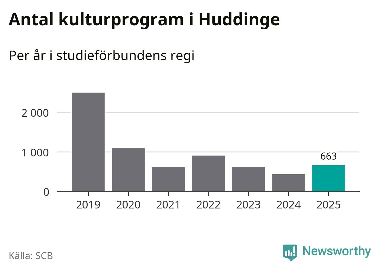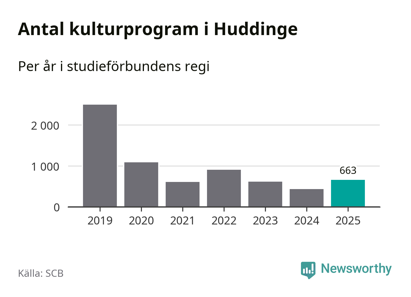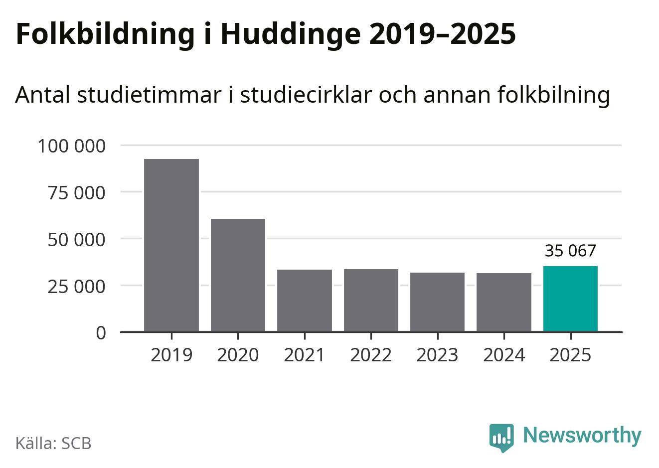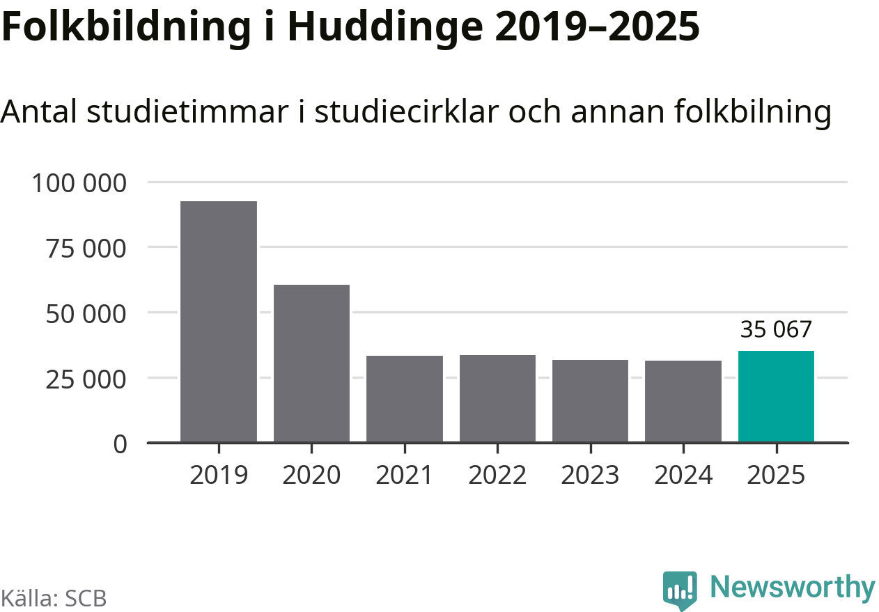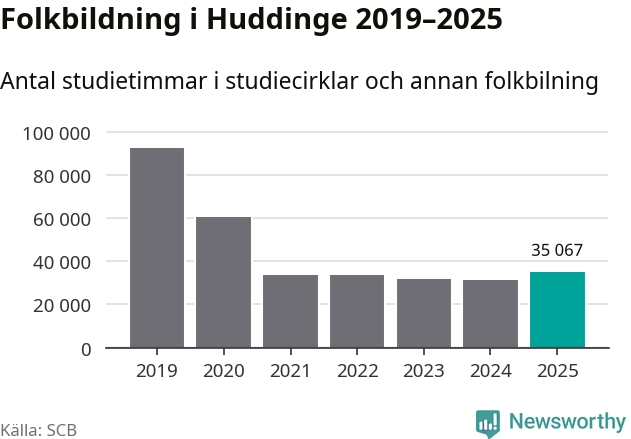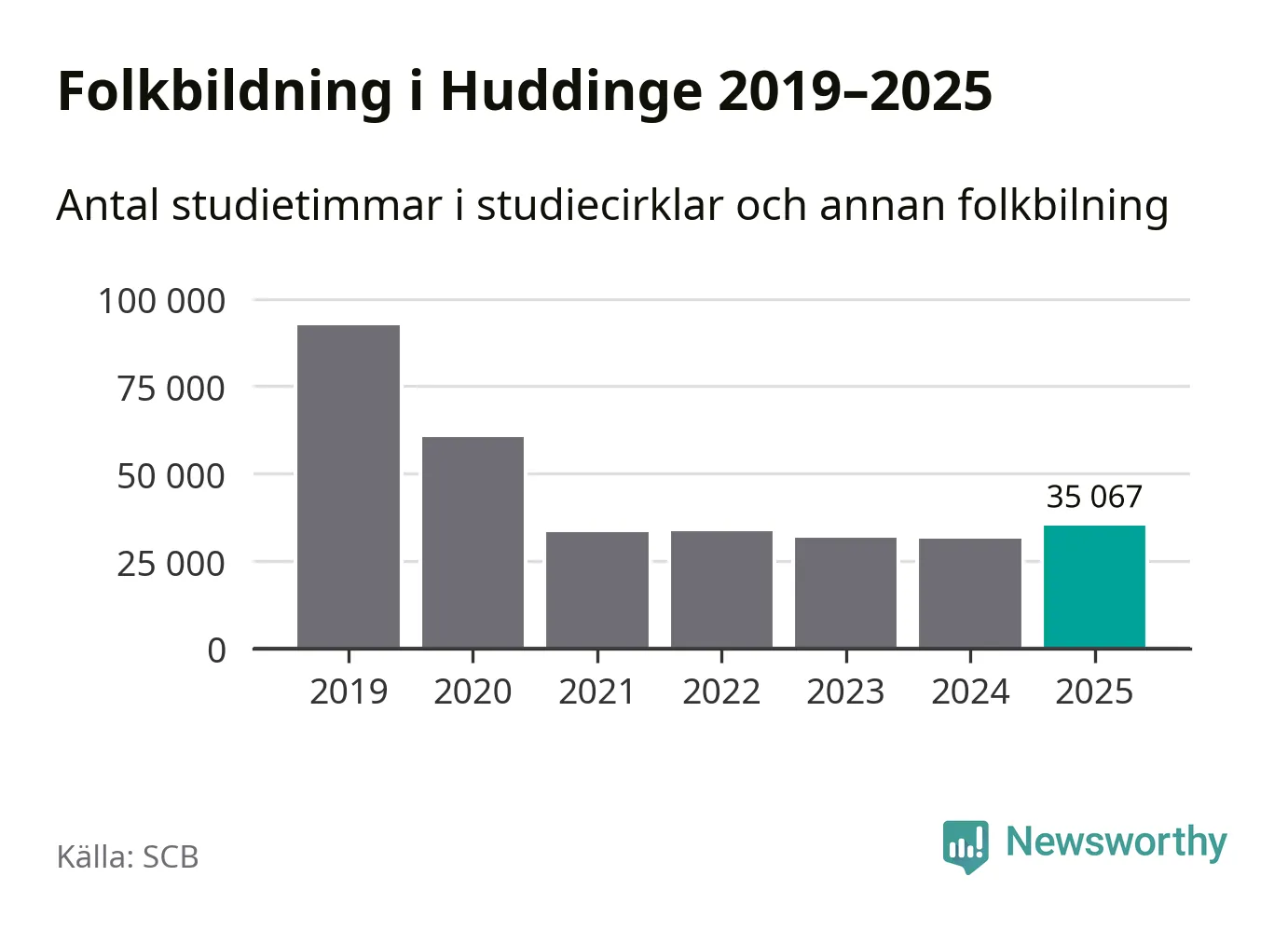 Men Huddinge är en av 80 kommuner i landet där antalet studietimmar faktiskt ökade under under fjolåret. Omkring 35 100 studietimmar innebär en ökning med 12 procent jämfört med året innan. Dessutom var antalet kulturarrangemang i studieförbundens regi fler än året innan.
