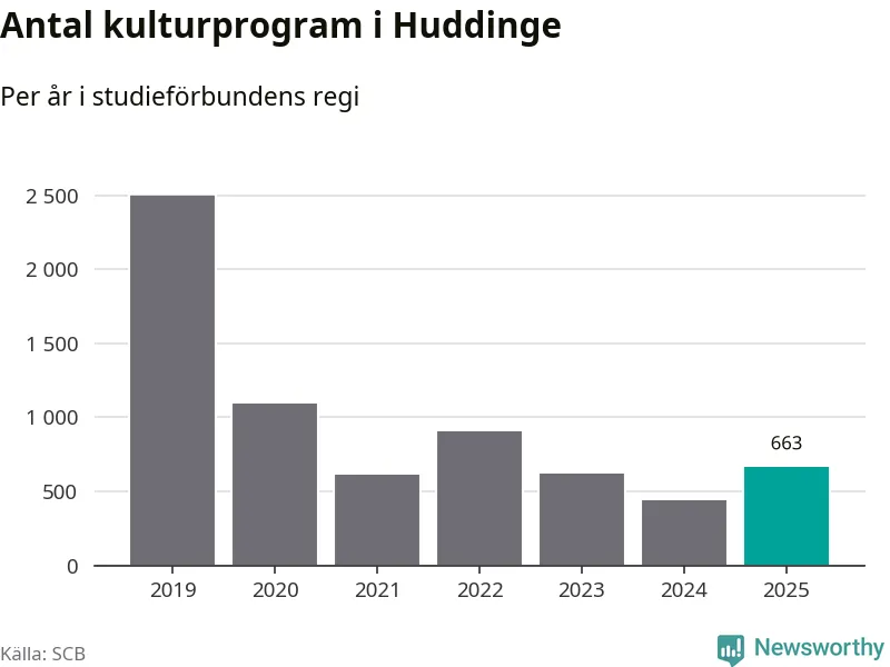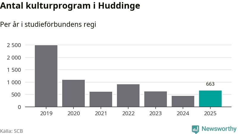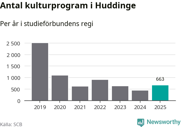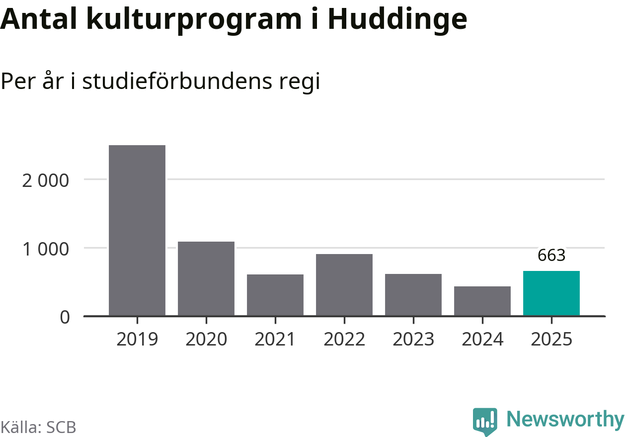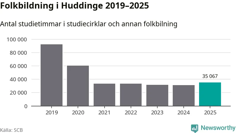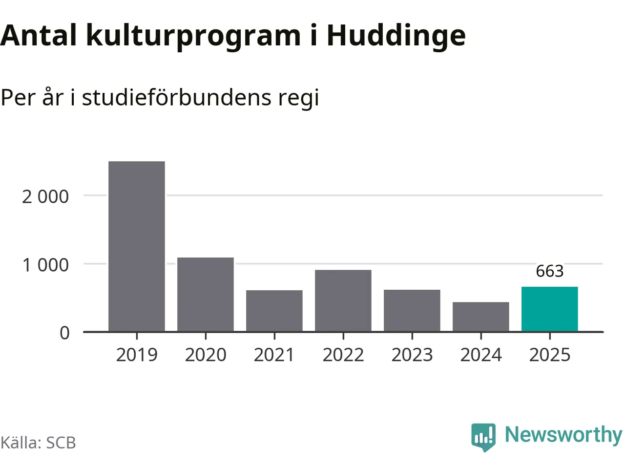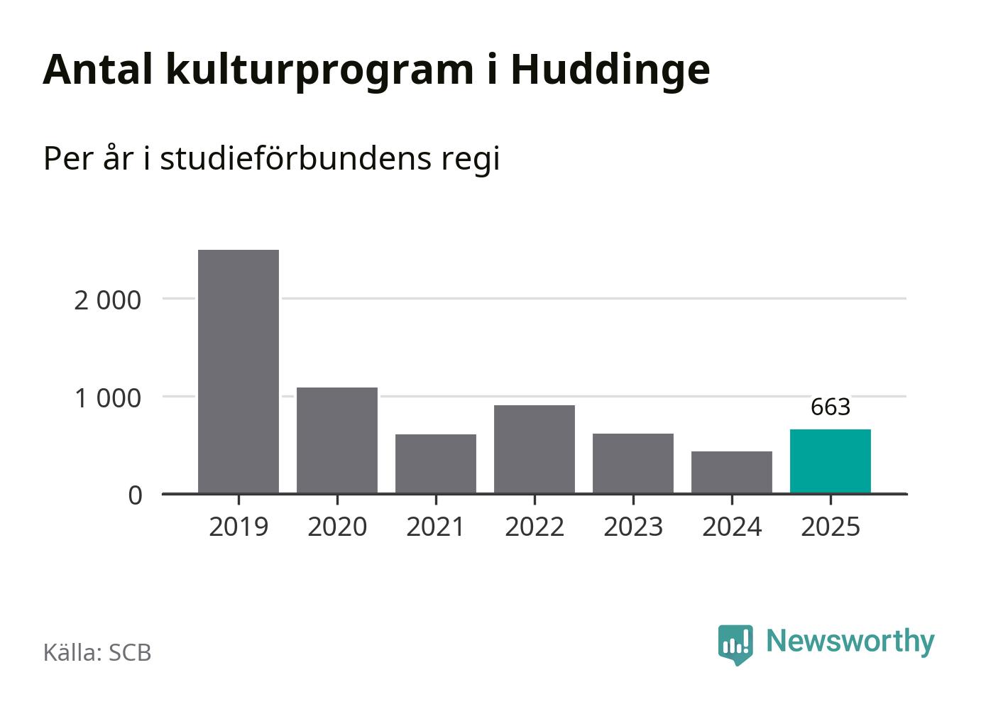 Men Huddinge är en av 80 kommuner i landet där antalet studietimmar faktiskt ökade under under fjolåret. Omkring 35 100 studietimmar innebär en ökning med 12 procent jämfört med året innan. Dessutom var antalet kulturarrangemang i studieförbundens regi fler än året innan.