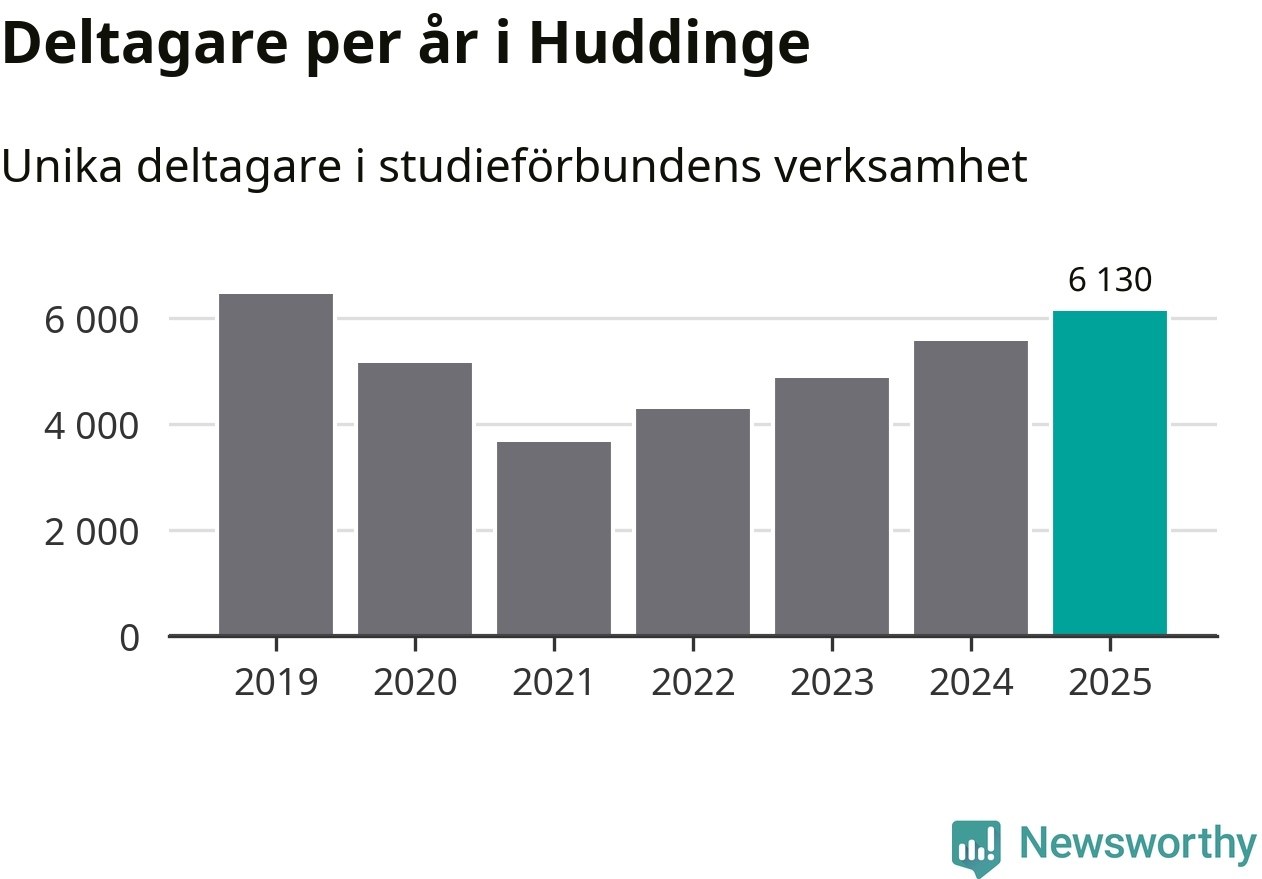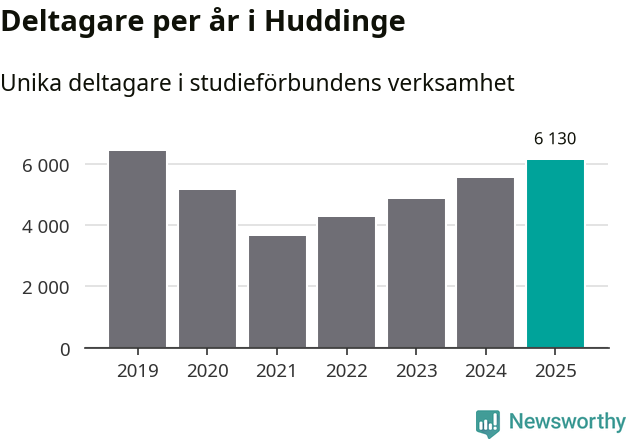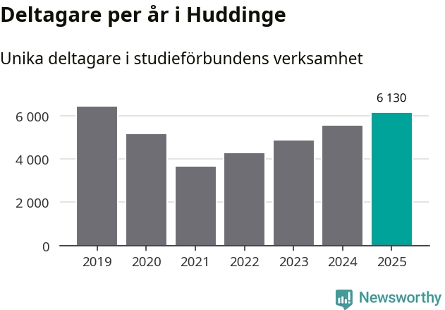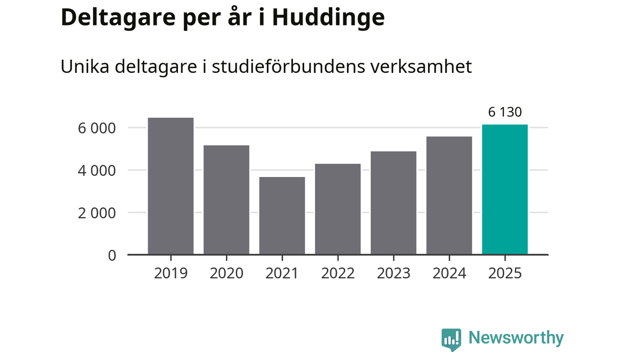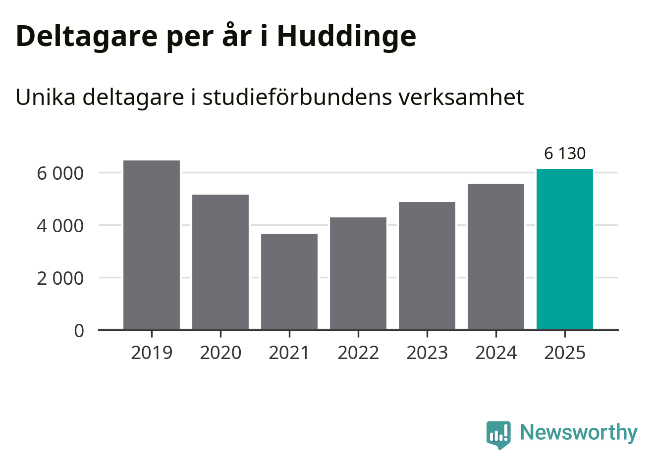 Även antalet unika deltagare ökade i Huddinge i fjol: från 5 559 till 6 130 personer. Det innebär att fem procent av befolkningen i kommunen deltog i studieförbundens verksamhet under 2025, vilket är ungefär som rikssnittet.