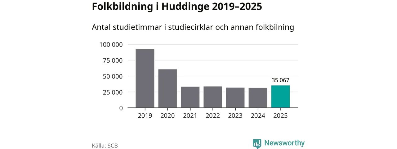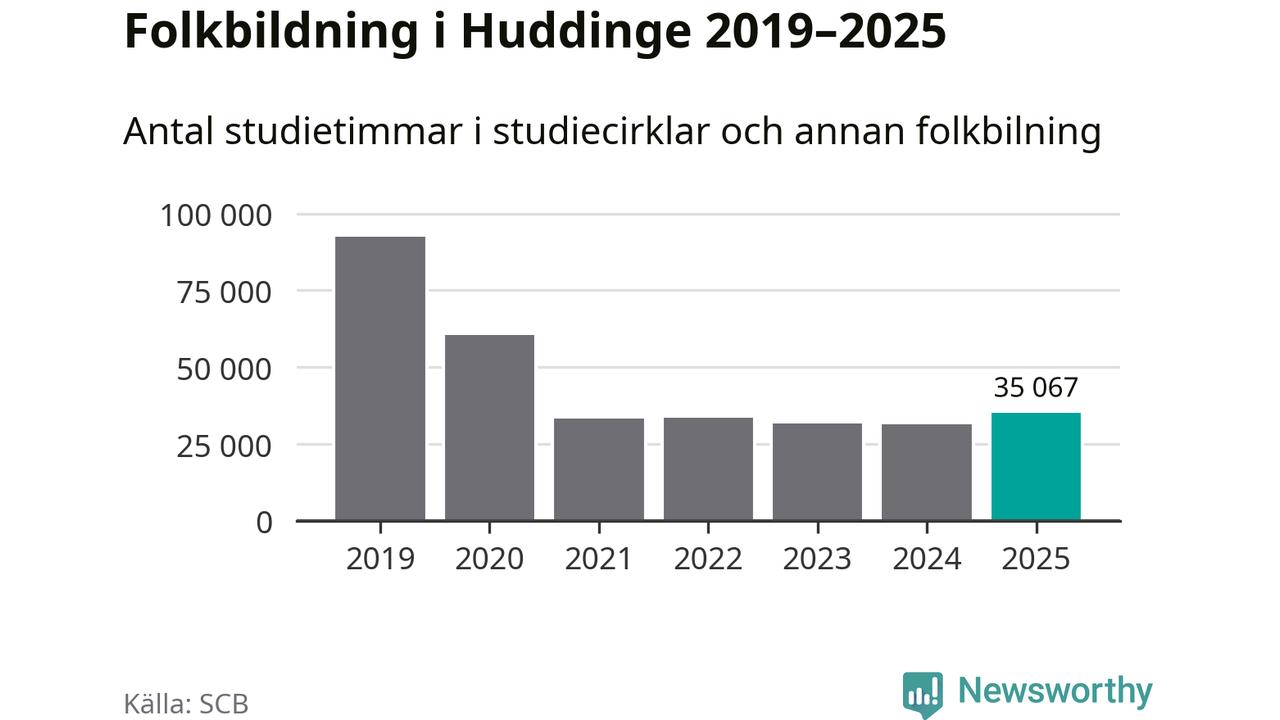 Sju av de studieförbund som 2025 fick bidrag från Folkbildningsrådet har haft någon form av verksamhet – antingen studiecirkel, annan folkbildning eller kulturprogram – i Huddinge under de två senaste åren. Under 2025 ökade fem förbund antalet studietimmar i kommunen jämfört med året innan, medan Ibn Rushd och Studiefrämjandet noterade färre timmar.