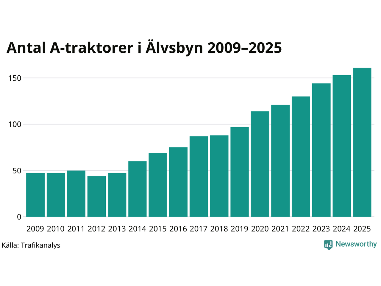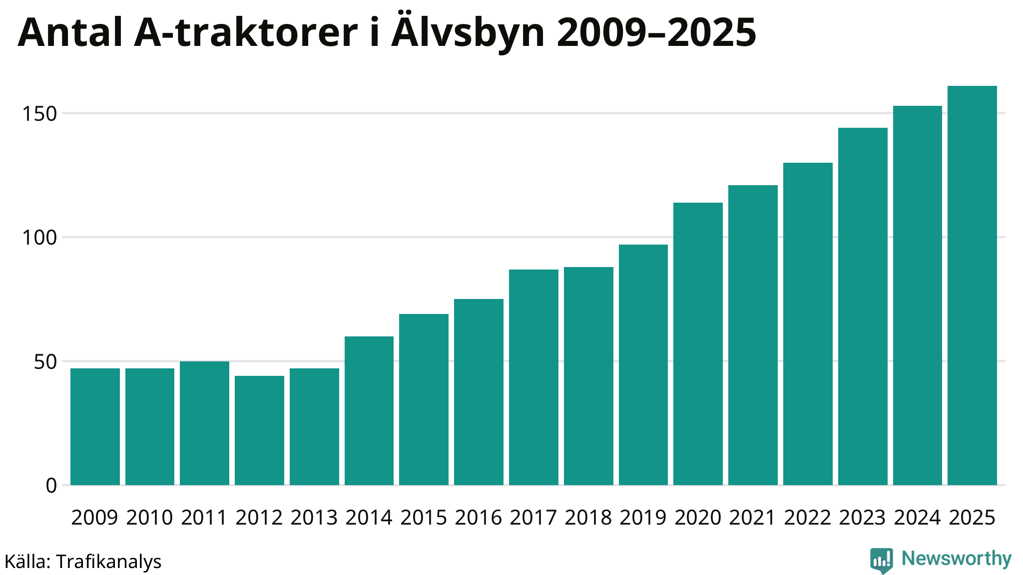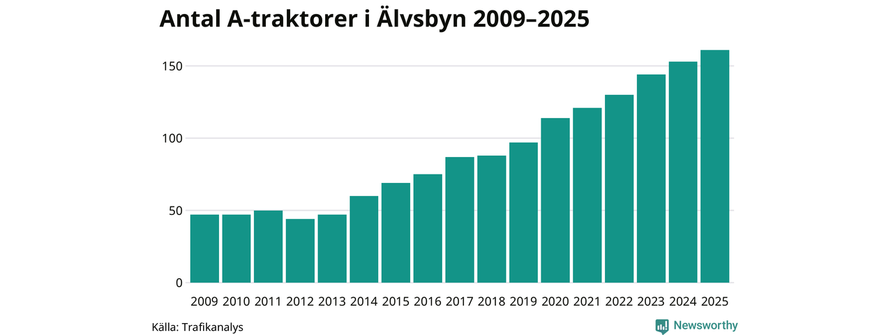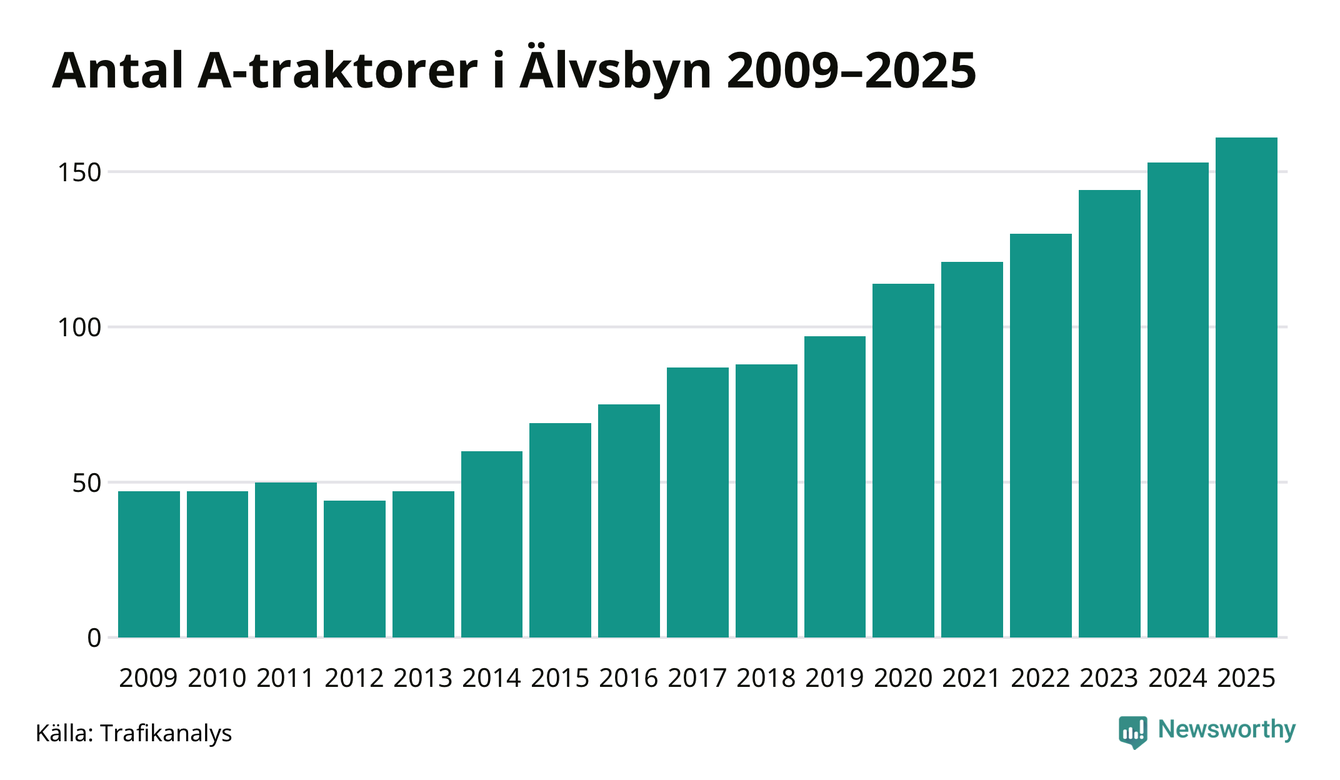 För 13:e året i rad ökar antalet A-traktorer i Älvsbyns kommun, visar nya siffror från Trafikanalys. I slutet av 2025 fanns 161 A-traktorer registrerade i kommunen, vilket är åtta mer än året innan – en ökning med 5 procent. Inte sedan åtminstone 2009, som är det första året vi har statistik för, har det funnits så många A-traktorer i kommunen.