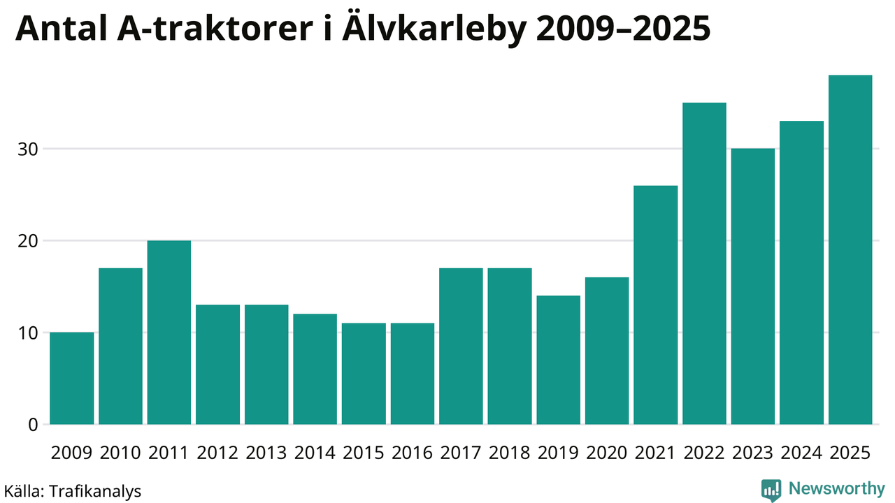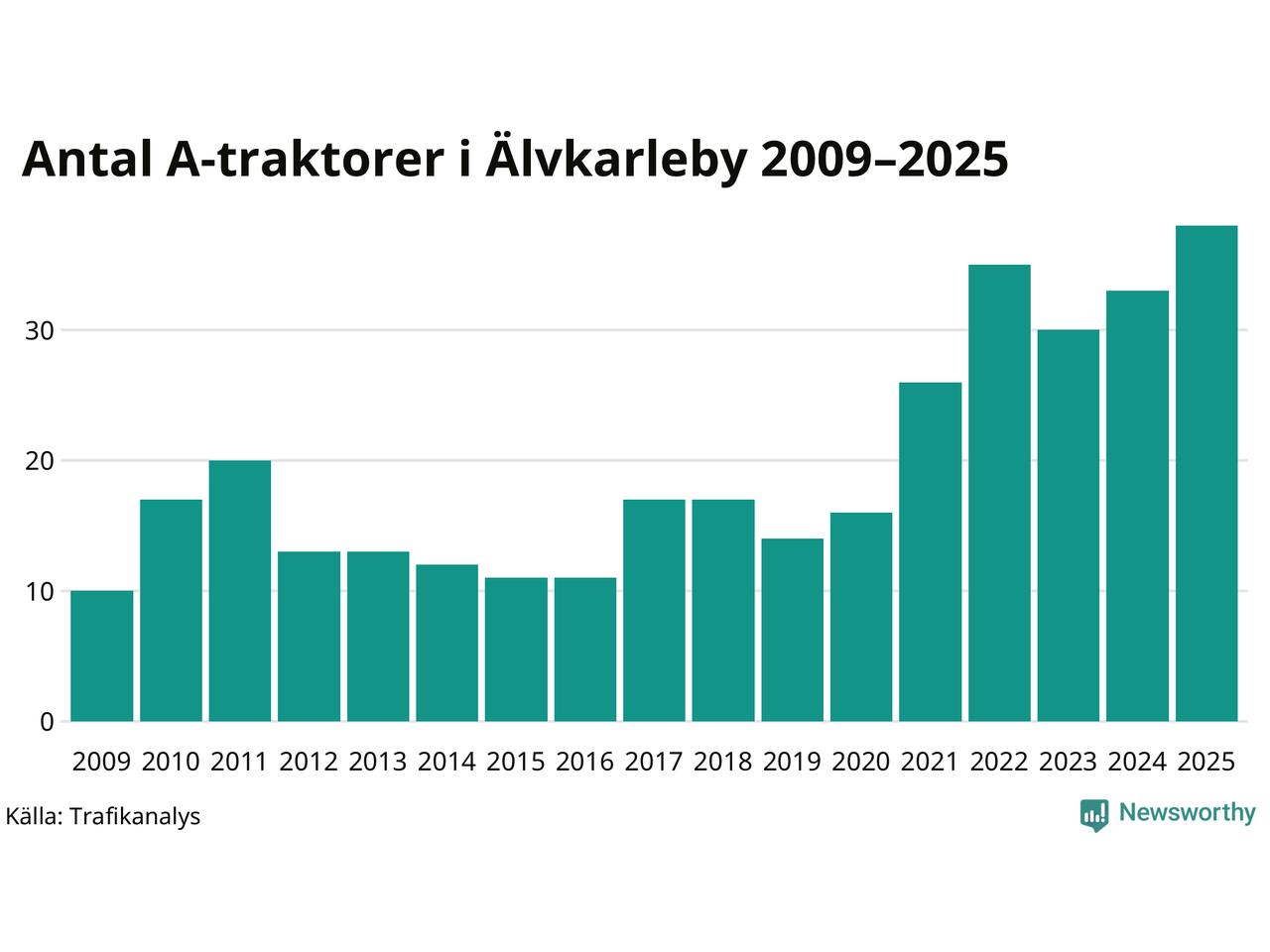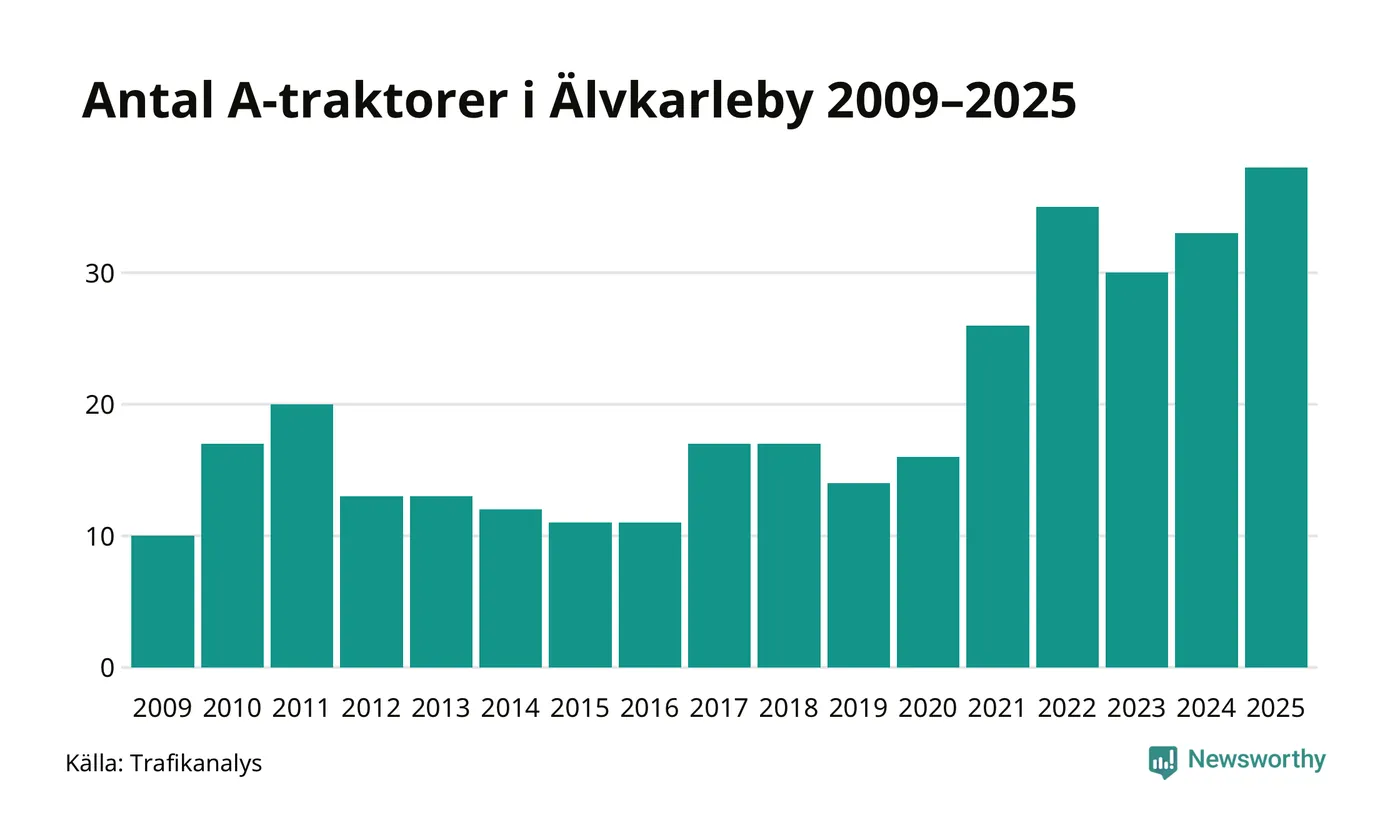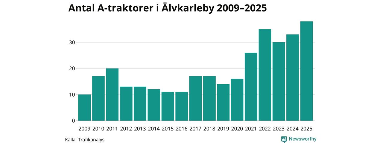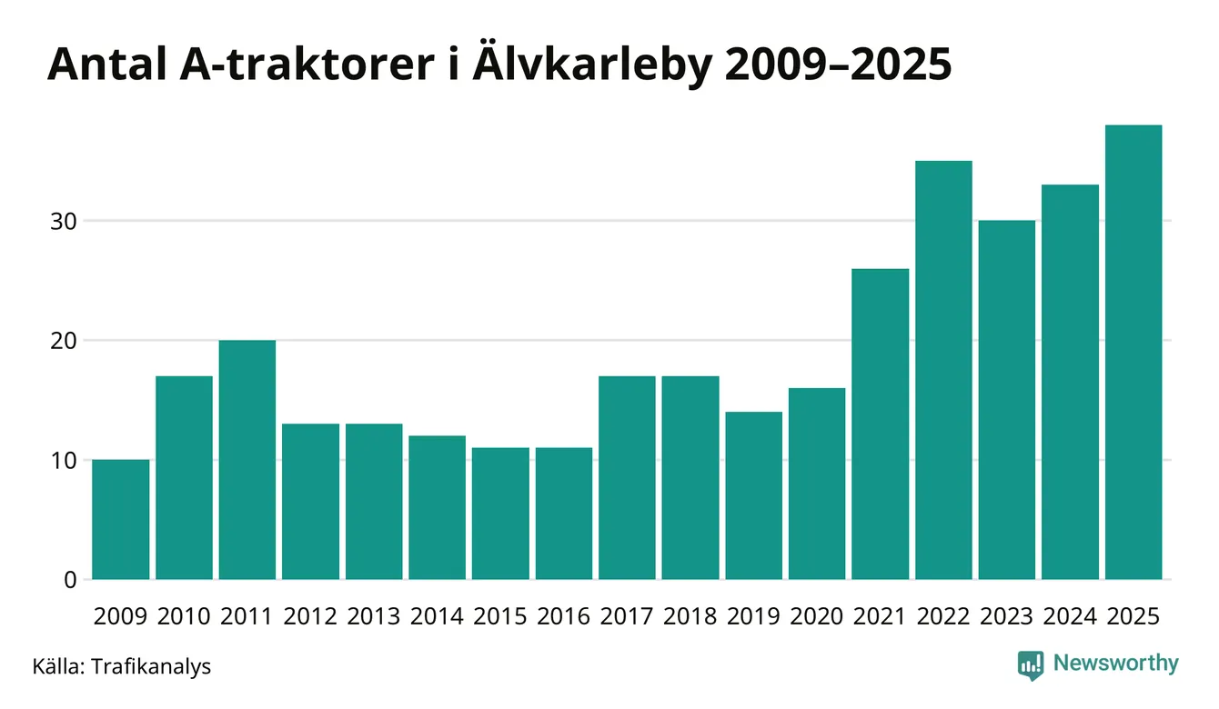 För andra året i rad ökar antalet A-traktorer i Älvkarleby kommun, visar nya siffror från Trafikanalys. I slutet av 2025 fanns 38 A-traktorer registrerade i kommunen, vilket är fem mer än året innan. Det visar nya siffror från Trafikanalys. Inte sedan åtminstone 2009, som är det första året vi har statistik för, har det funnits så många A-traktorer i kommunen.