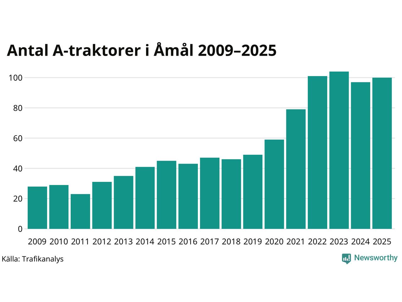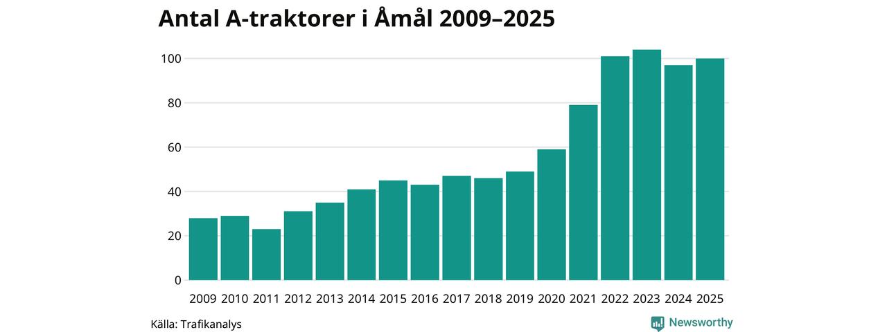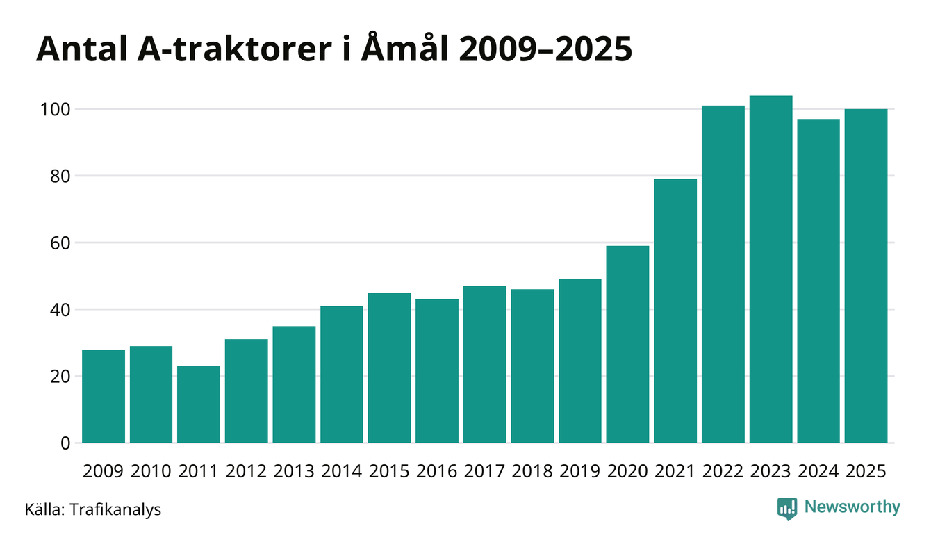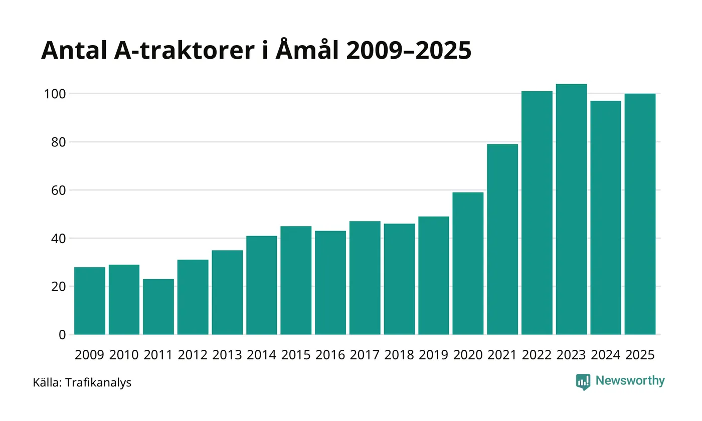 I slutet av 2025 fanns 100 A-traktorer registrerade i Åmåls kommun, vilket är tre mer än året innan. Det visar nya siffror från Trafikanalys.
