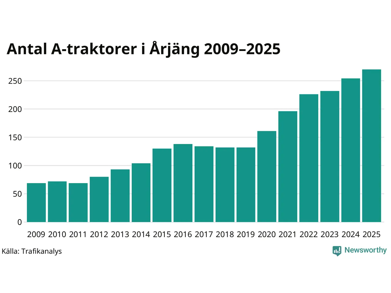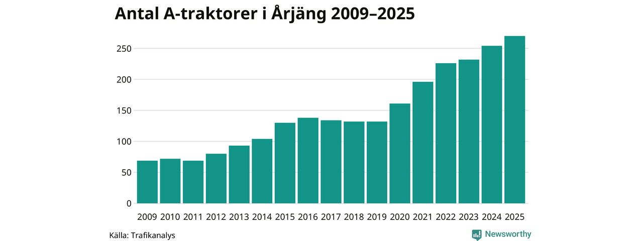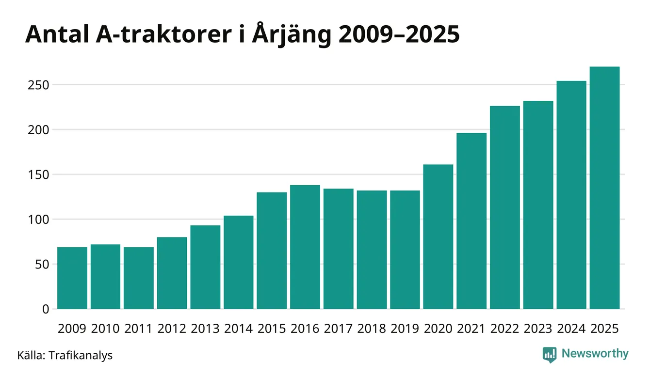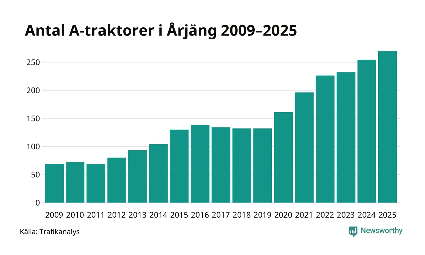 För sjätte året i rad ökar antalet A-traktorer i Årjängs kommun, visar nya siffror från Trafikanalys. I slutet av 2025 fanns 270 A-traktorer registrerade i kommunen, vilket är 16 mer än året innan – en ökning med 6 procent. Inte sedan åtminstone 2009, som är det första året vi har statistik för, har det funnits så många A-traktorer i kommunen.