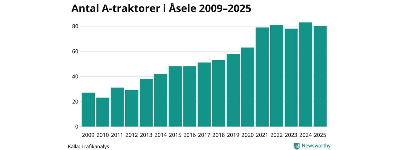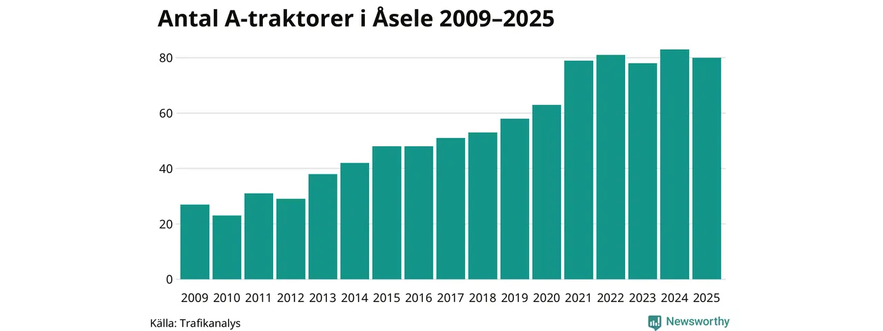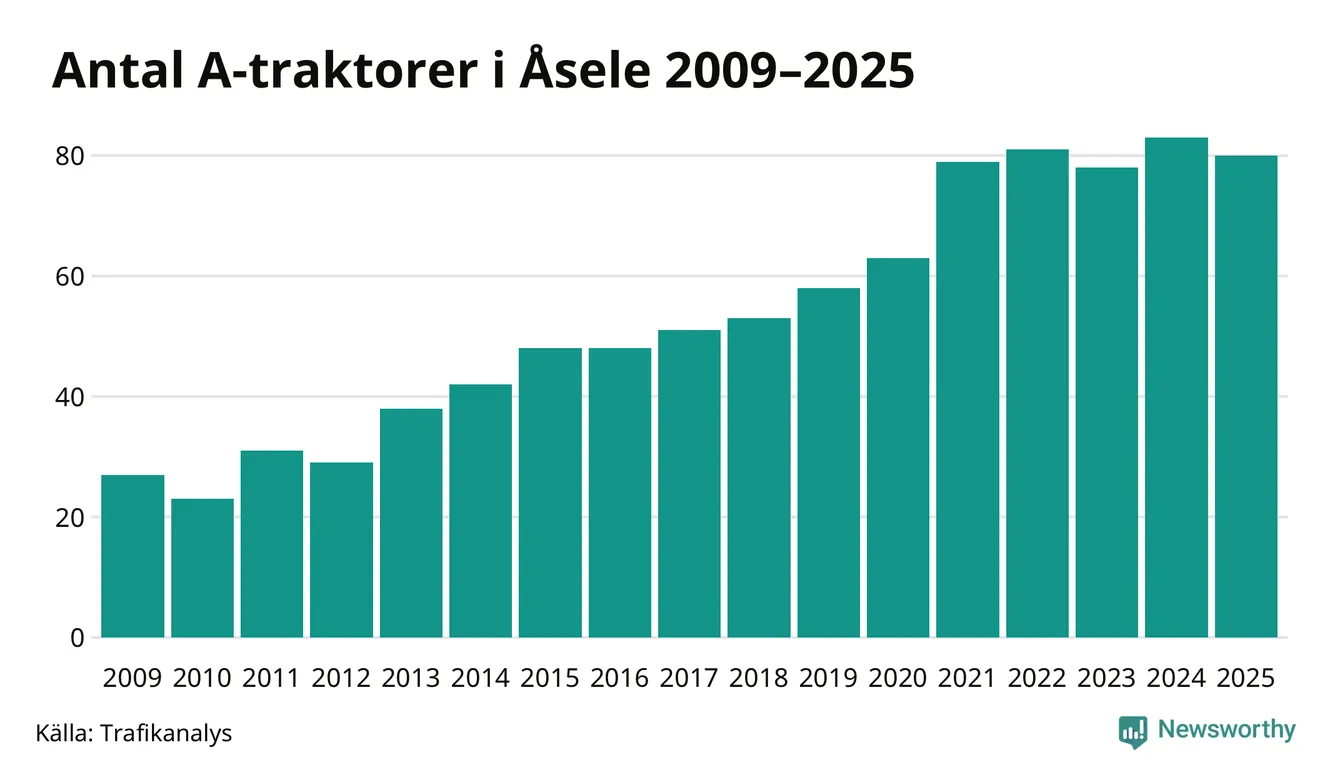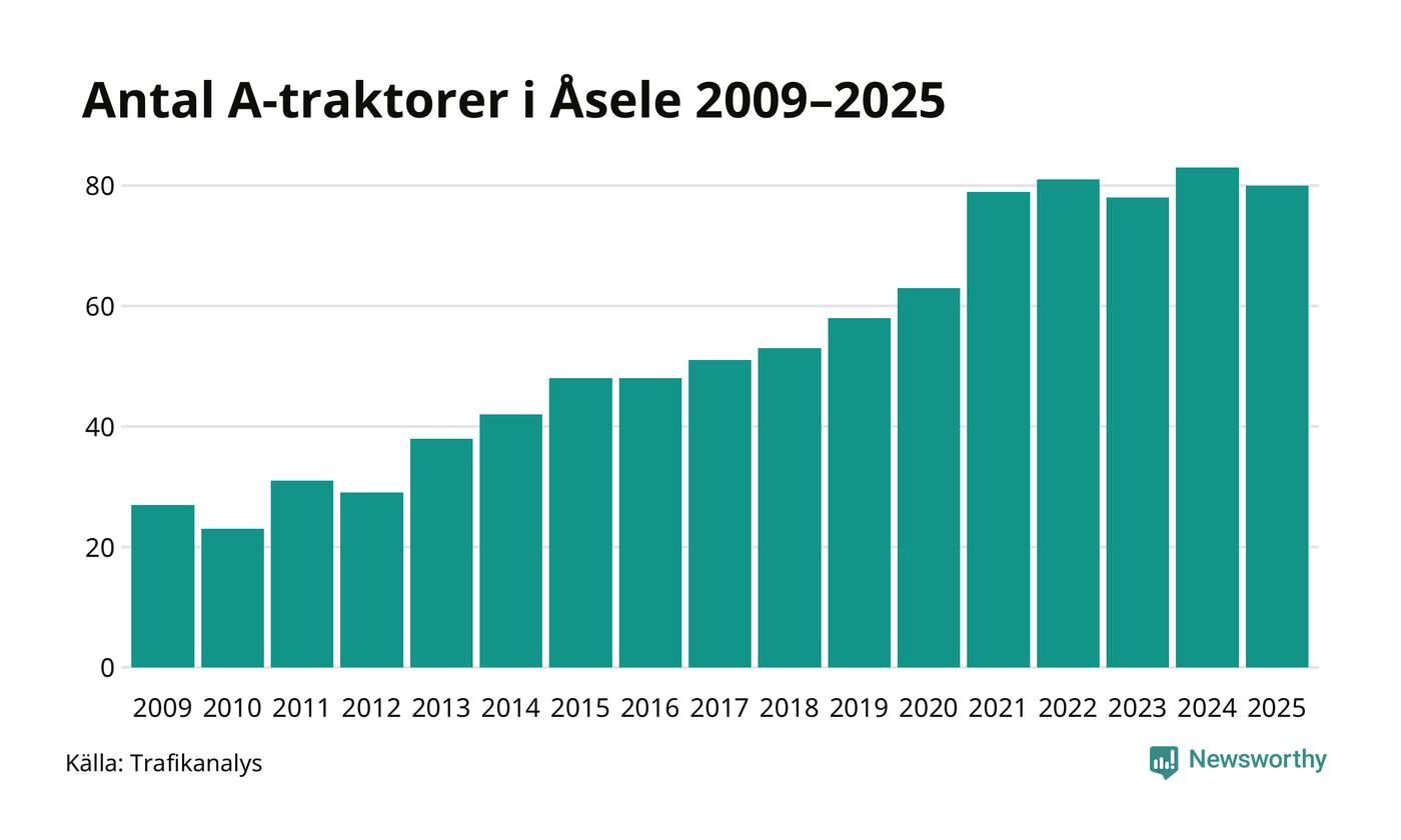 I slutet av 2025 fanns 80 A-traktorer registrerade i Åsele kommun, vilket är tre mindre än året innan. Det visar nya siffror från Trafikanalys.