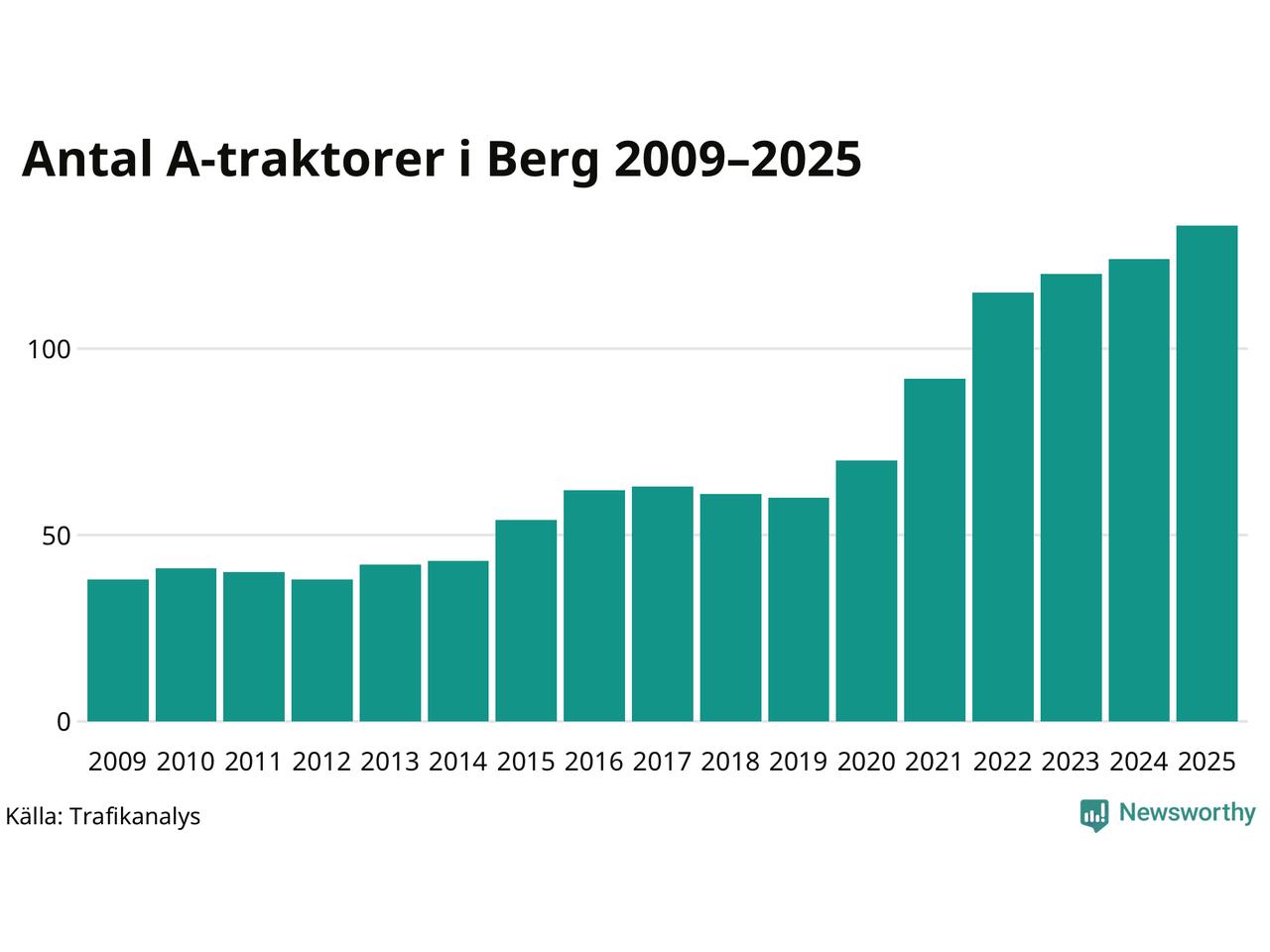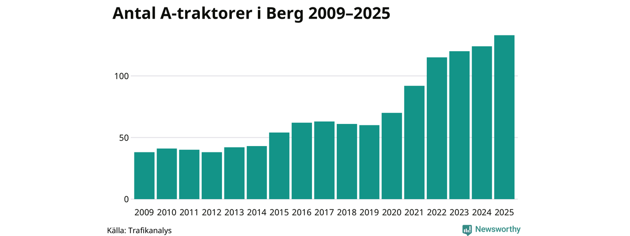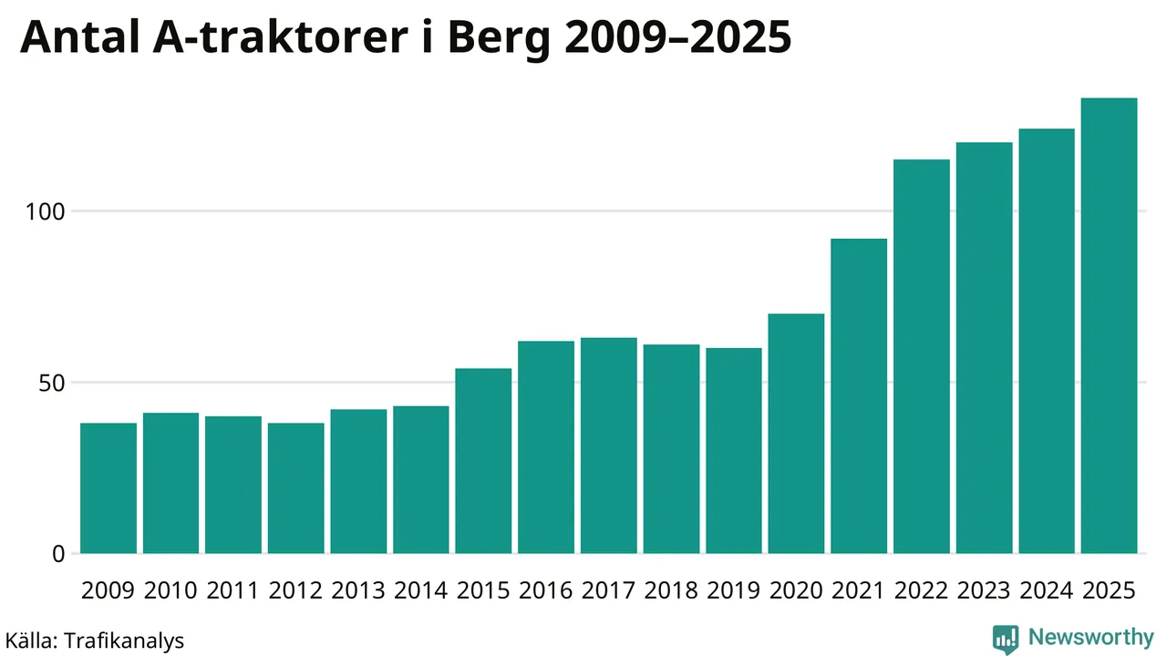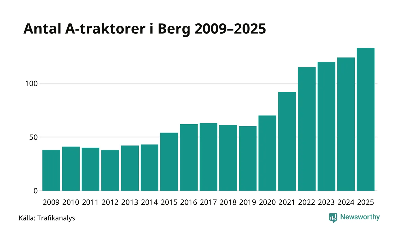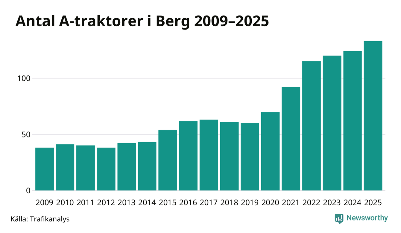 För sjätte året i rad ökar antalet A-traktorer i Bergs kommun, visar nya siffror från Trafikanalys. I slutet av 2025 fanns 133 A-traktorer registrerade i kommunen, vilket är nio mer än året innan – en ökning med 7 procent. Inte sedan åtminstone 2009, som är det första året vi har statistik för, har det funnits så många A-traktorer i kommunen.