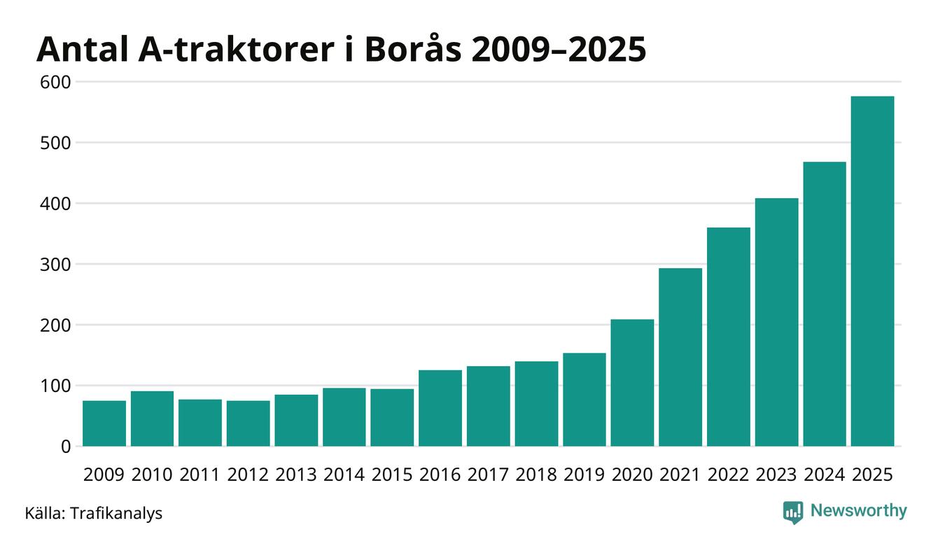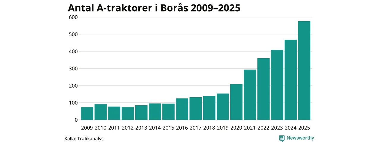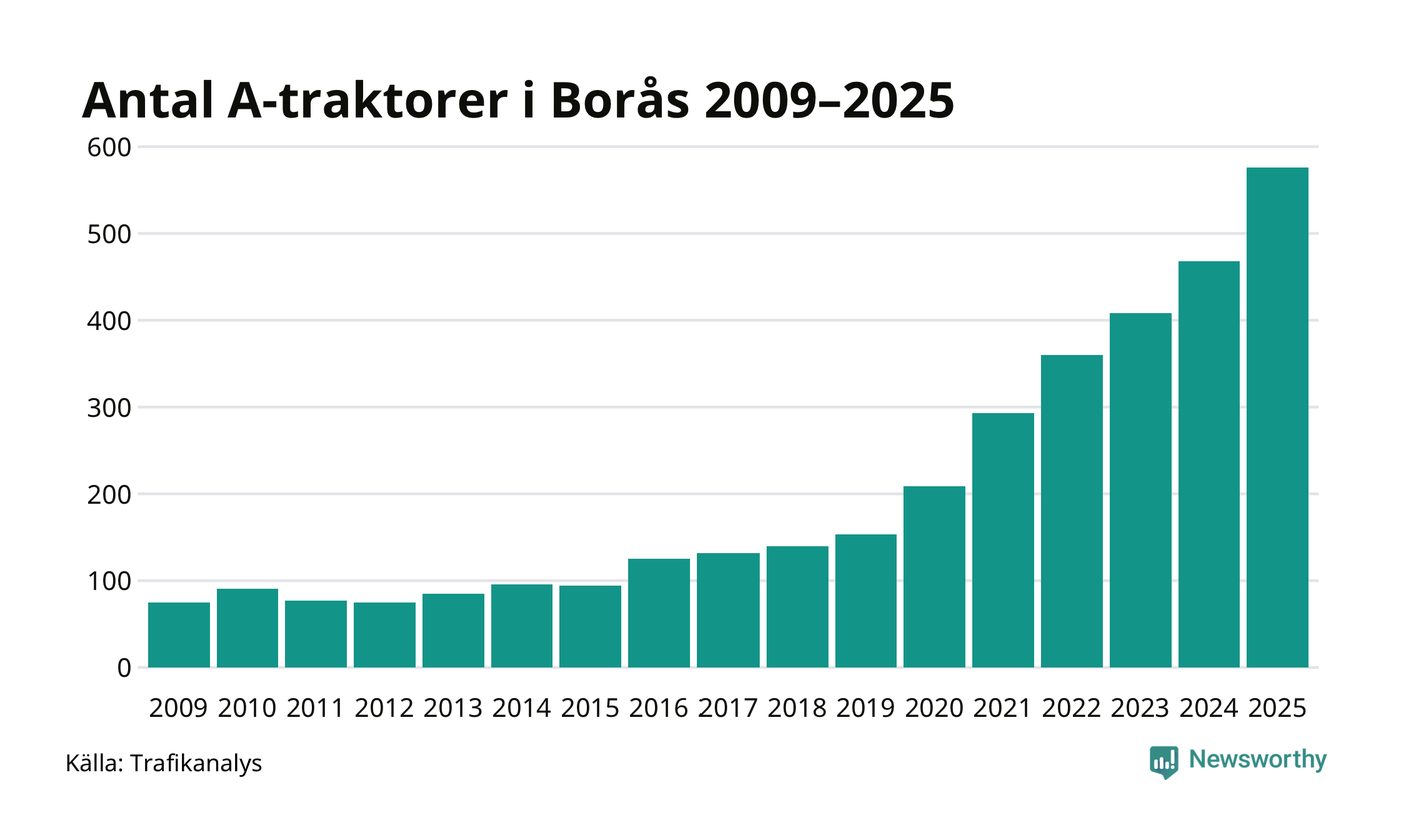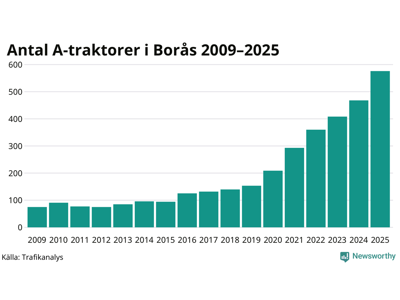 Under det senaste decenniet har antalet A-traktorer femdubblats i Sverige – och under 2025 fortsatte utvecklingen. Ökningen i Borås kommun är den största hittills.
