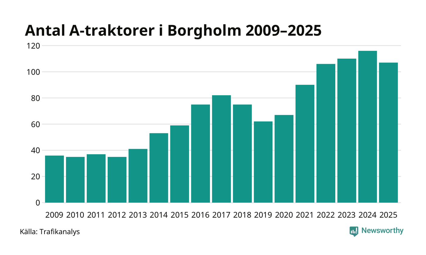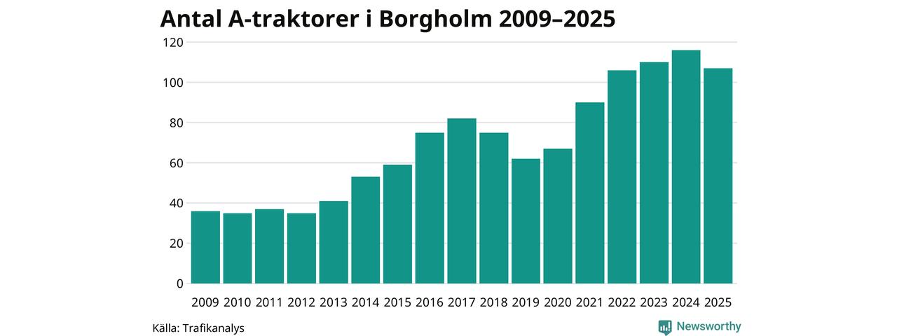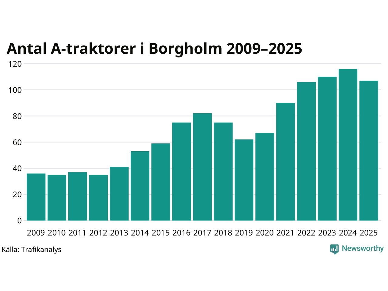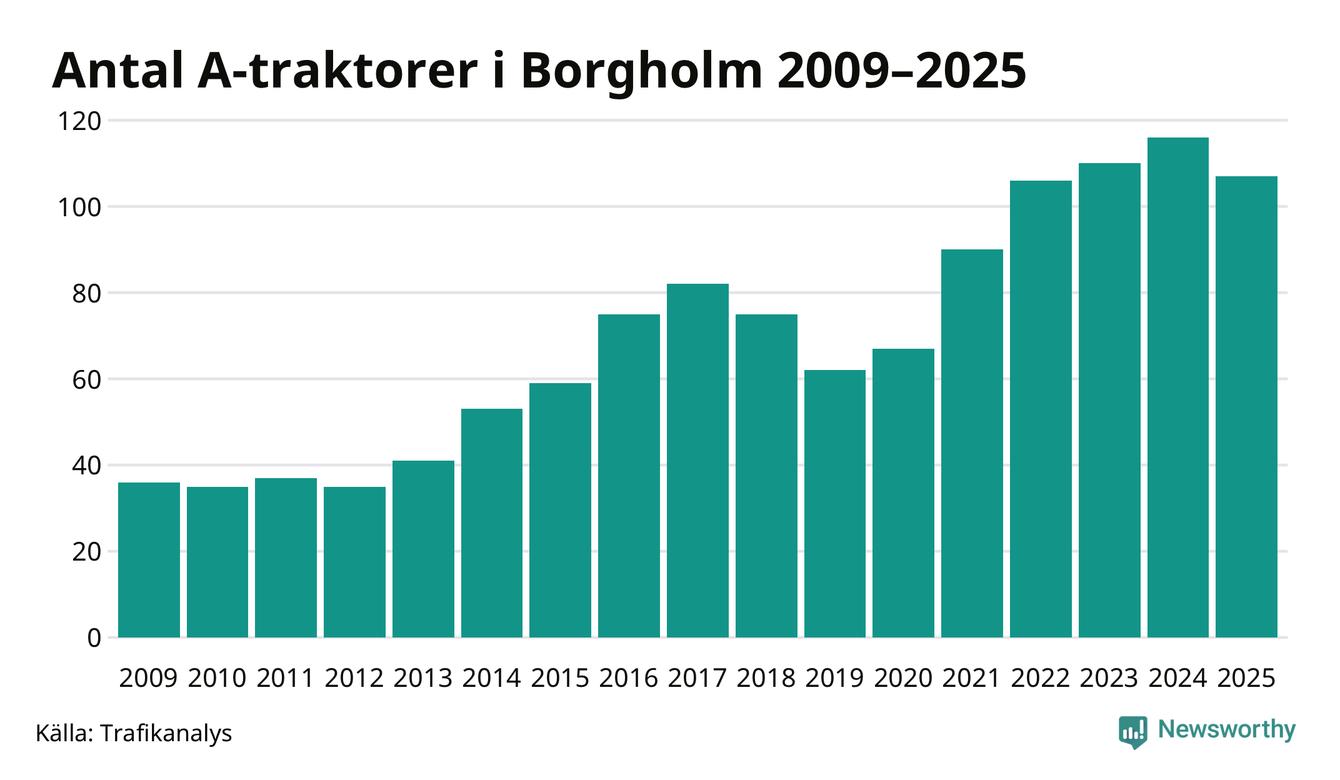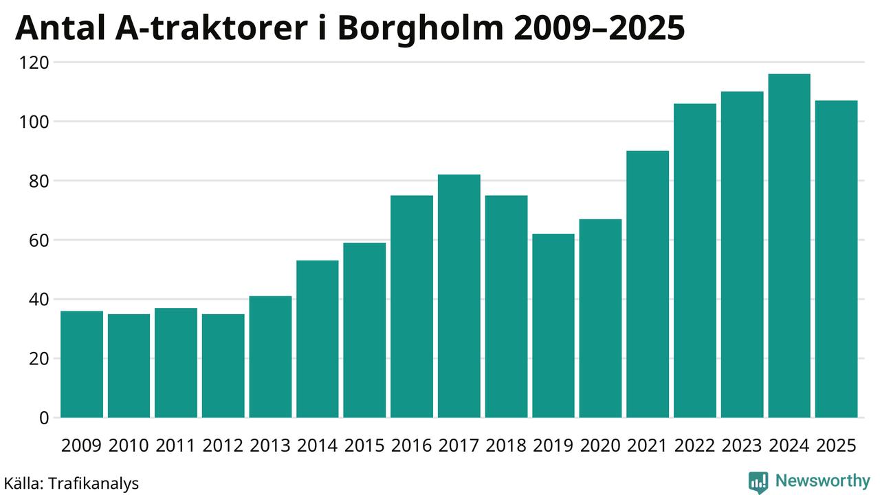 Under det senaste decenniet har antalet A-traktorer femdubblats i Sverige, och under 2025 fortsatte utvecklingen. Men i Borgholms kommun blev A-traktorerna färre. Det är första gången sedan 2019 som antalet inte ökar.