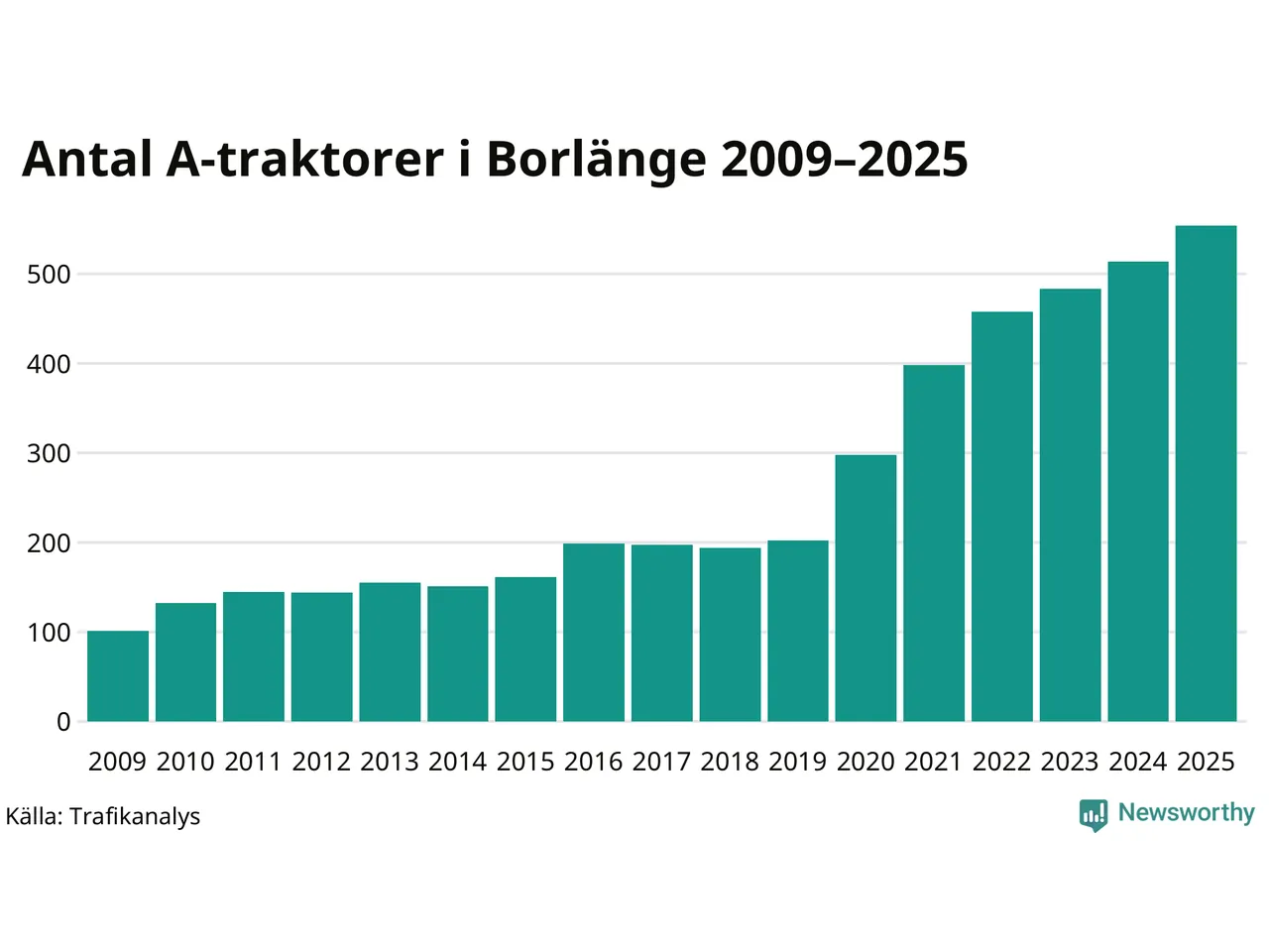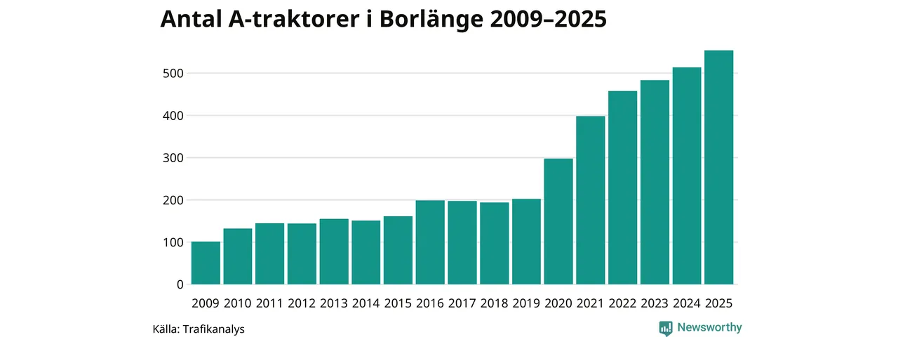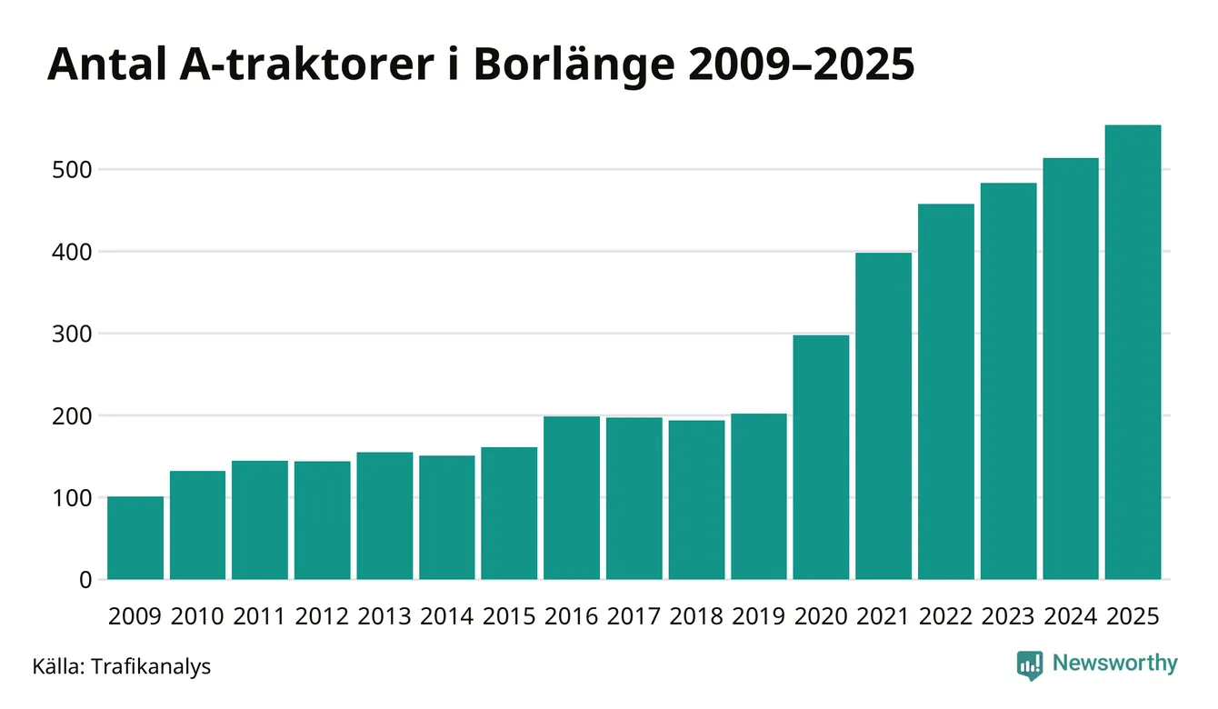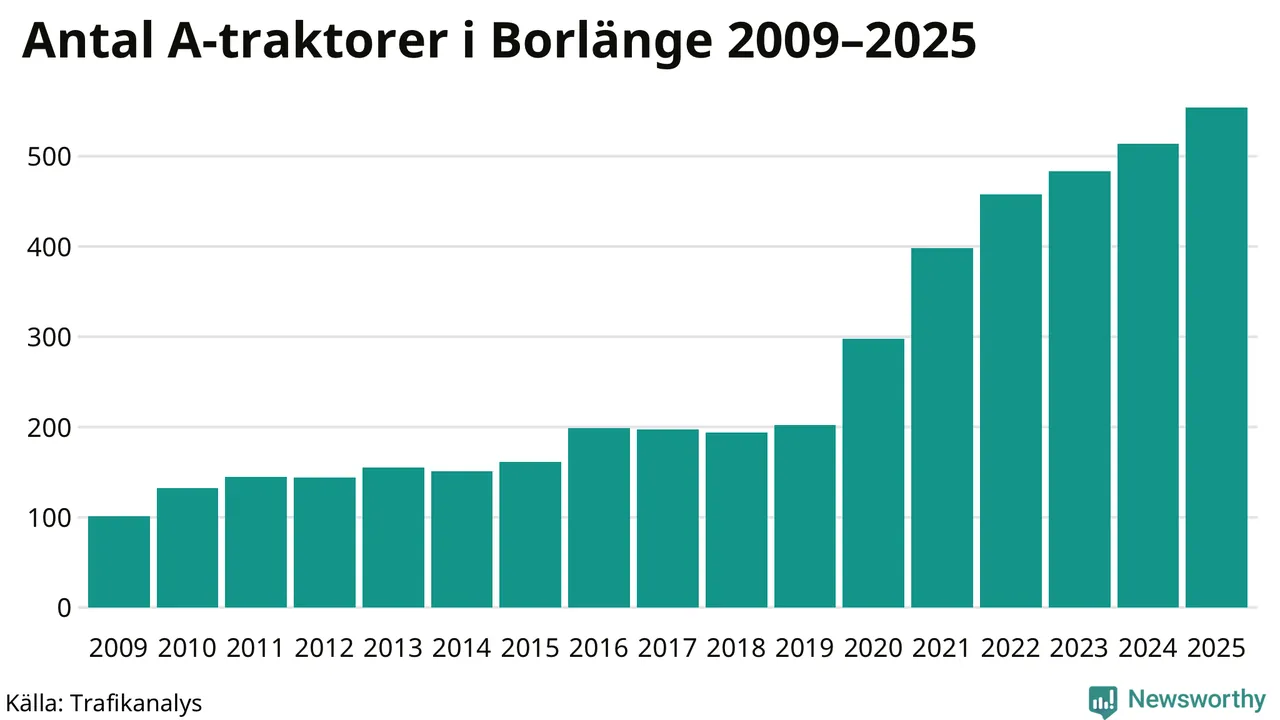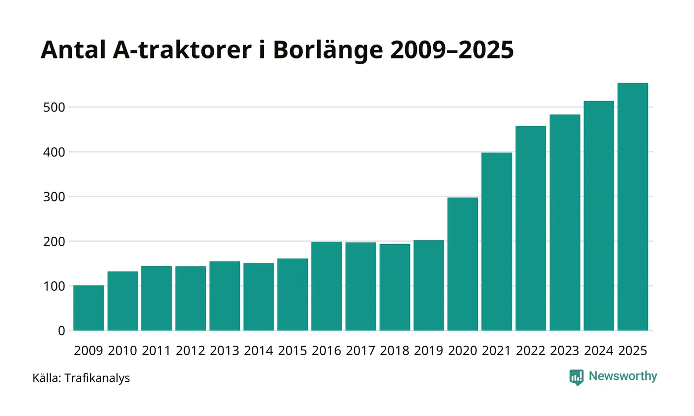 För sjunde året i rad ökar antalet A-traktorer i Borlänge kommun, visar nya siffror från Trafikanalys. I slutet av 2025 fanns 554 A-traktorer registrerade i kommunen, vilket är 40 mer än året innan – en ökning med 8 procent. Inte sedan åtminstone 2009, som är det första året vi har statistik för, har det funnits så många A-traktorer i kommunen.