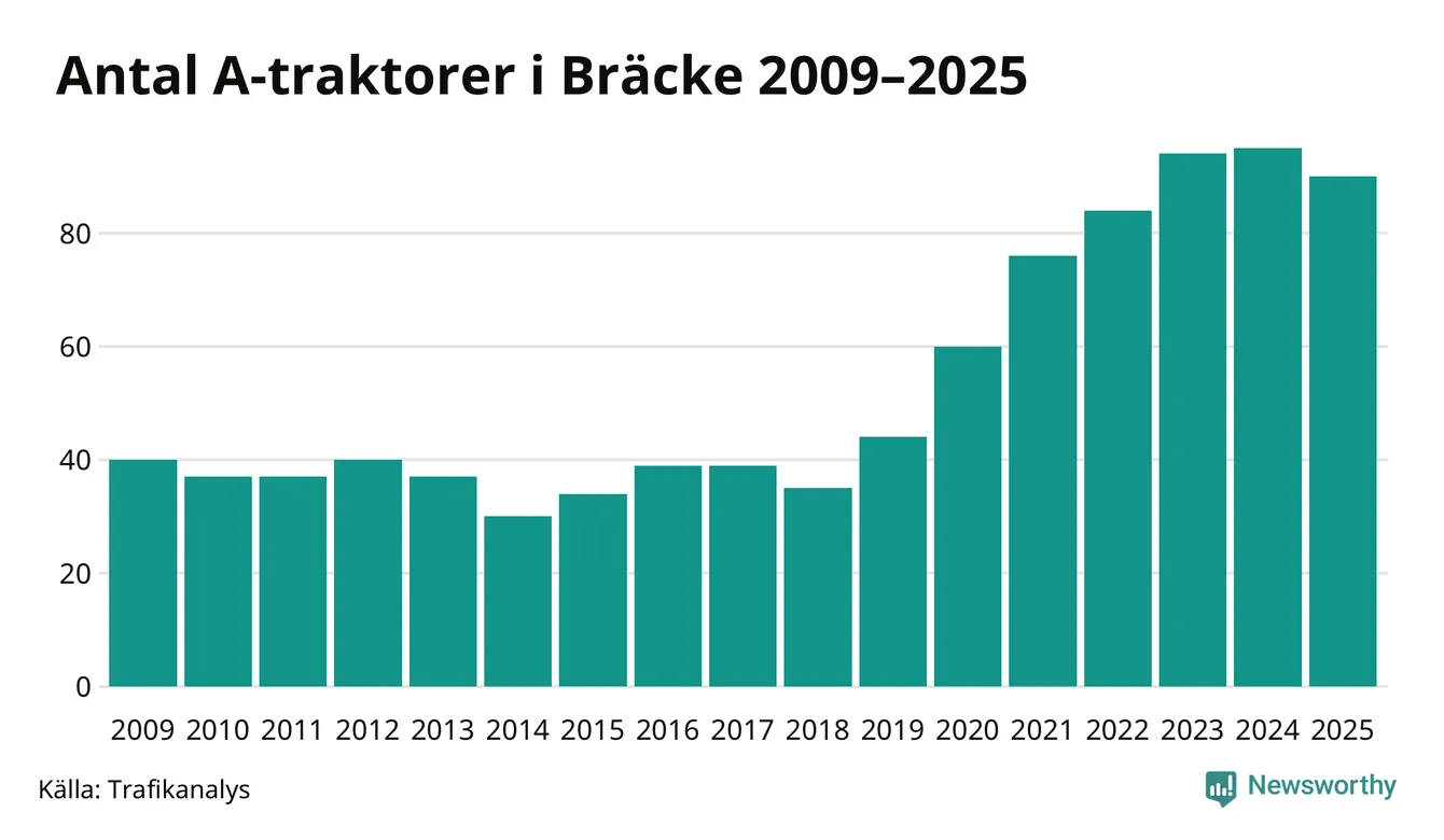 Under det senaste decenniet har antalet A-traktorer femdubblats i Sverige, och under 2025 fortsatte utvecklingen. Men i Bräcke kommun blev A-traktorerna färre. Det är första gången sedan 2018 som antalet inte ökar.