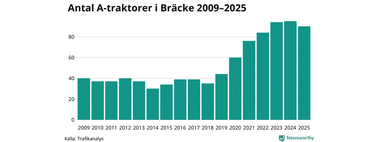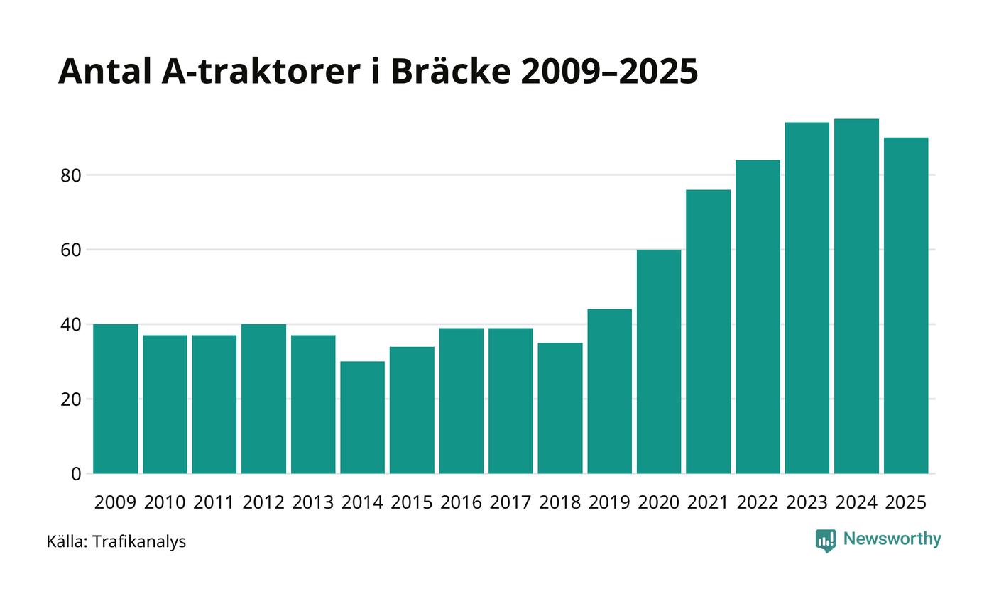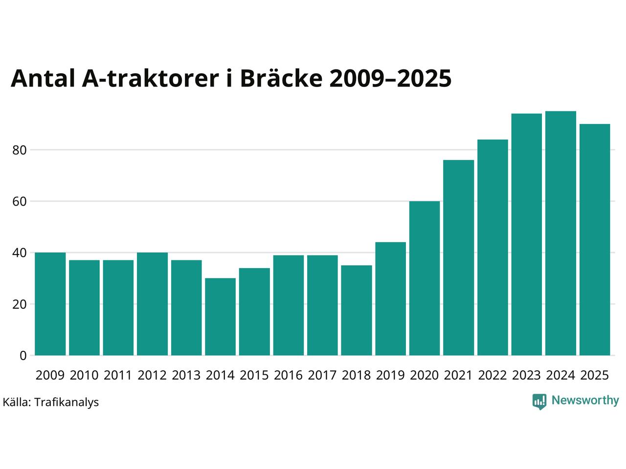 I slutet av 2025 fanns 90 A-traktorer registrerade i Bräcke kommun, vilket är fem mindre än året innan. Det visar nya siffror från Trafikanalys. Det är första gången sedan 2018 som antalet A-traktorer inte ökar i kommunen.